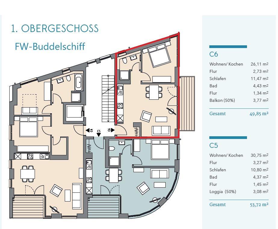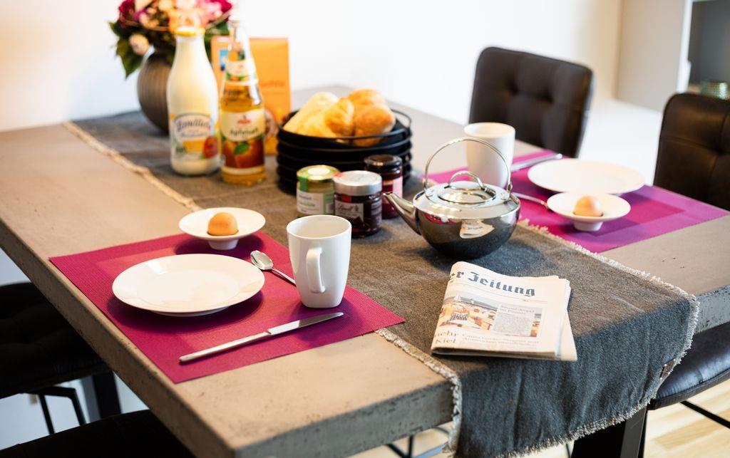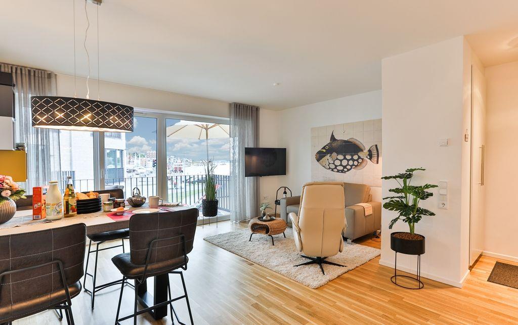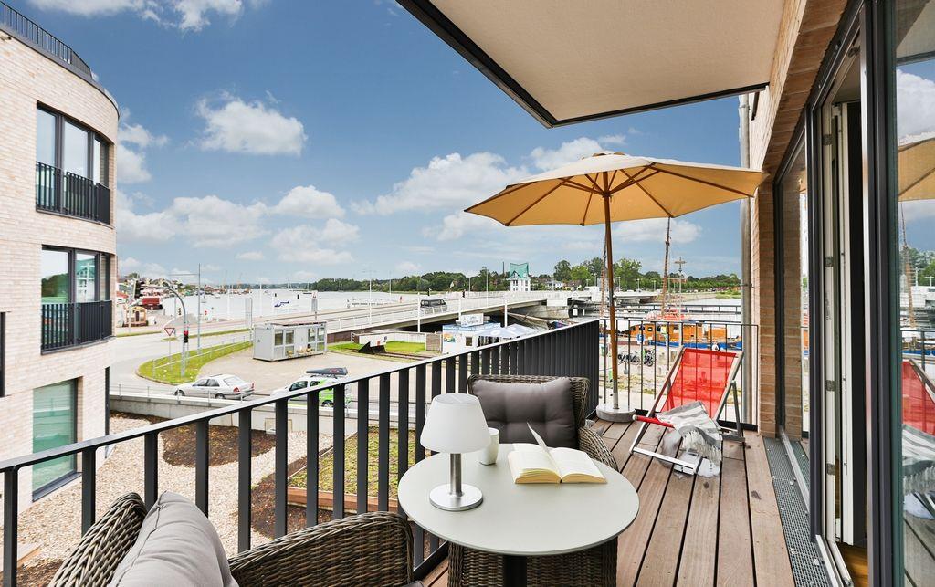 Komfortable Ferienwohnung Buddelschiff mit Balkon und Seeblick am Südhafen von Kappeln.