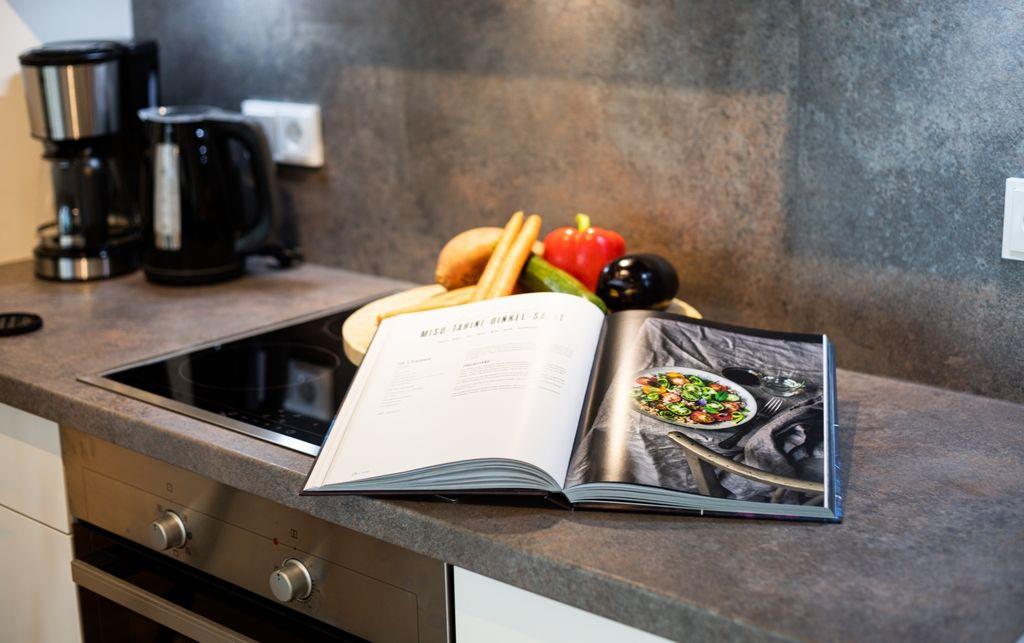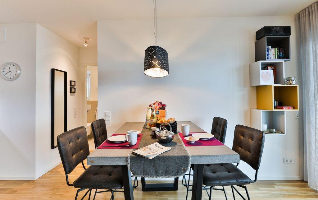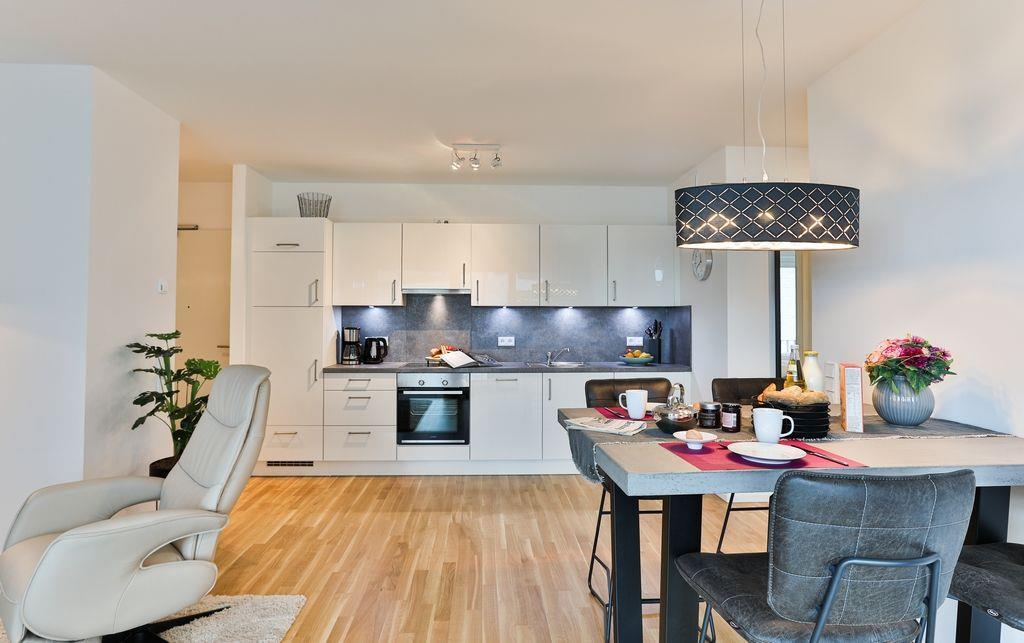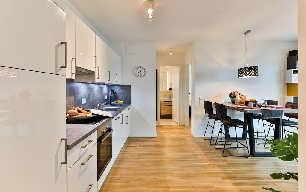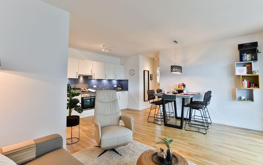Durch den Eingang der Wohnung kommt man über den Flur direkt in den hellen und geräumigen Wohn-/Essbereich, welcher mit einer modernen Einbauküche, einem Esstisch und einer Sofagarnitur für entspannte Stunden ausgestattet ist. Außerdem ist der Balkon über den Wohn-/Essbereich erreichbar. Dieser ist mit Gartenmöbeln, einem Sonnenschirm und einem Elektrogrill bestückt.