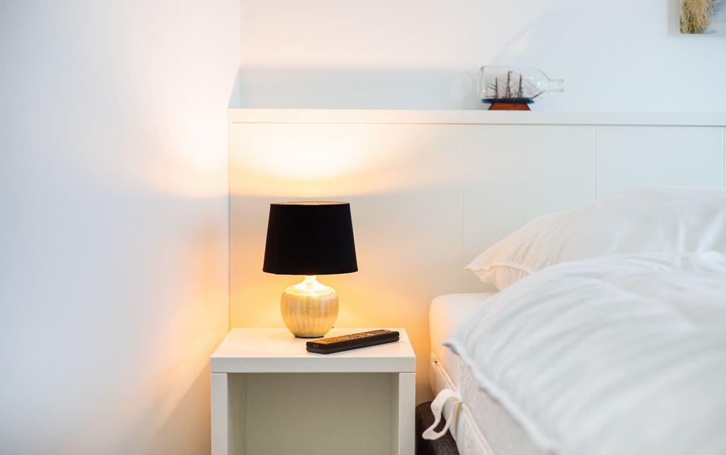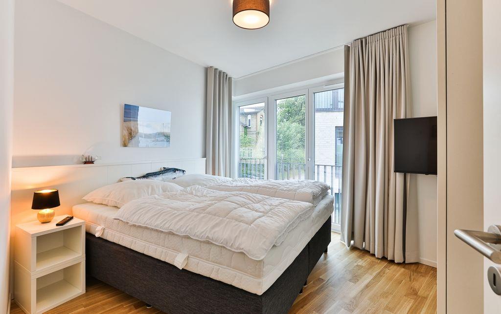 Angrenzend an den Wohn-/Essbereich liegt das gemütlich eingerichtete Schlafzimmer, welches mit einem Boxspringbett der Größe 180x200cm, einem Kleiderschrank und einem zusätzlichen Fernsehgerät ausgestattet ist.