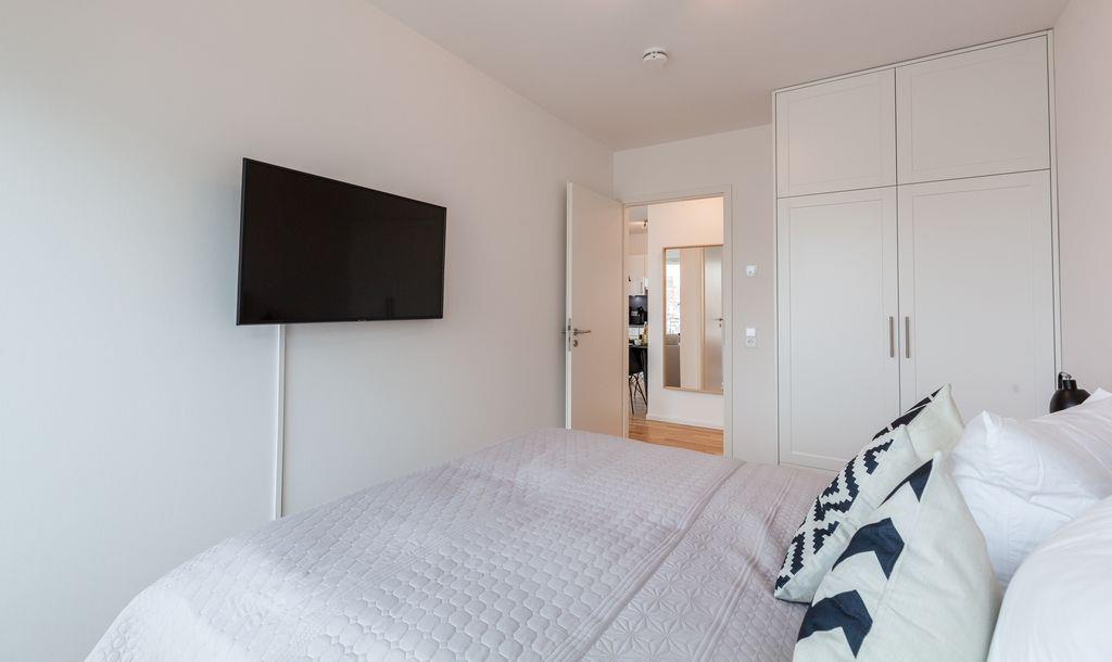 Das Schlafzimmer bietet ein Doppelbett der Größe 2x 80x200 cm. Zusätzlich verfügt es über einen Kleiderschrank und ein Fernsehgerät.