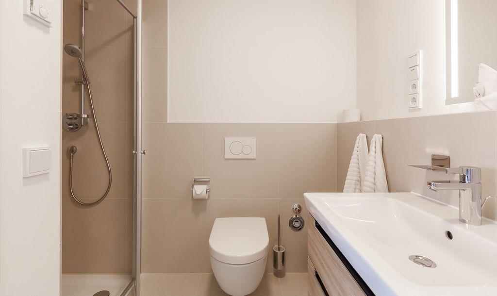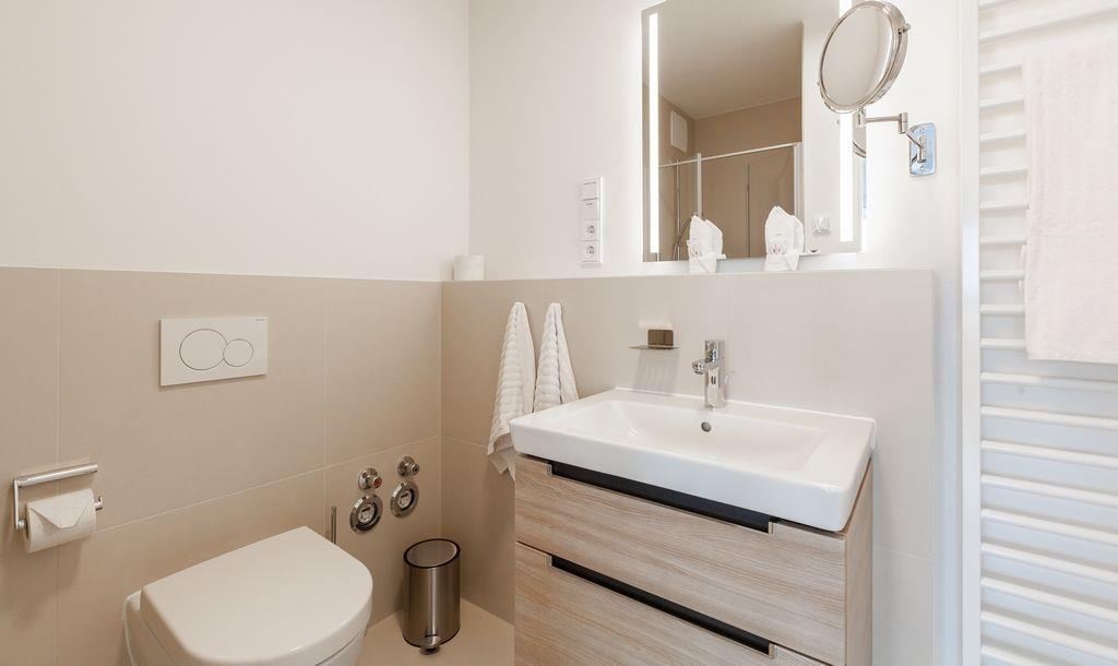 Das moderne Badezimmer ist mit einer ebenerdigen Dusche ausgestattet.