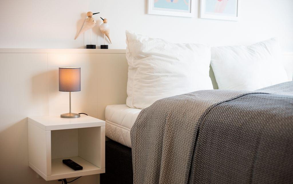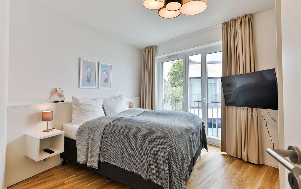 Angrenzend an den Wohn-/ Essbereich liegt das Schlafzimmer der Wohnung, welches mit einem Doppelbett der Größe 180x200 cm, einem Kleiderschrank und einem zusätzlichen Fernsehgerät ausgestattet ist.