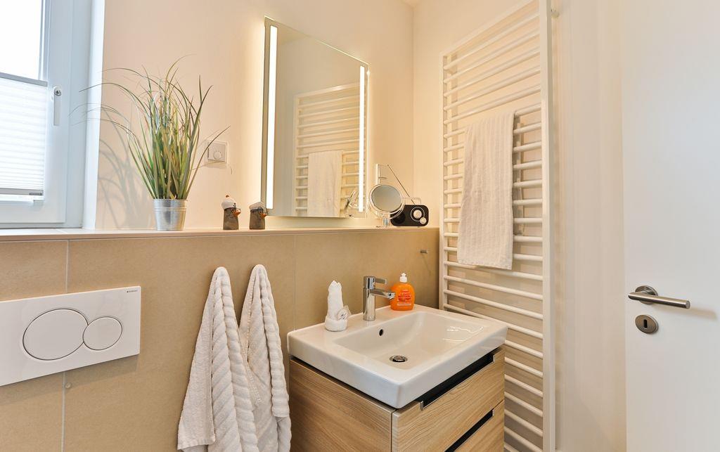 Gegenüber befindet sich das Tageslichtbadezimmer mit ebenerdiger Dusche und vielen weiteren modernen Ausstattungen.