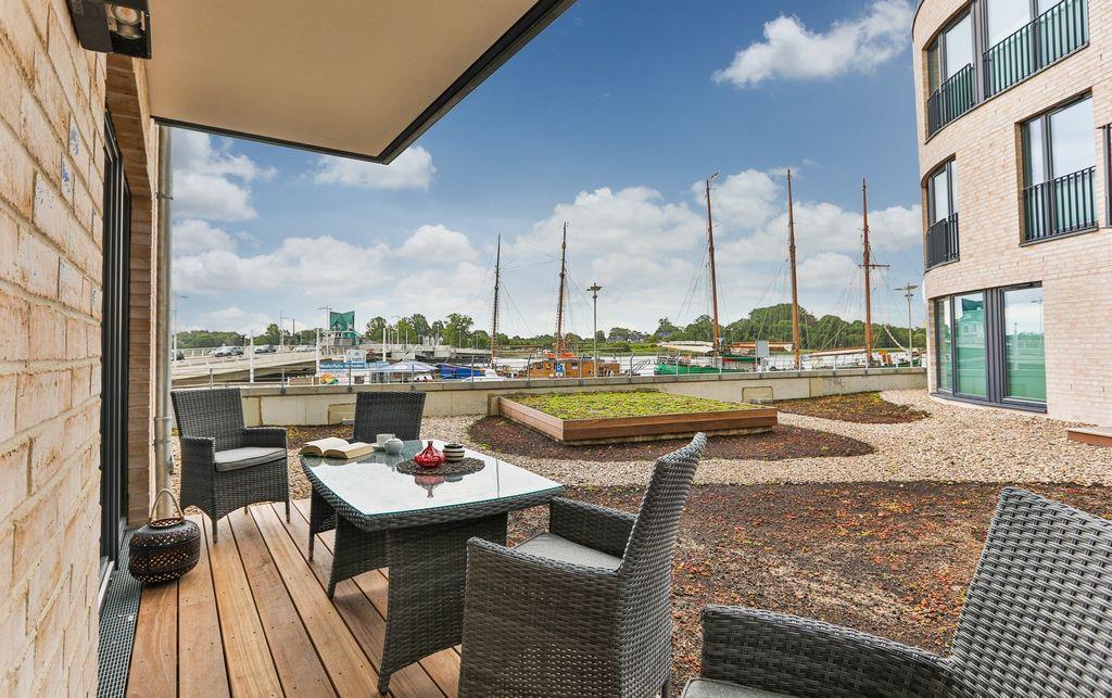 Charmante Ferienwohnung Fernweh mit Seeblick am Südhafen von Kappeln, ideal für entspannte Tage mit Terrasse und modernem Komfort.