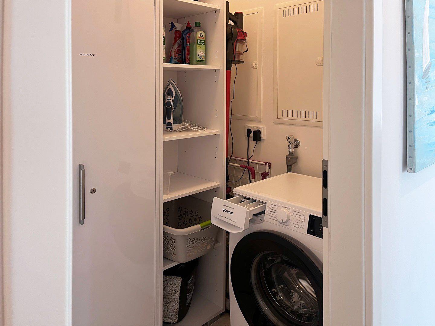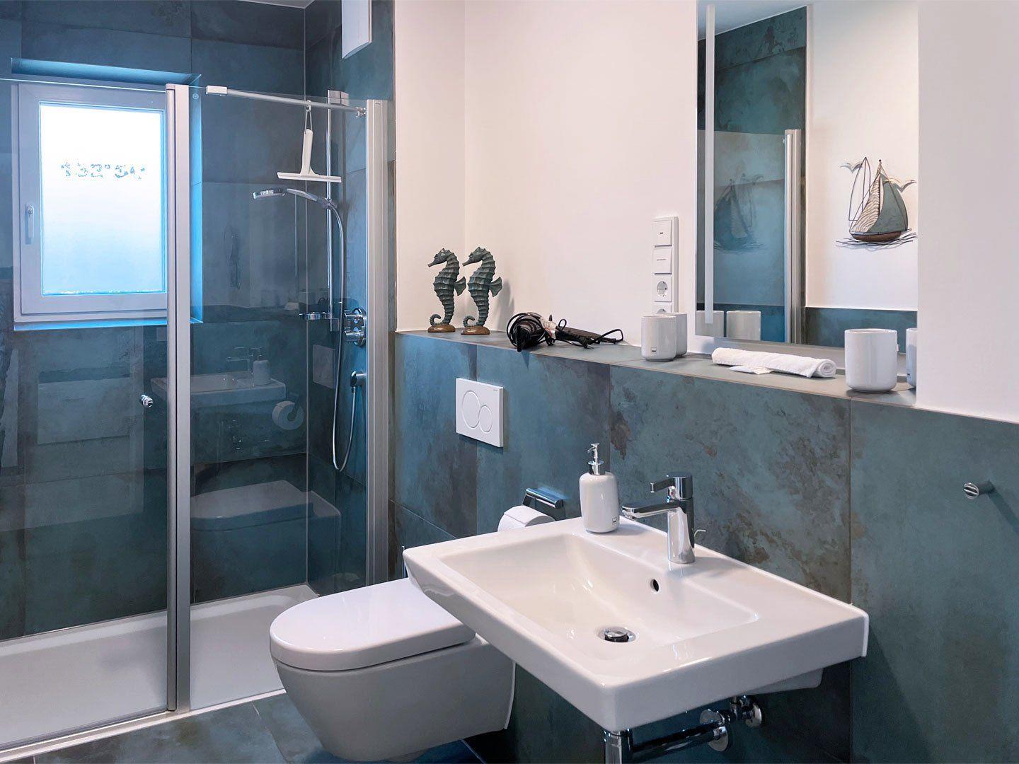 Das Tageslichtbadezimmer ist mit einer ebenerdigen Dusche versehen. Eine Waschmaschine ist in der Wohnung vorhanden.