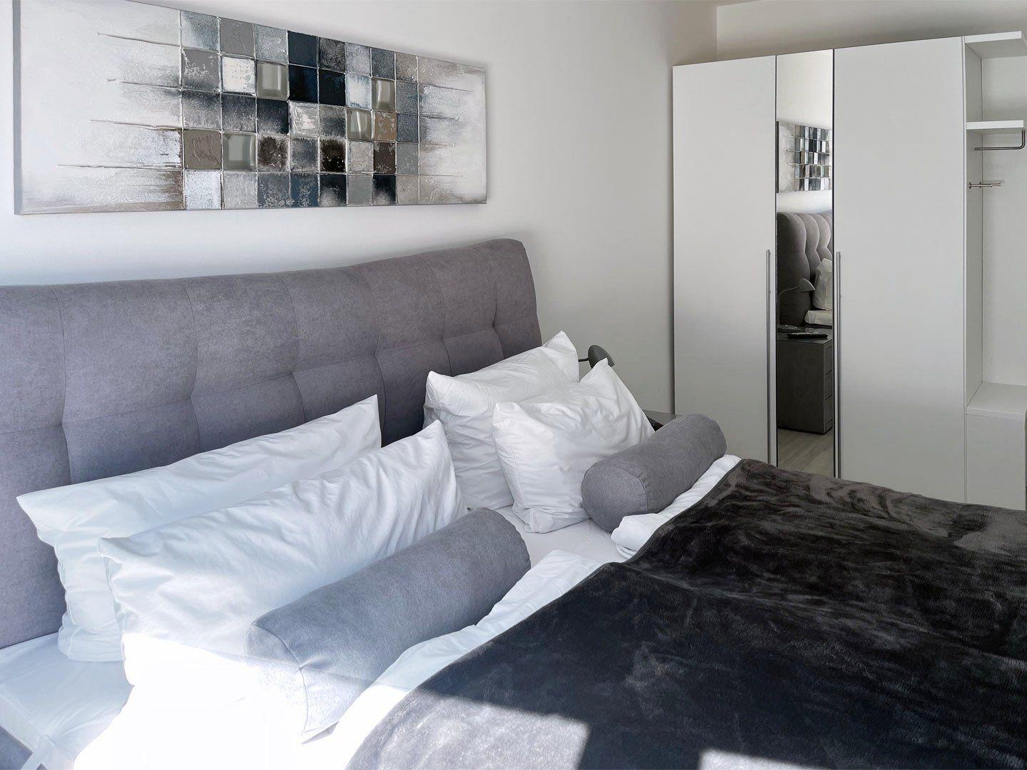 Als Schlafmöglichkeiten dienen ein Boxspringbett (180x200 cm) und im zweiten Schlafzimmer ein Einzelbett (100x200 cm) und ein Schrankbett (90x200 cm).