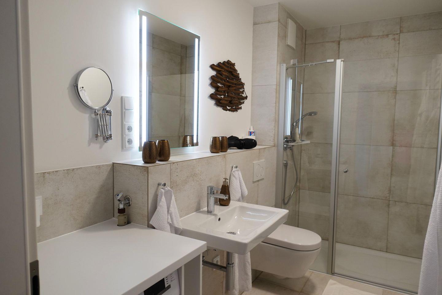 Das Badezimmer ist mit einer ebenerdigen Dusche und einer Waschmaschine ausgestattet.