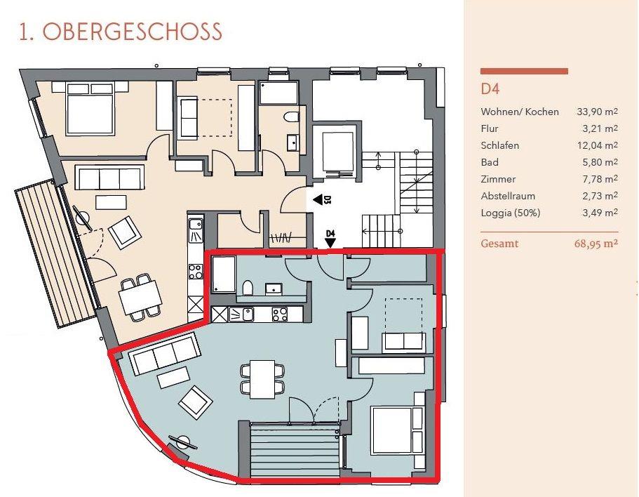 Die 69qm Wohnung liegt im 1. Obergeschoss des Hauses und besteht aus drei Zimmern: