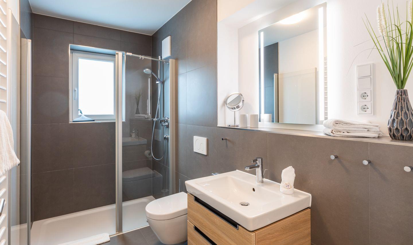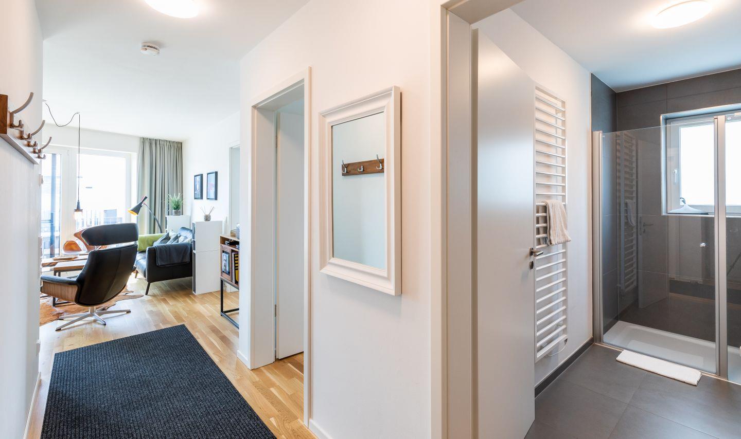 Darüber hinaus bietet die Wohnung ein elegant eingerichtetes Tageslichtbadezimmer mit ebenerdiger Dusche und weiteren modernen Ausstattungen.