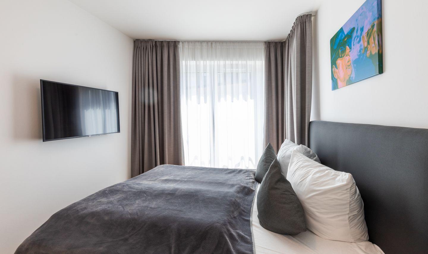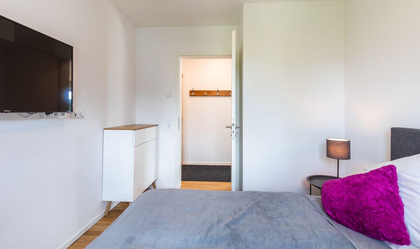 Angrenzend an den Wohn-/ Essbereich liegen die beiden Schlafzimmer der Wohnung. Das Hauptschlafzimmer ist mit einem Doppelbett der Größe 180x200 cm, einem Kleiderschrank und einem Fernsehgerät ausgestattet. Das zweite Schlafzimmer ist mit einem Einzelbett der Größe 140x200 cm versehen.