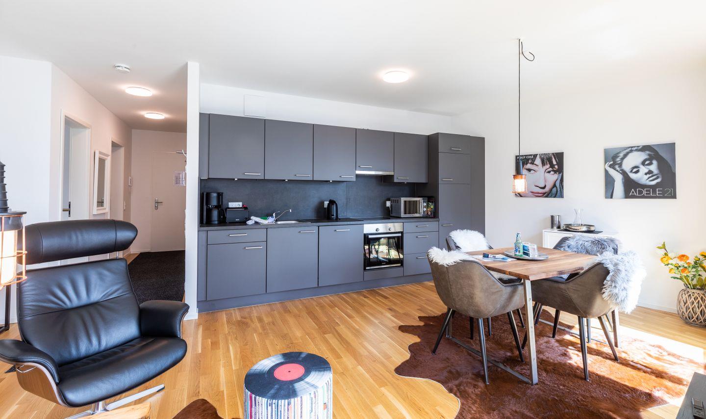 Durch einen kleinen Flur gelangt man in den weitläufigen und modern eingerichteten Wohn-/ Essbereich, welcher mit einer Einbauküche, einem Esstisch und einer Sofagarnitur ausgestattet ist. Zudem befindet sich hier der Zugang zum Balkon. Dieser ist mit Gartenmöbeln und einem Elektrogrill für sonnige Stunden bestückt.