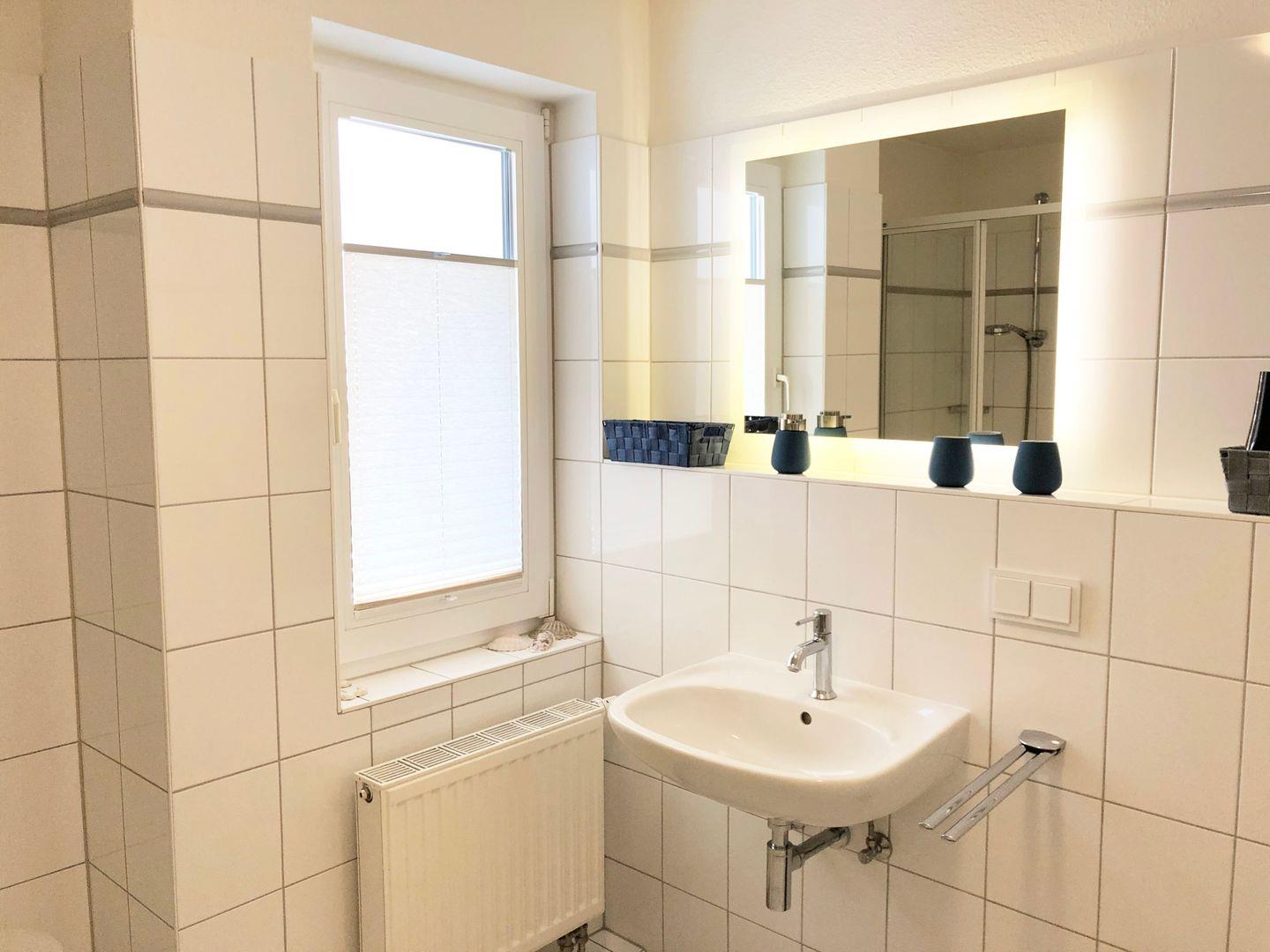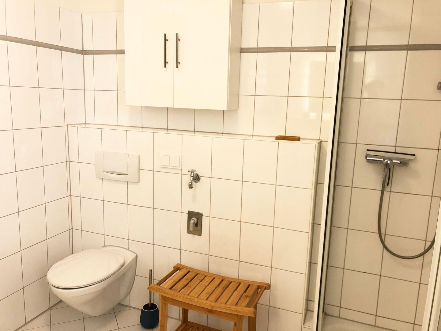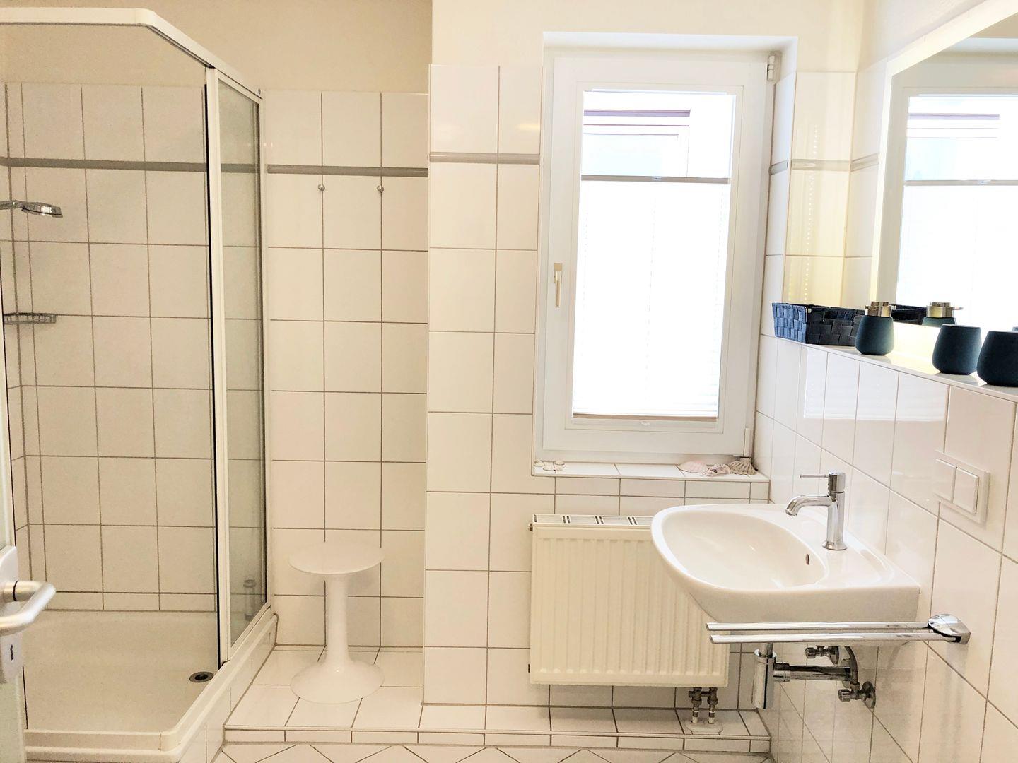 Angrenzend befindet sich das Tageslichtbadezimmer mit Dusche, Waschbecken und WC.
