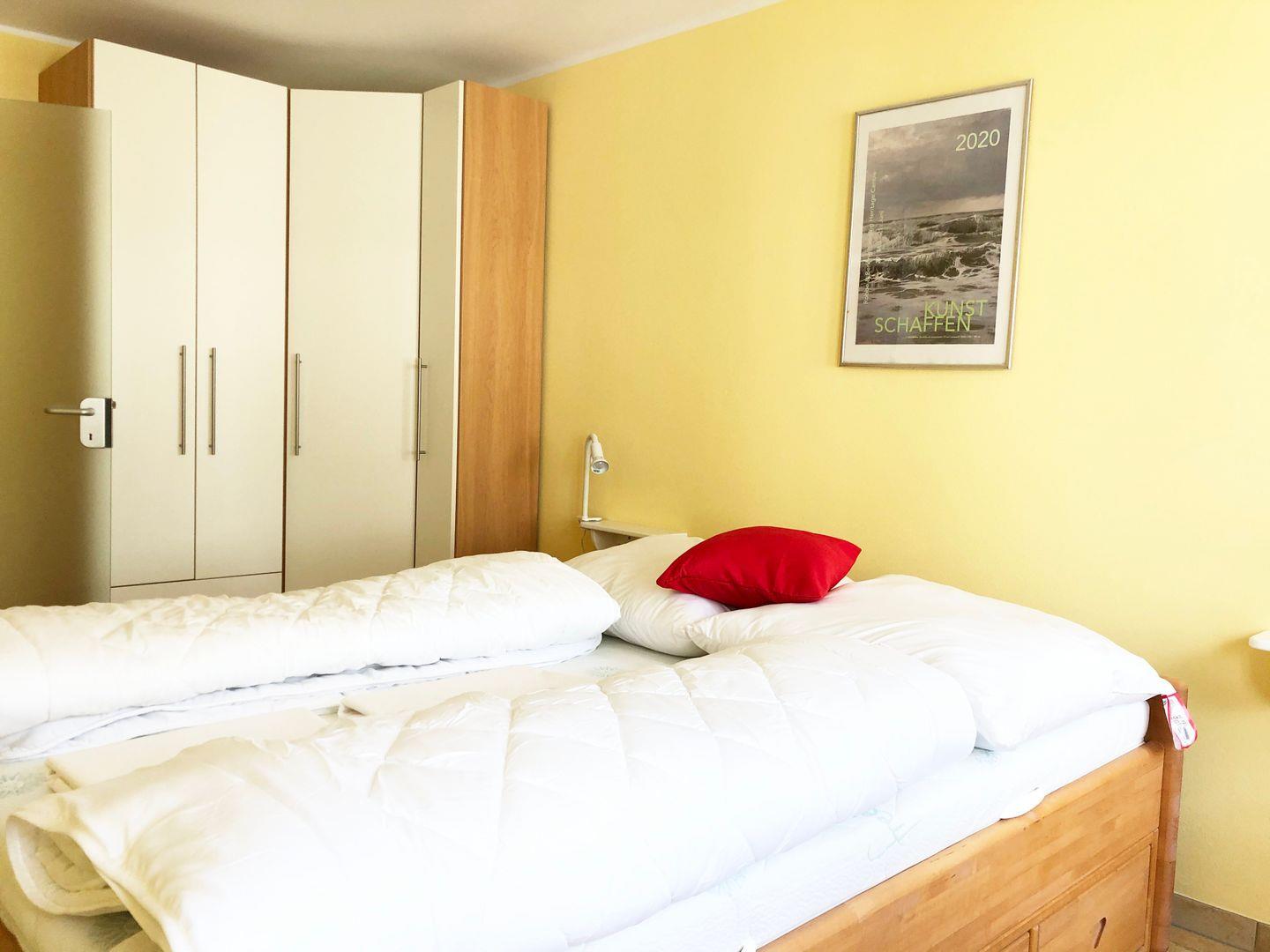 Das Schlafzimmer ist mit einem Doppelbett (verstellbarer Lattenrost) der Größe 2x 80x200 cm und einem Kleiderschrank ausgestattet.
