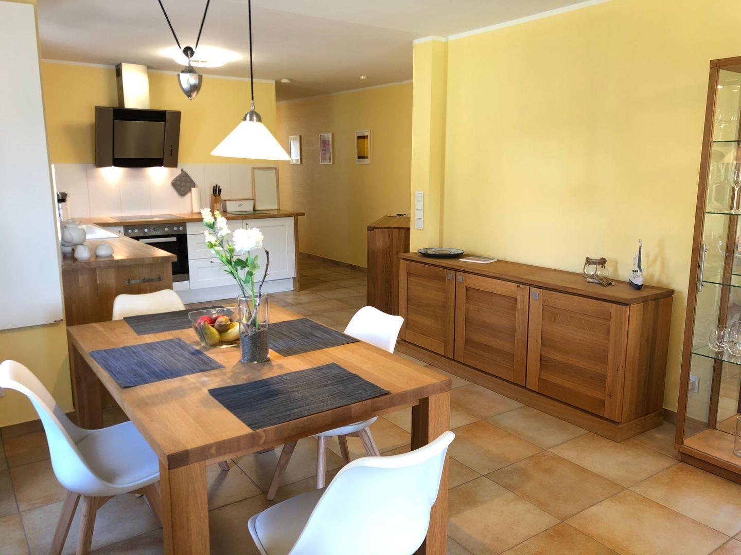 Am Ende des langen Flurs erreicht man den offenen Wohn-/ Essbereich, welcher hell und freundlich eingerichtet ist.