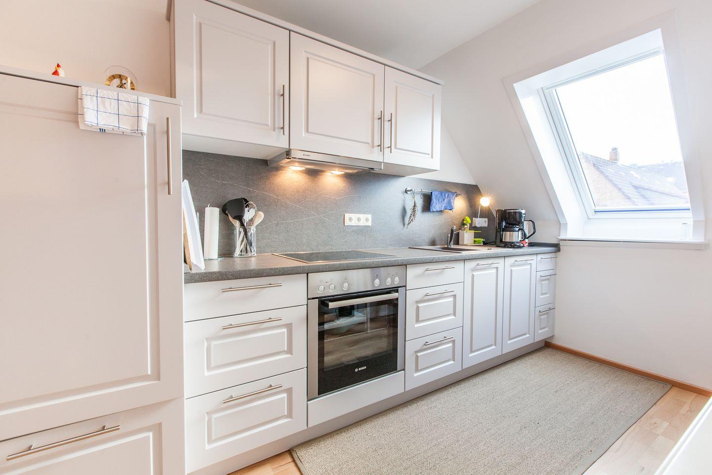 Der Flur/ Eingangsbereich ist mit einer Küchenzeile ausgestattet, die u.a. mit Geschirrspüler und Gefrierfach keine Wünsche offen lässt.