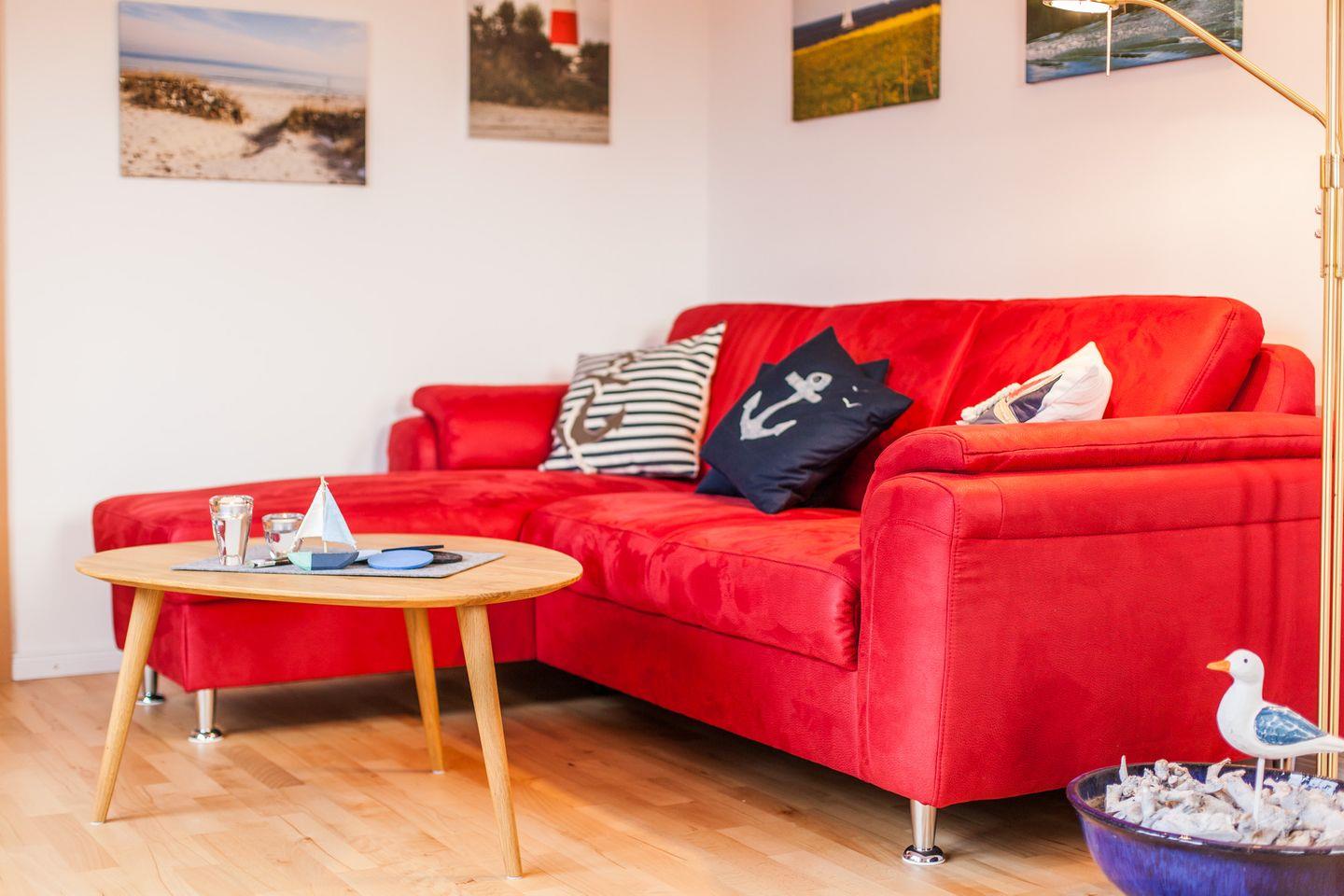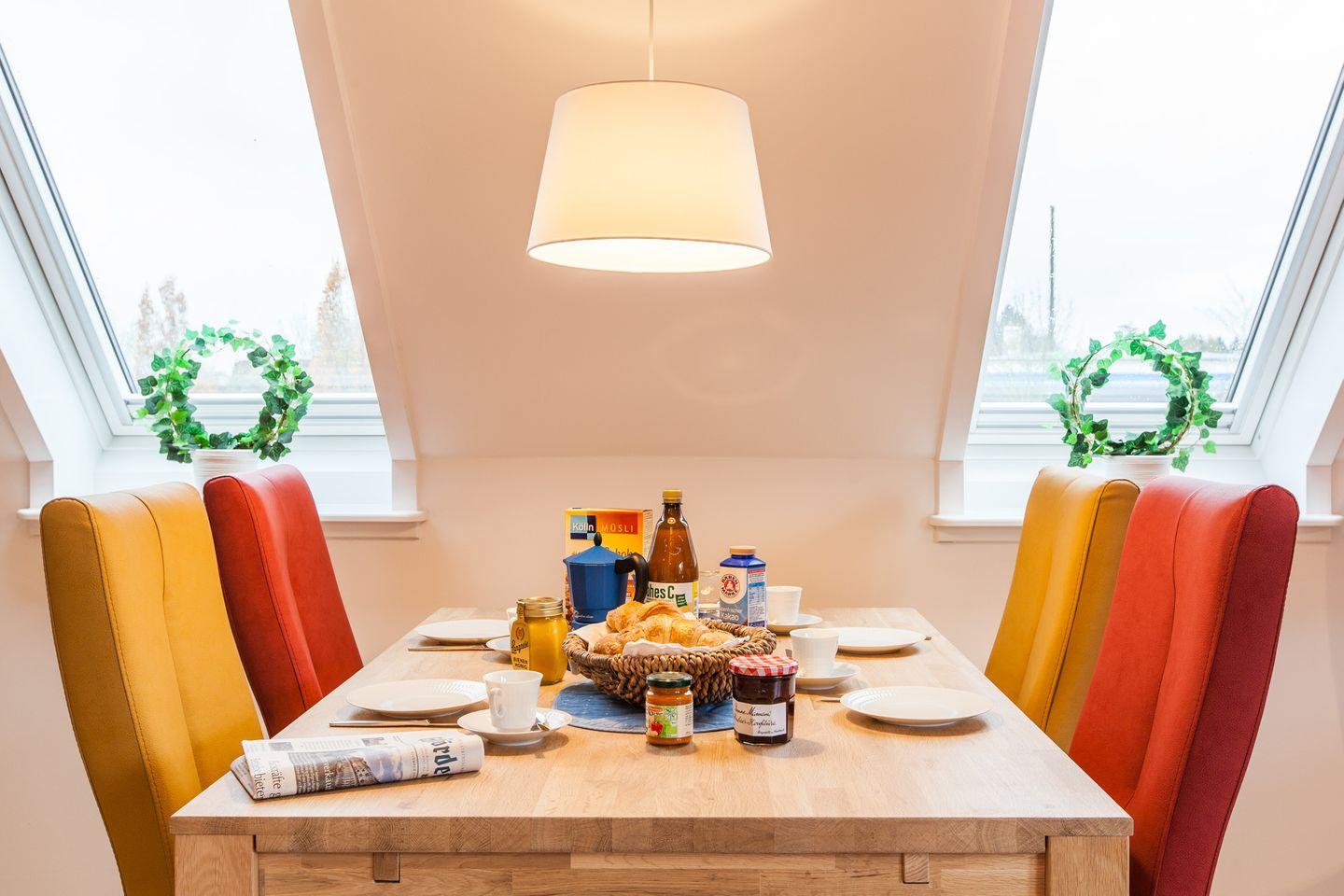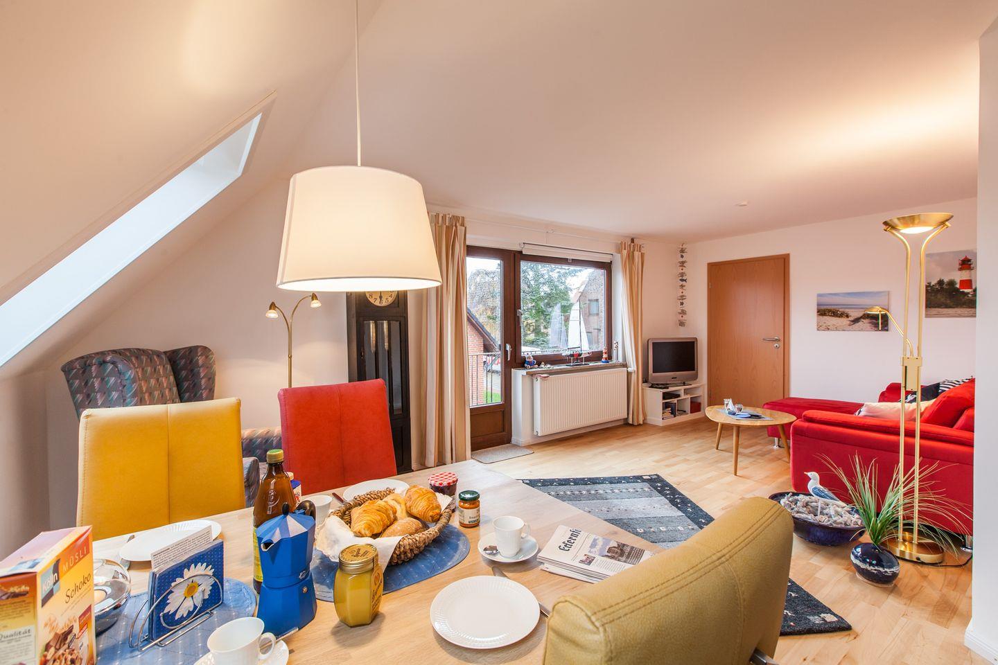 Das großzügige Wohn-/ Esszimmer ist mit liebevollen Details eingerichtet; von hier gelangen Sie auf den West-Balkon mit Balkonmöbeln.