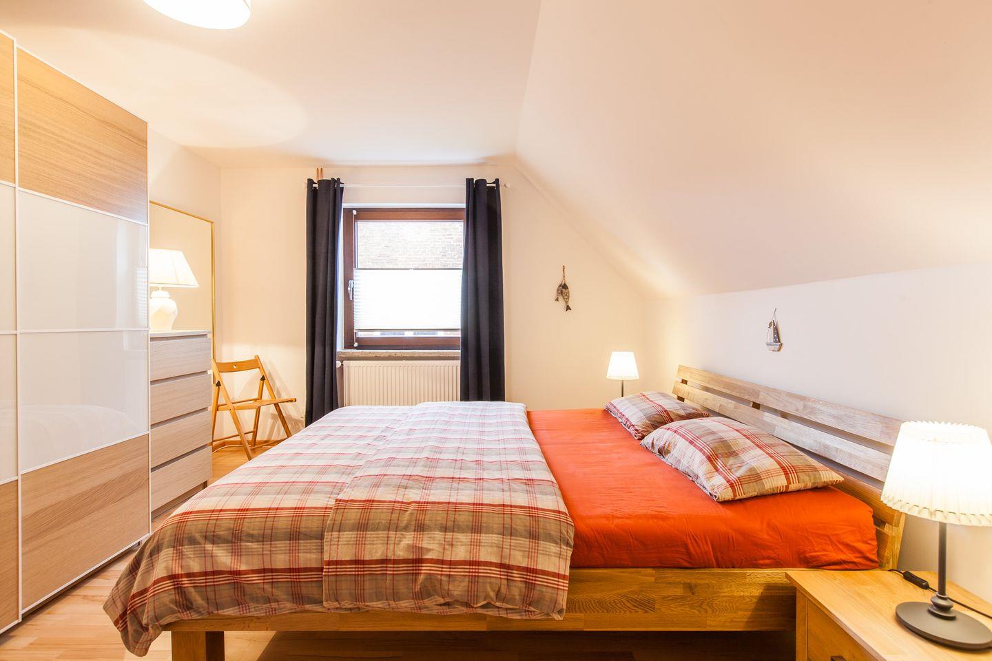 Im Doppelschlafzimmer (2x 90x200 cm) gibt es einen Kleiderschrank und ein Fenster mit Verdunkelungsgardinen.