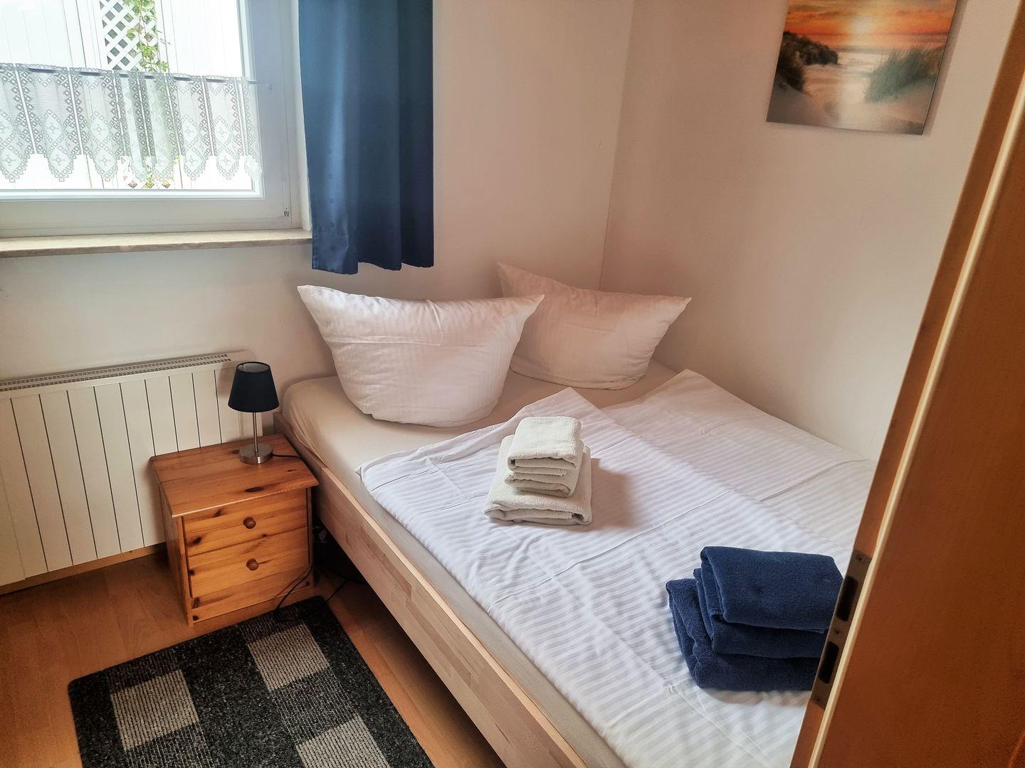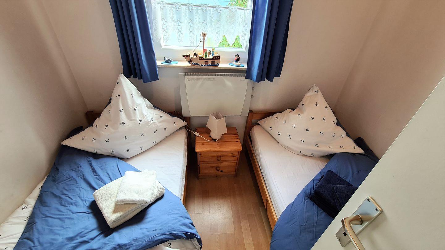 Die beiden, an das Wohnzimmer angrenzenden, Schlafzimmer sind mit einem Doppelbett und zwei Einzelbetten ausgestattet. Ein Babybett kann bei Bedarf aufgestellt werden.