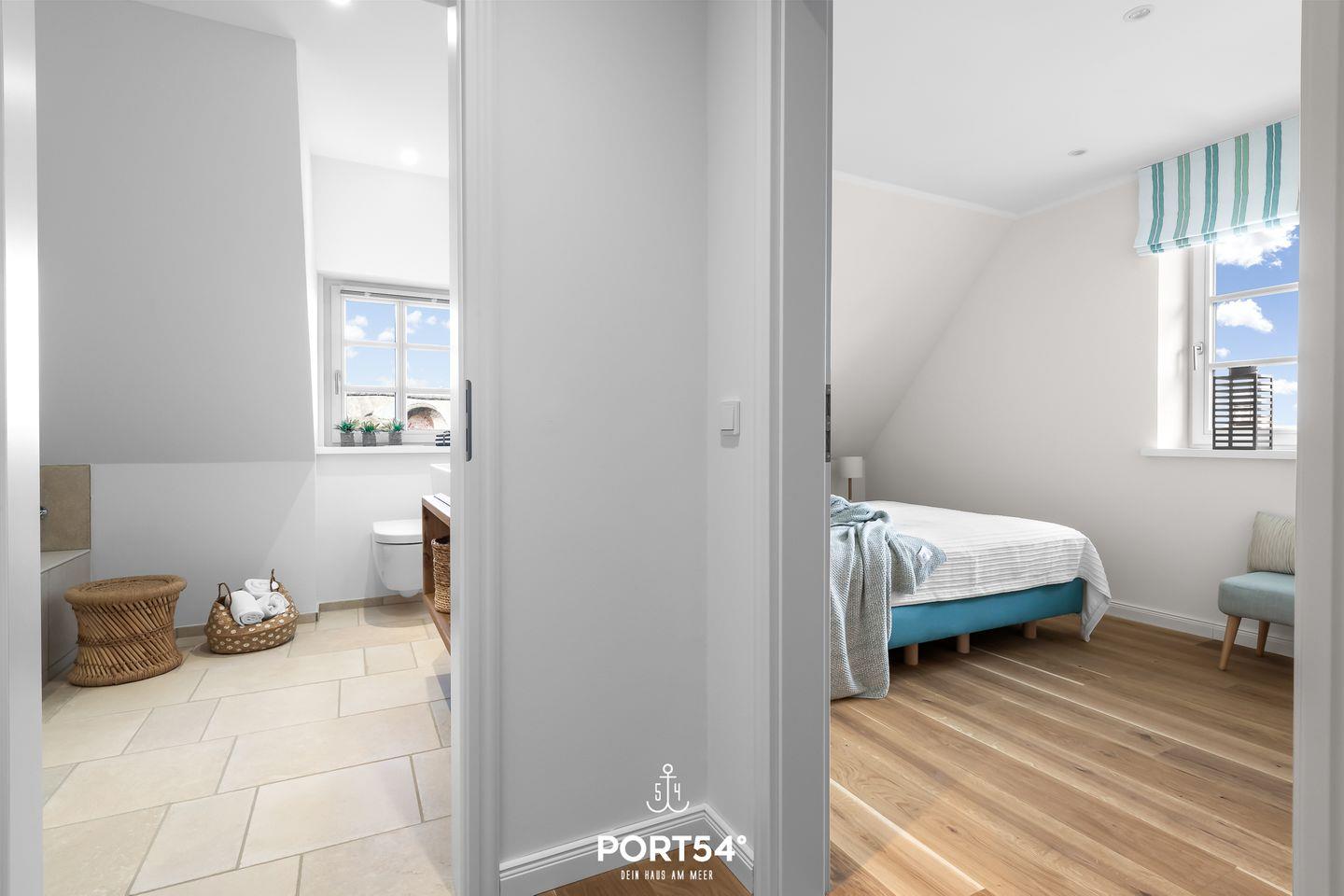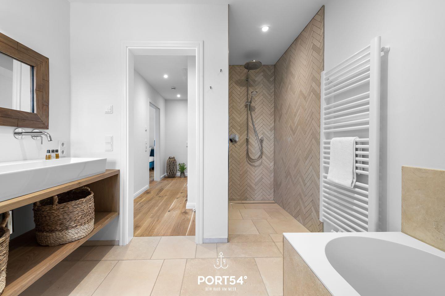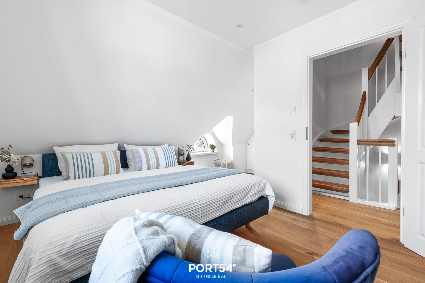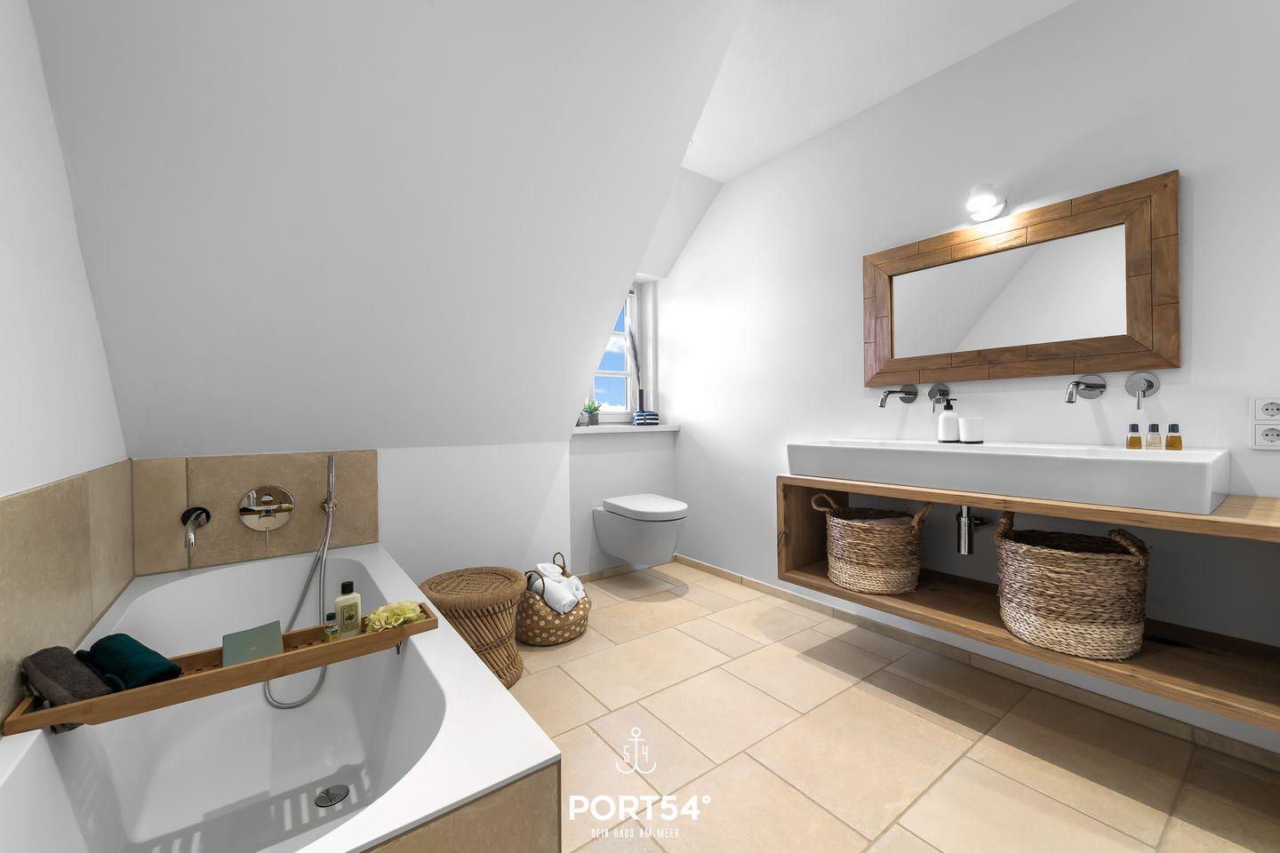 Im ersten Obergeschoss erwarten Dich zwei Schlafzimmer, wovon eins mit einem großen Doppelbett (180x200cm) und das andere mit einem Doppelbett (je 160x200cm) ausgestattet ist. Hier erwartet Dich zudem das Wannenbad mit zusätzlicher ebenerdiger XXL-Dusche.