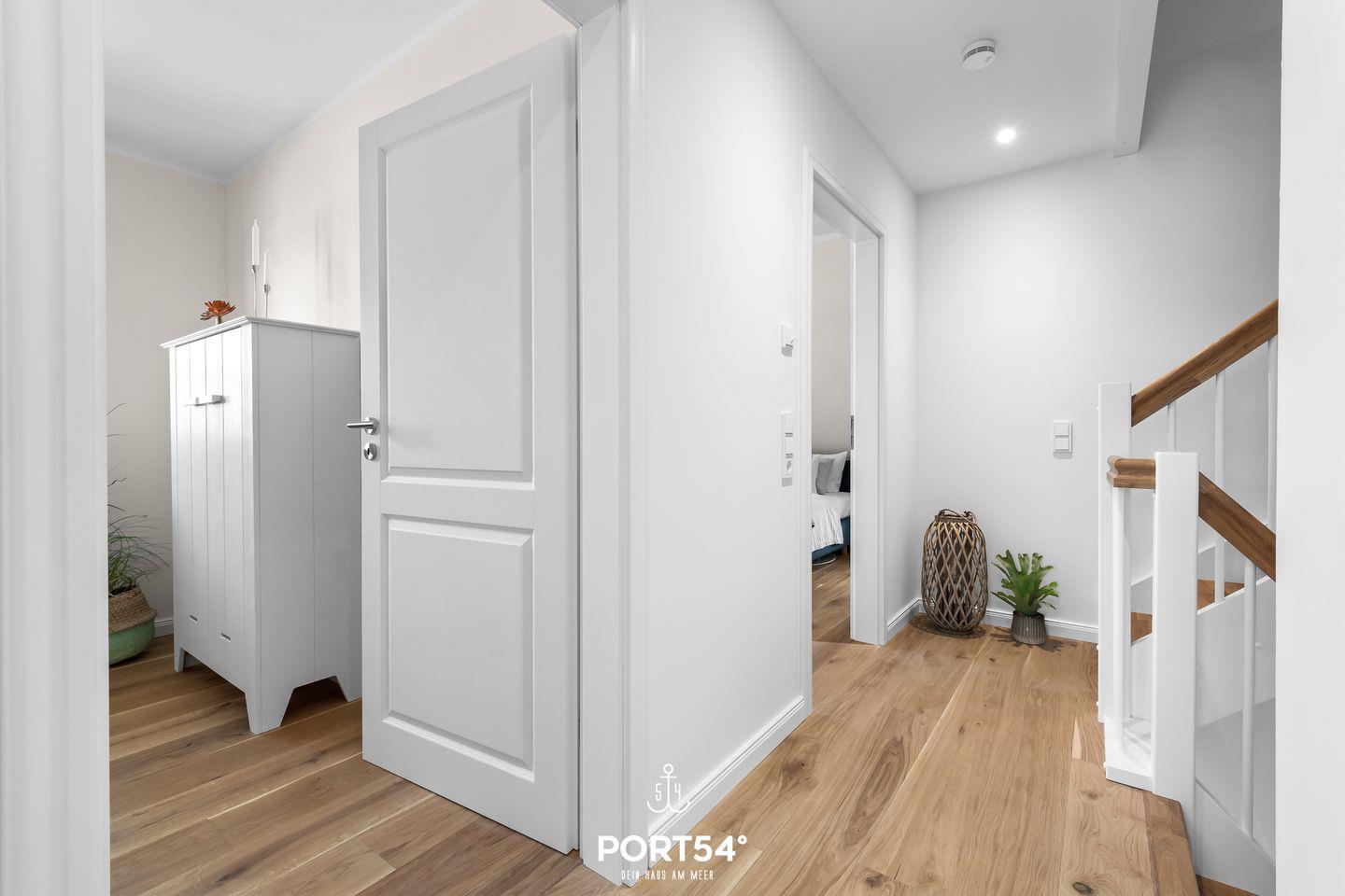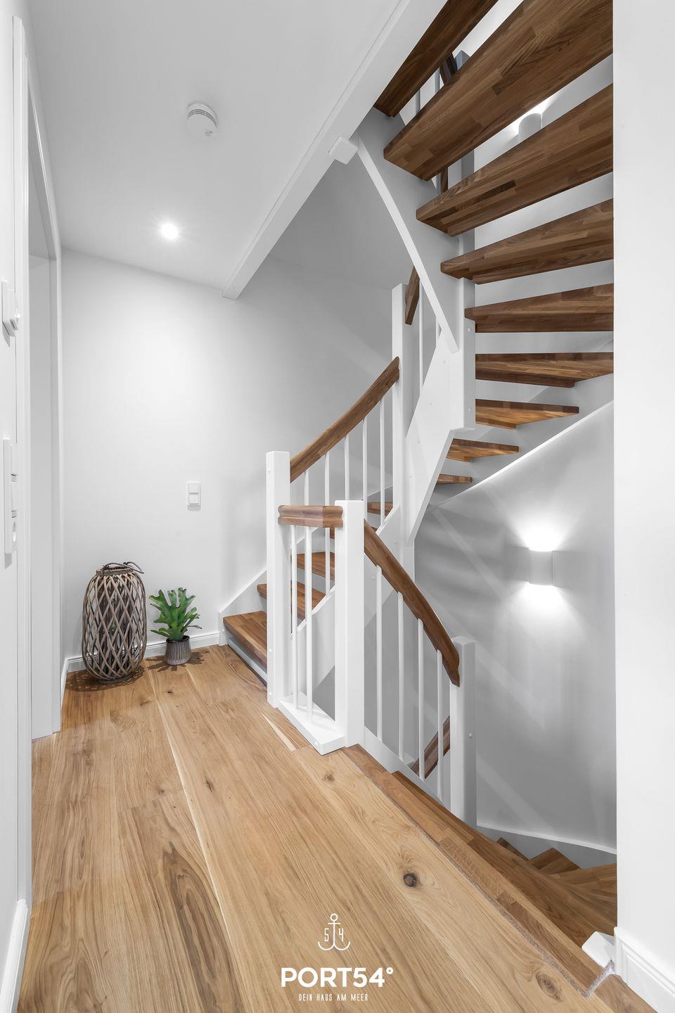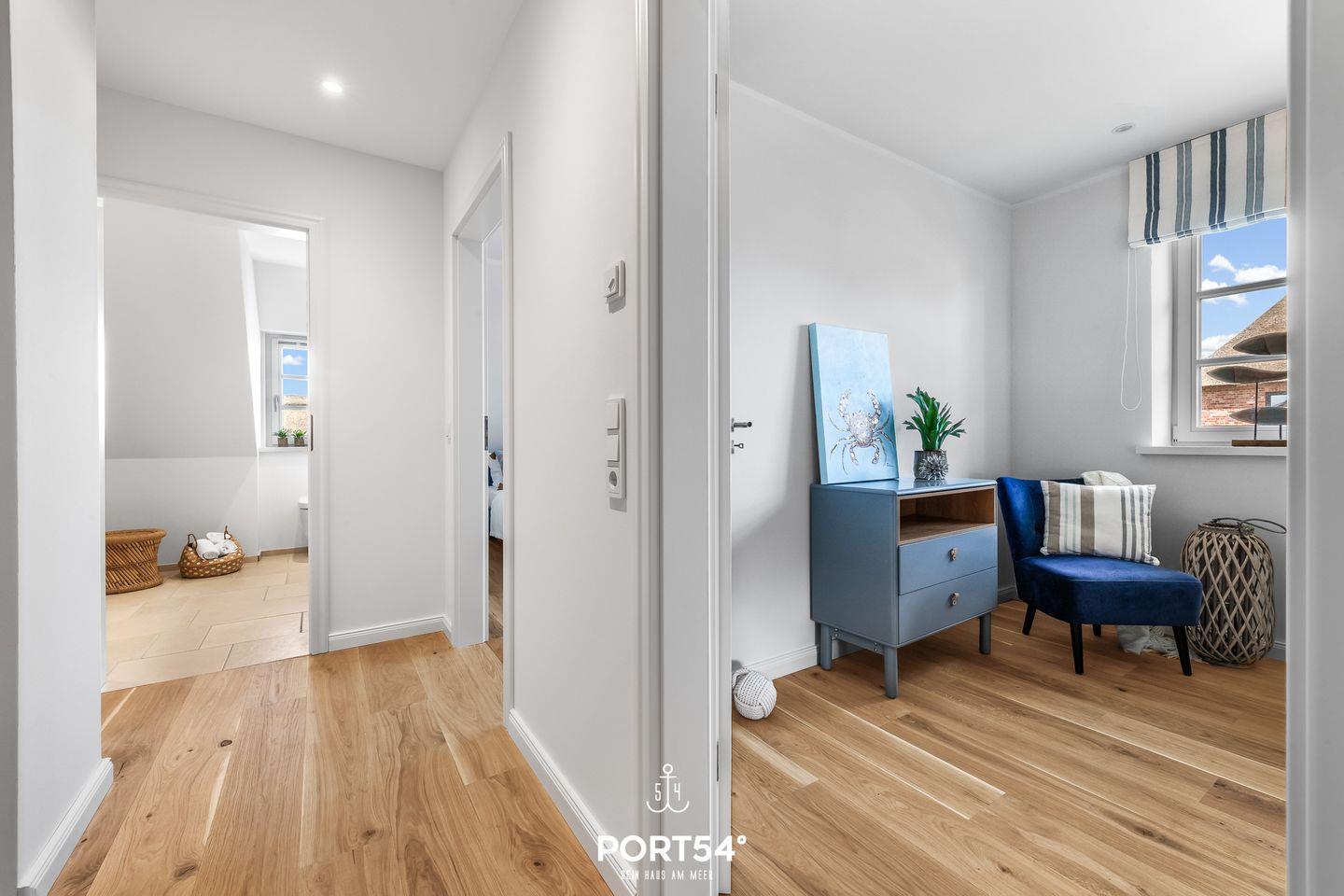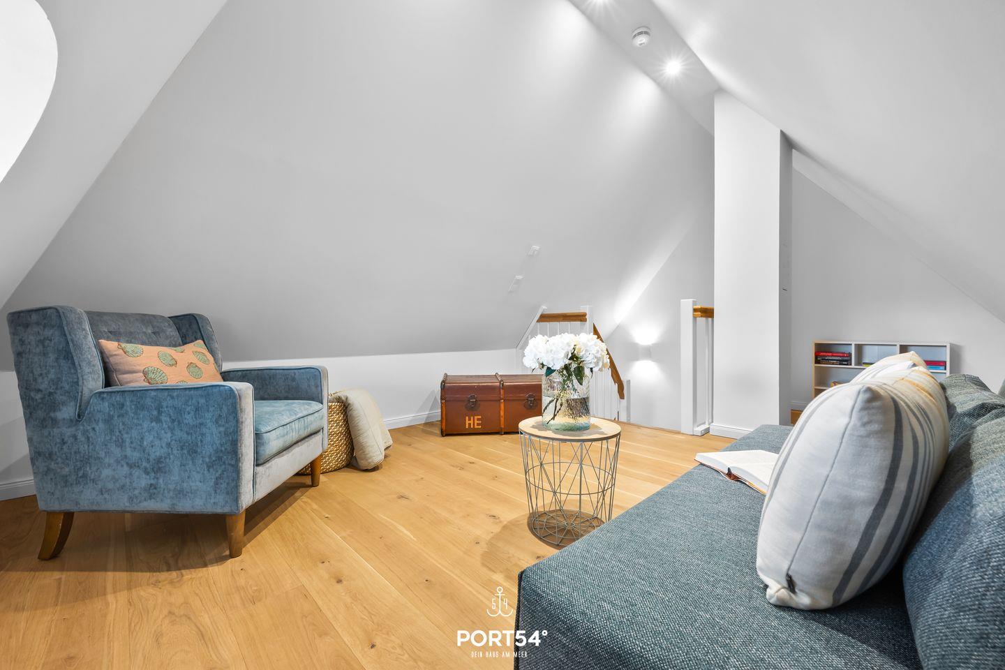 Vom ersten Obergeschoss erreichst Du die Galerie im zweiten Obergeschoss, wo ein gemütlicher Rückzugsort mit Schleiblick geschaffen wurde.