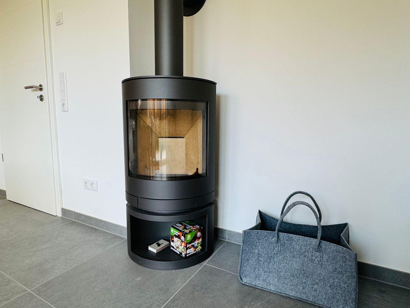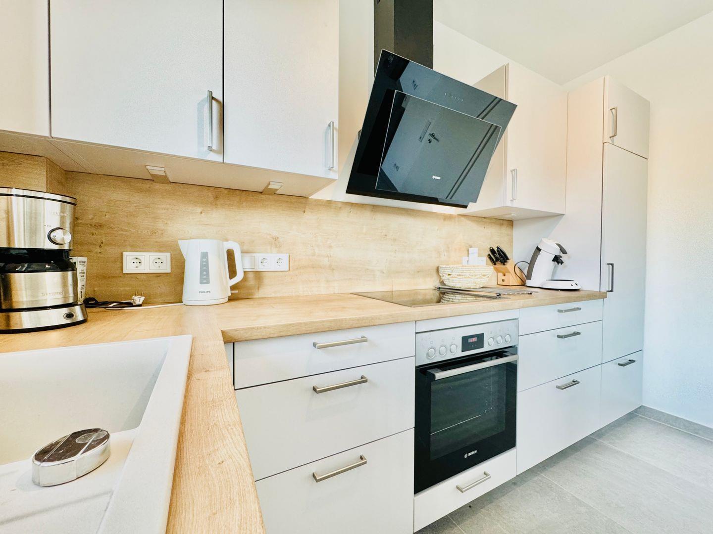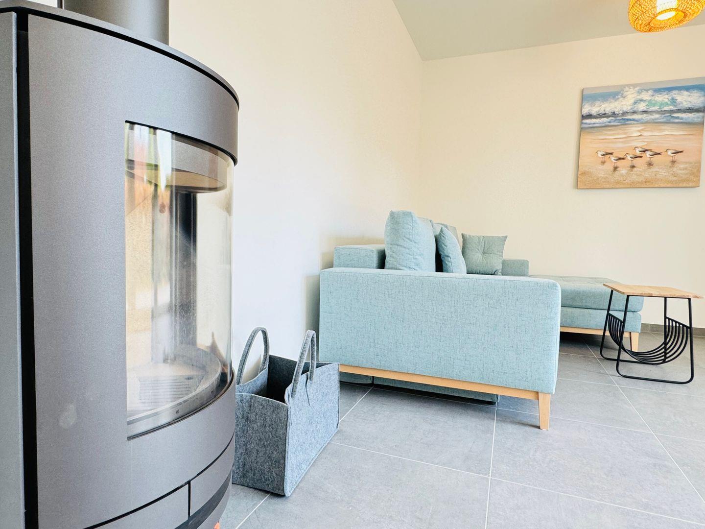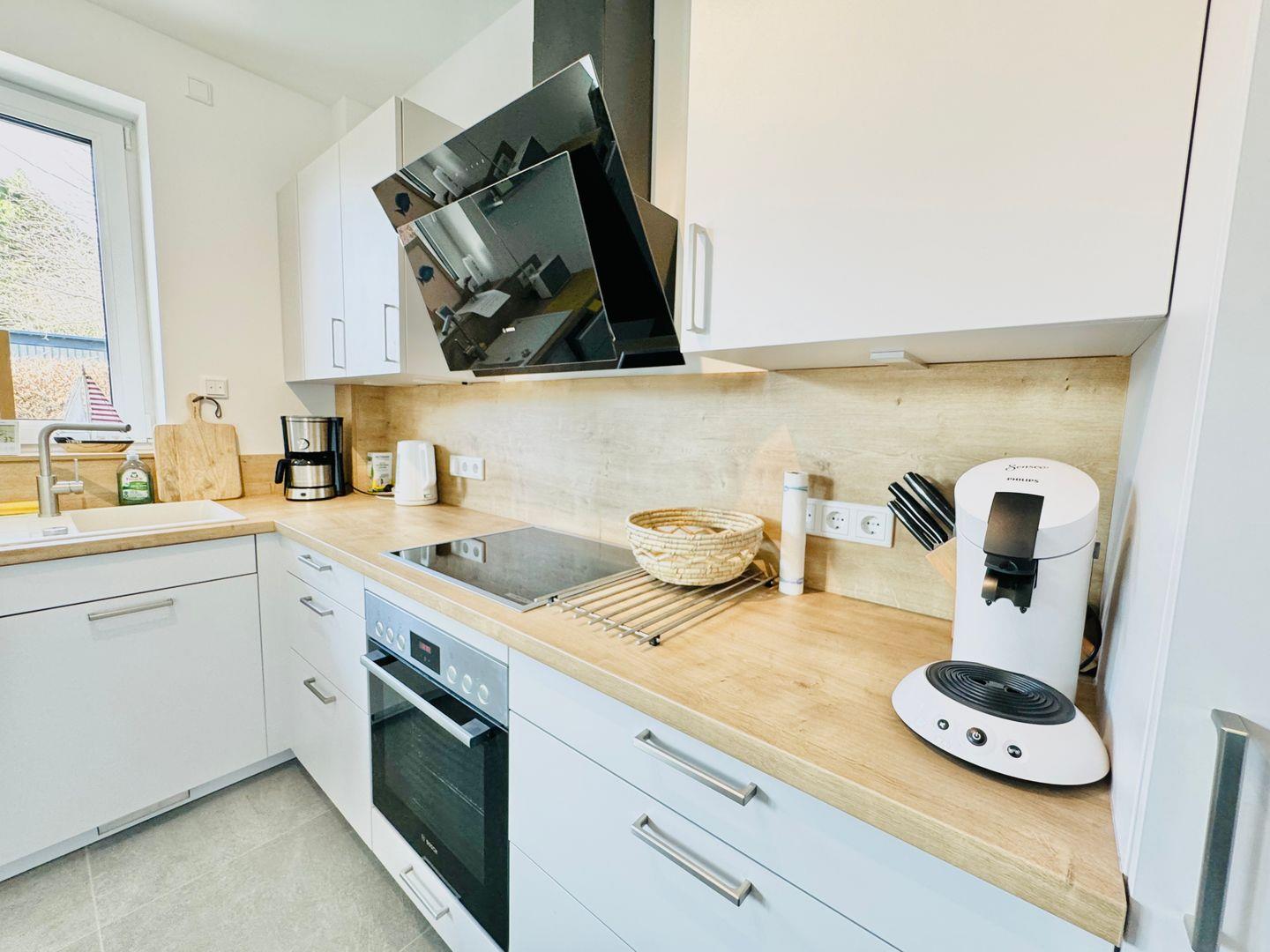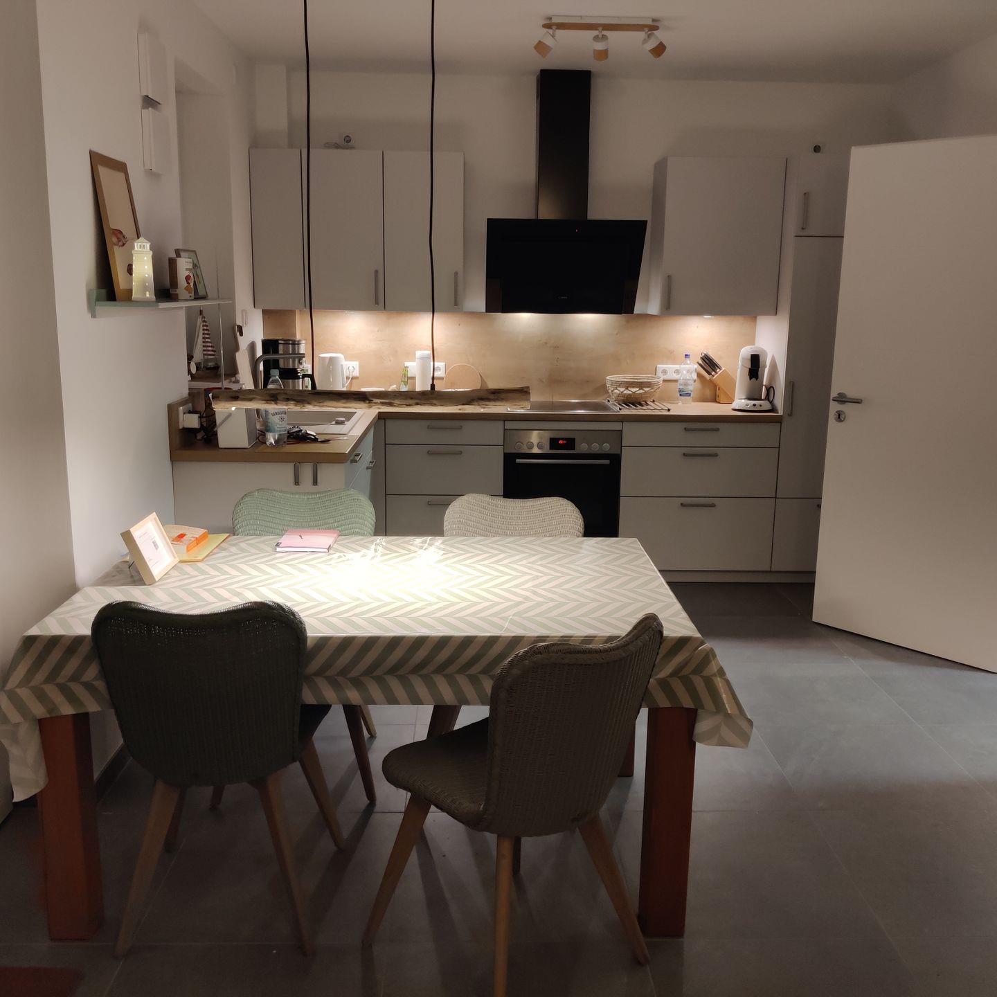 Die offene Küche ist mit Cerankochfeld, Backofen, Kühlschrank, Spülmaschine, Filterkaffeemaschine, Kaffeepadmaschine, Wasserkocher, Toaster, Handrührgerät sowie Geschirr und Besteck ausgestattet. Der Wohn-/Essbereich ist mit einem schönen Holztisch, einem großen Sofa und einem großen Fernseher ausgestattet. An kalten Wintertagen sorgt ein Kaminofen für wohlige Wärme. Im Sommer öffnen sich die Doppelflügeltüren zur eigenen Terrasse und vergrößern so den Hauptwohnraum. Ein eigenes Rasenstück umgibt den Terassenbereich. Vor dem Haus steht den Gästen einer von 4 großzügigen Parkplätzen zur Verfügung.