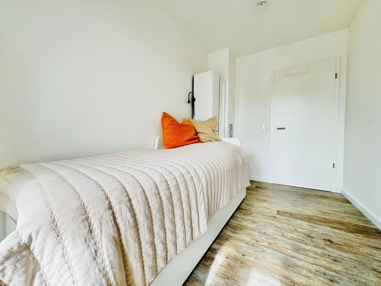 Weitere Ausstattungsmerkmale sind ein Wäscheständer, Ganzkörperspiegel, Staubsauger und Schuhschrank.
