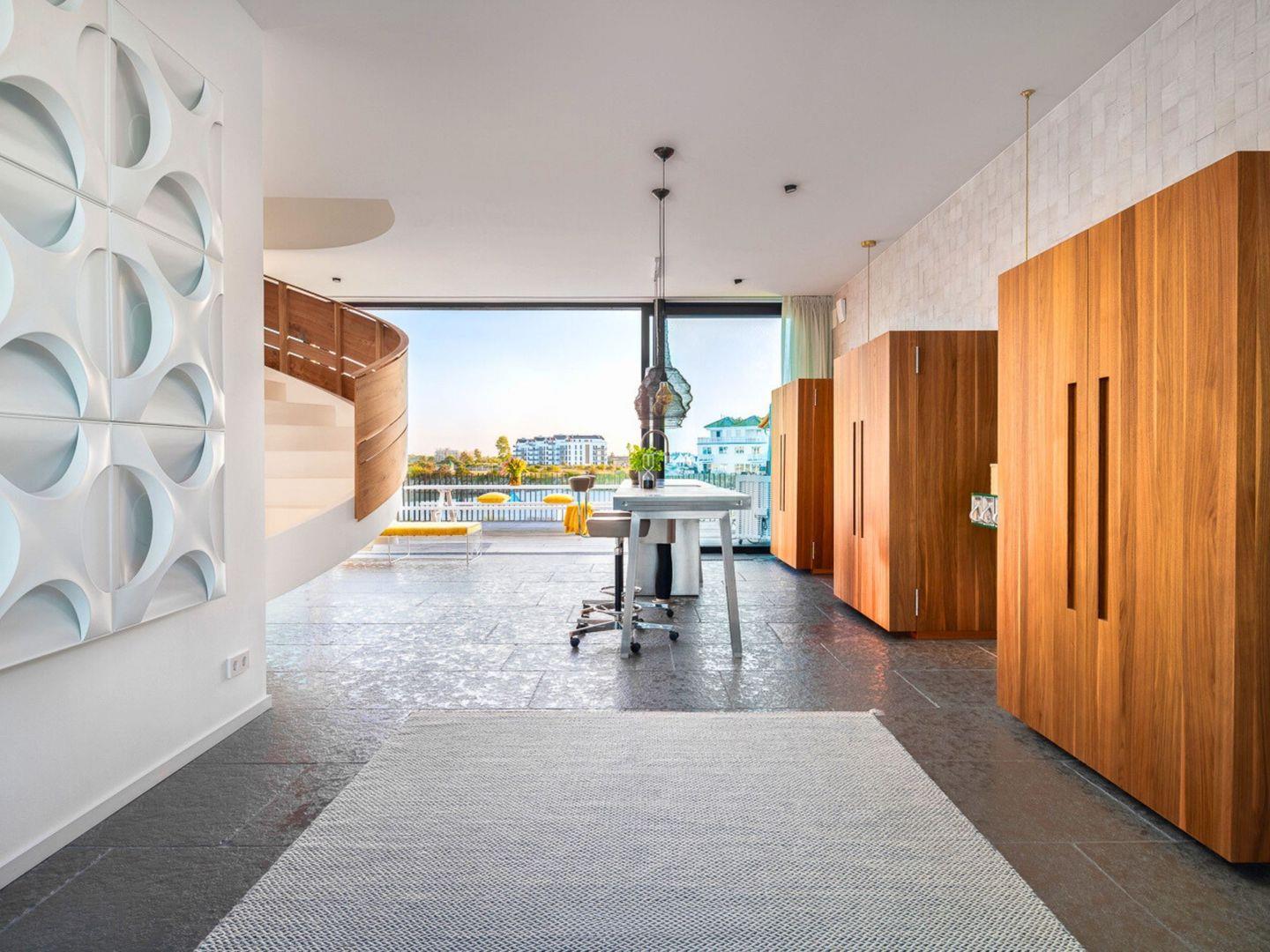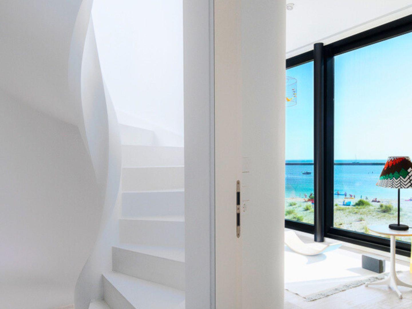 Im Obergeschoss erwarten Sie vier private Rückzugsorte, darunter eine Mastersuite mit Duschtoilette und Bio-Sauna. Die Dachterrasse bietet einen grandiosen 360-Grad-Blick über die Ostsee und die umliegende Natur.