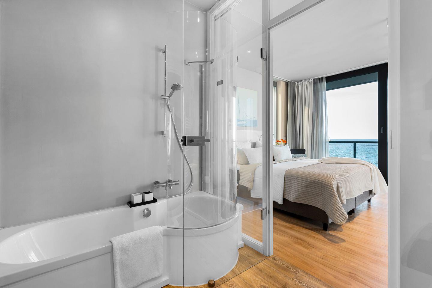 BADEZIMMER: Das En-Suite-Masterbad verwöhnt mit einer finnischen Sauna, Badewanne, Dusche und einem großzügigen Waschtisch – alle mit Meerblick. Ein weiteres Bad mit Dusche liegt gegenüber dem zweiten Schlafzimmer.