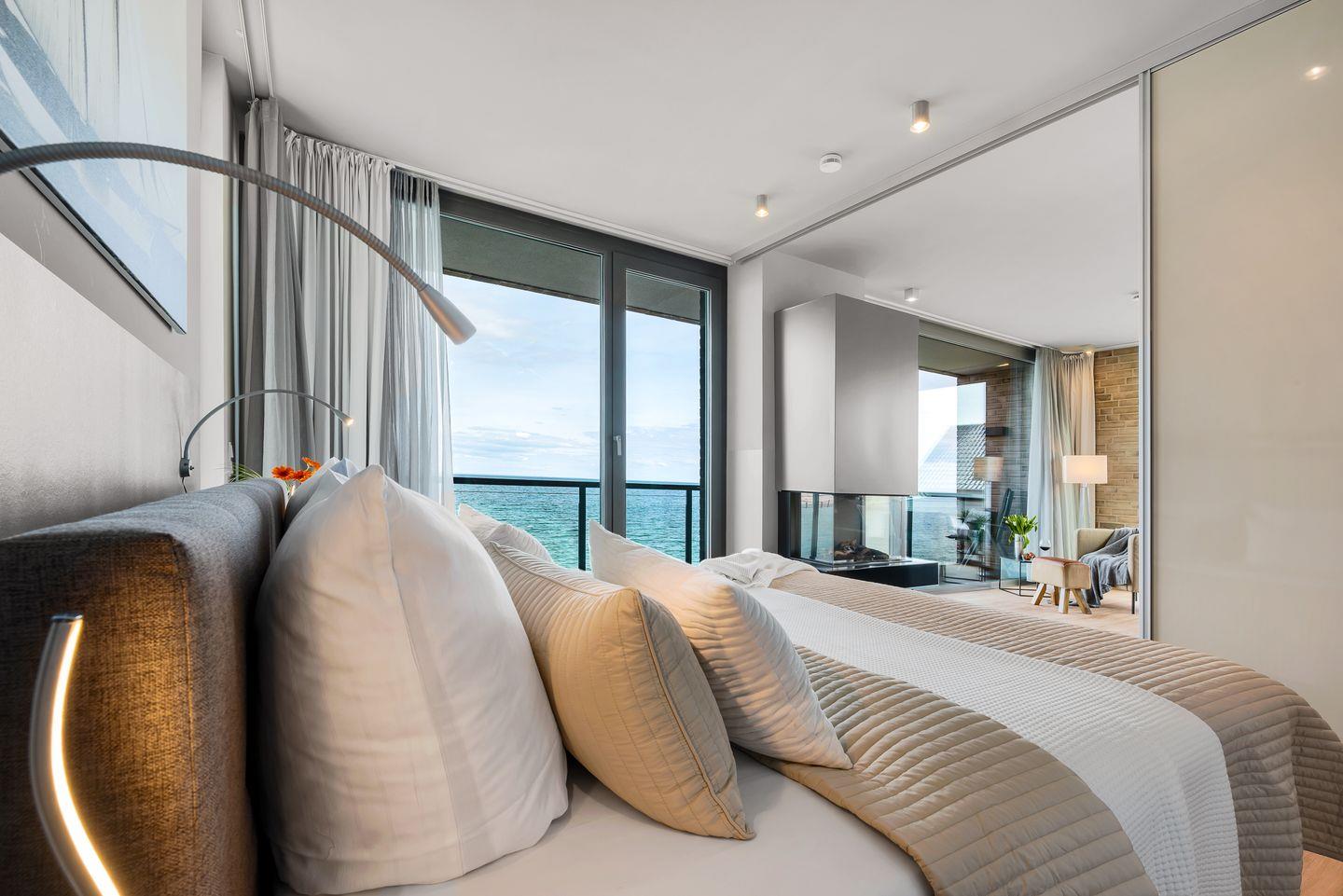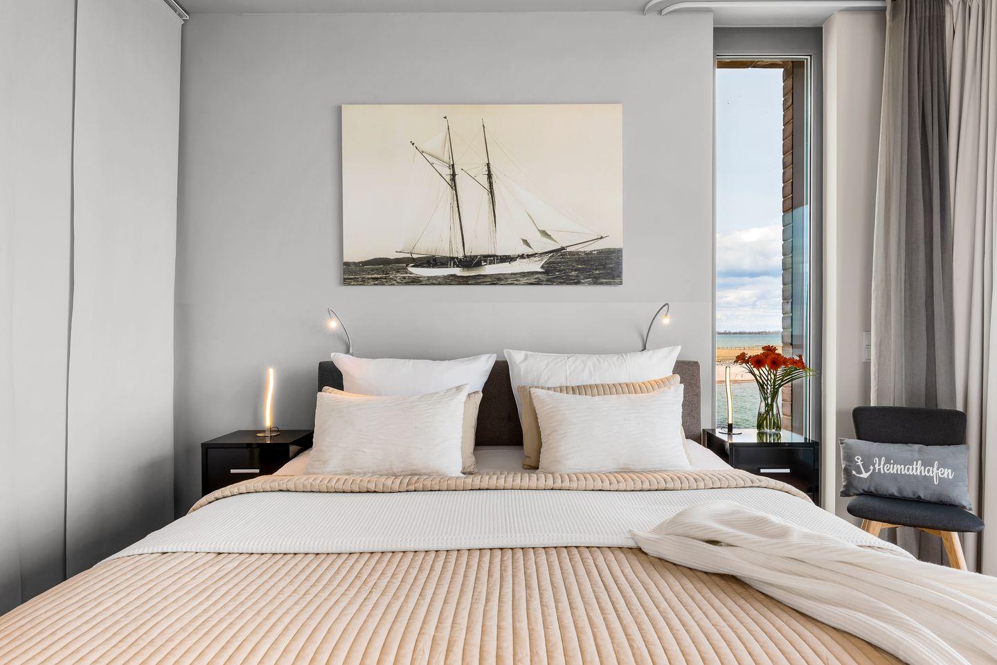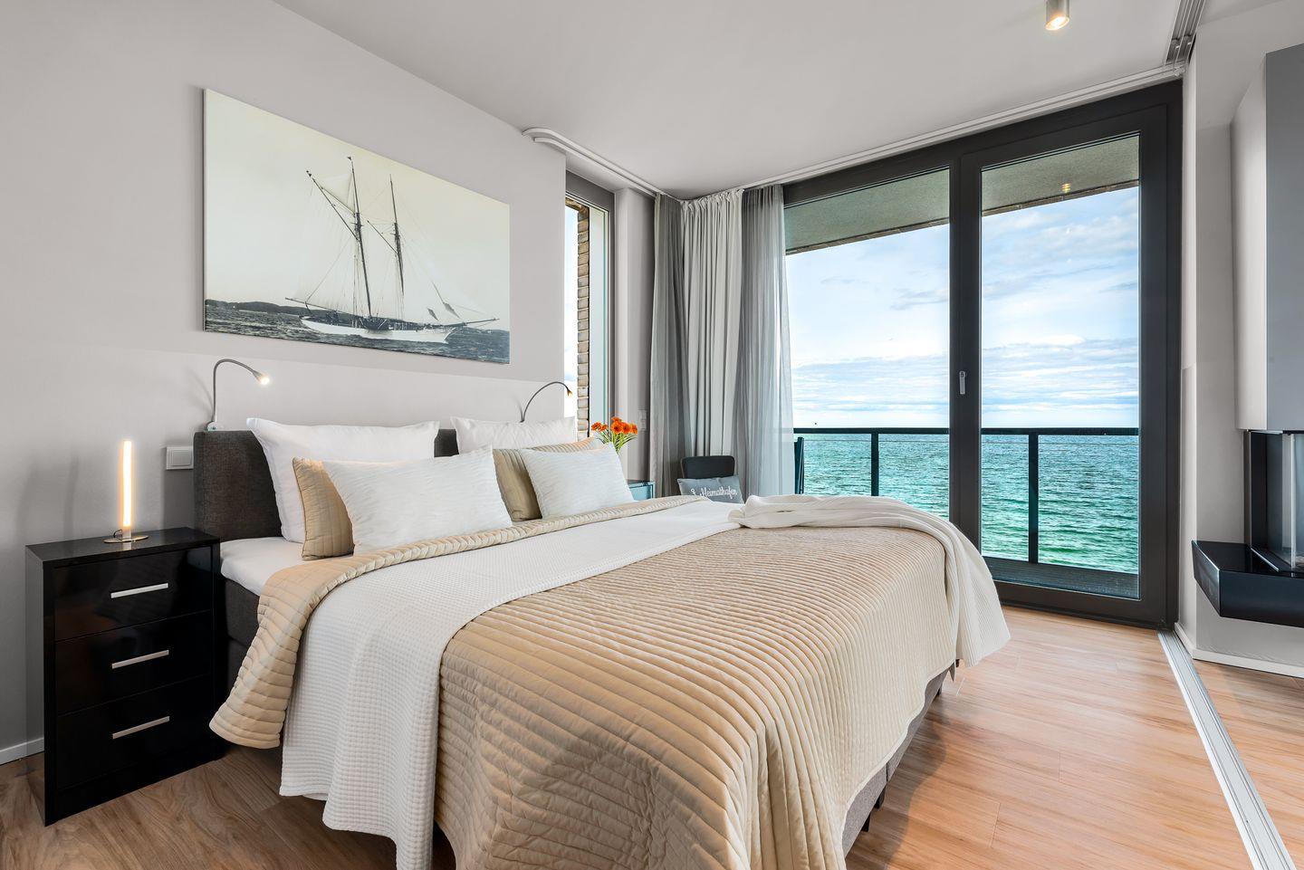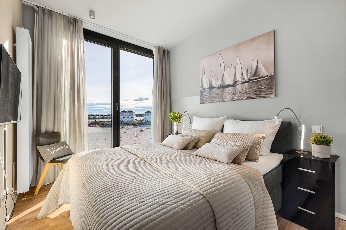 SCHLAFZIMMER: Zwei Schlafzimmer garantieren erholsame Nächte. Der Masterbedroom bietet ein großzügiges Boxspringbett (180x200cm) und direkten Meerblick, verbunden durch eine Schiebetür zum Wohnbereich. Das zweite Schlafzimmer mit einem Boxspringbett (160x200cm) und Fernseher blickt auf den Privatstrand, das Hafenbecken und die Ostsee.