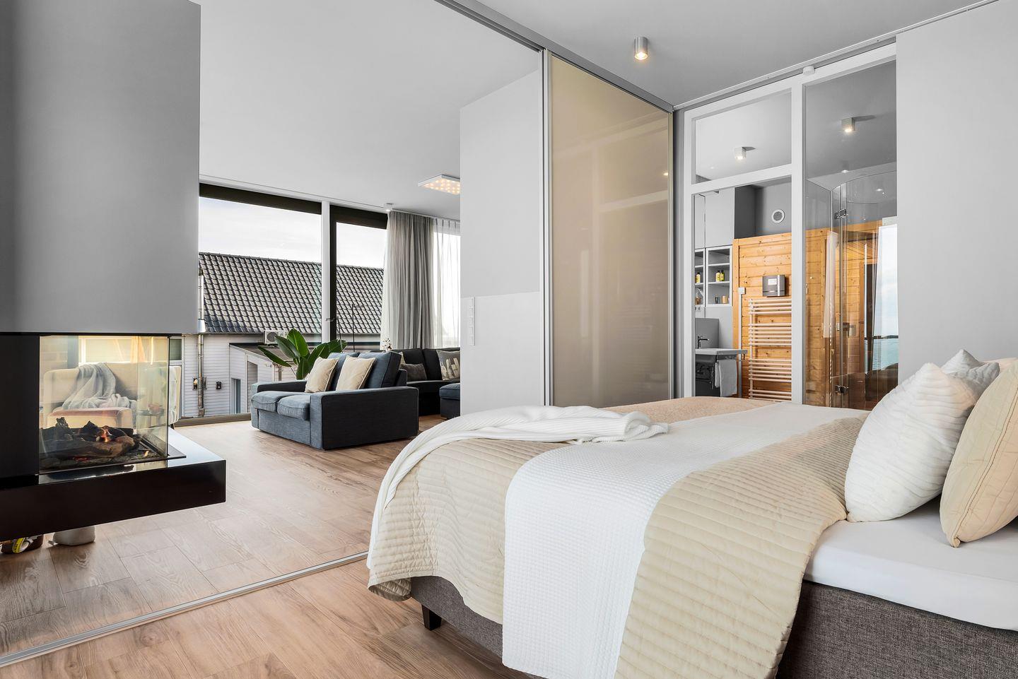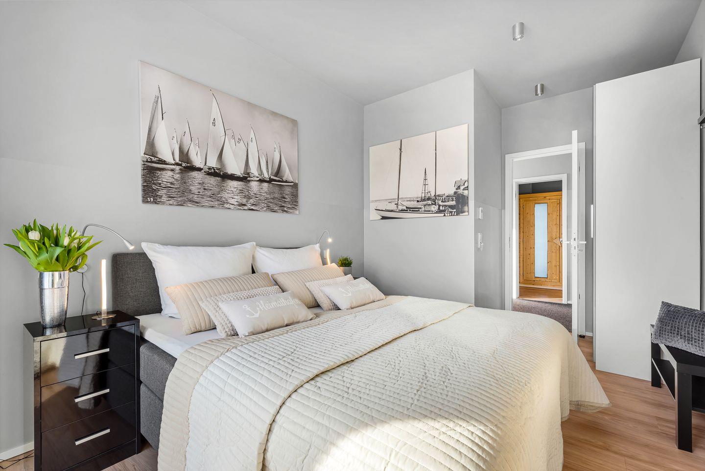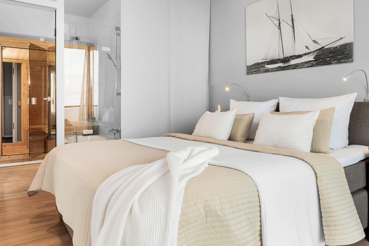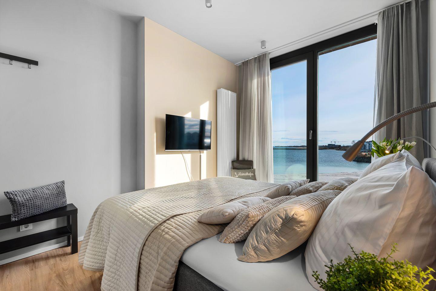 SCHLAFZIMMER: Zwei Schlafzimmer garantieren erholsame Nächte. Der Masterbedroom bietet ein großzügiges Boxspringbett (180x200cm) und direkten Meerblick, verbunden durch eine Schiebetür zum Wohnbereich. Das zweite Schlafzimmer mit einem Boxspringbett (160x200cm) und Fernseher blickt auf den Privatstrand, das Hafenbecken und die Ostsee.
