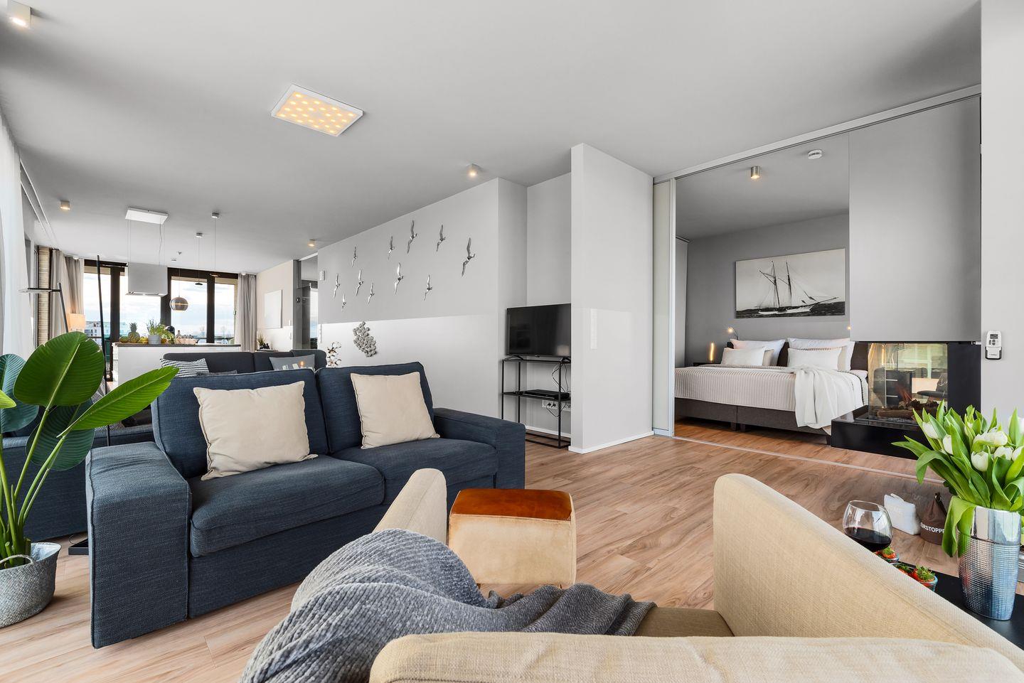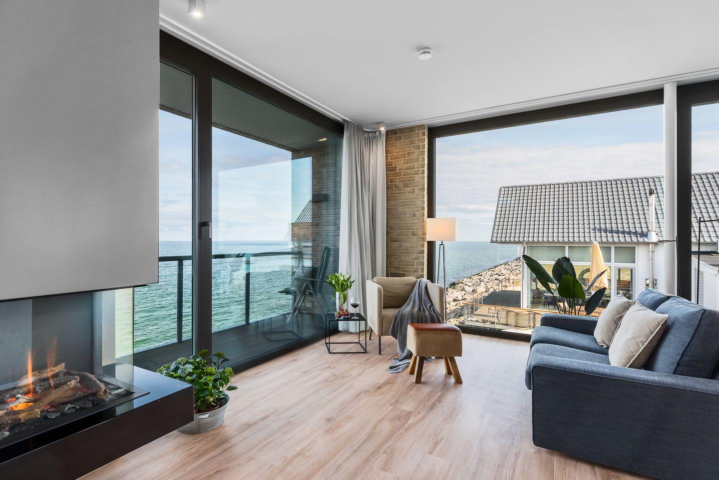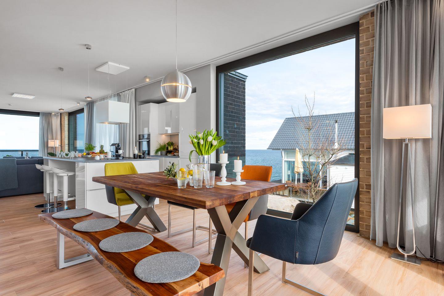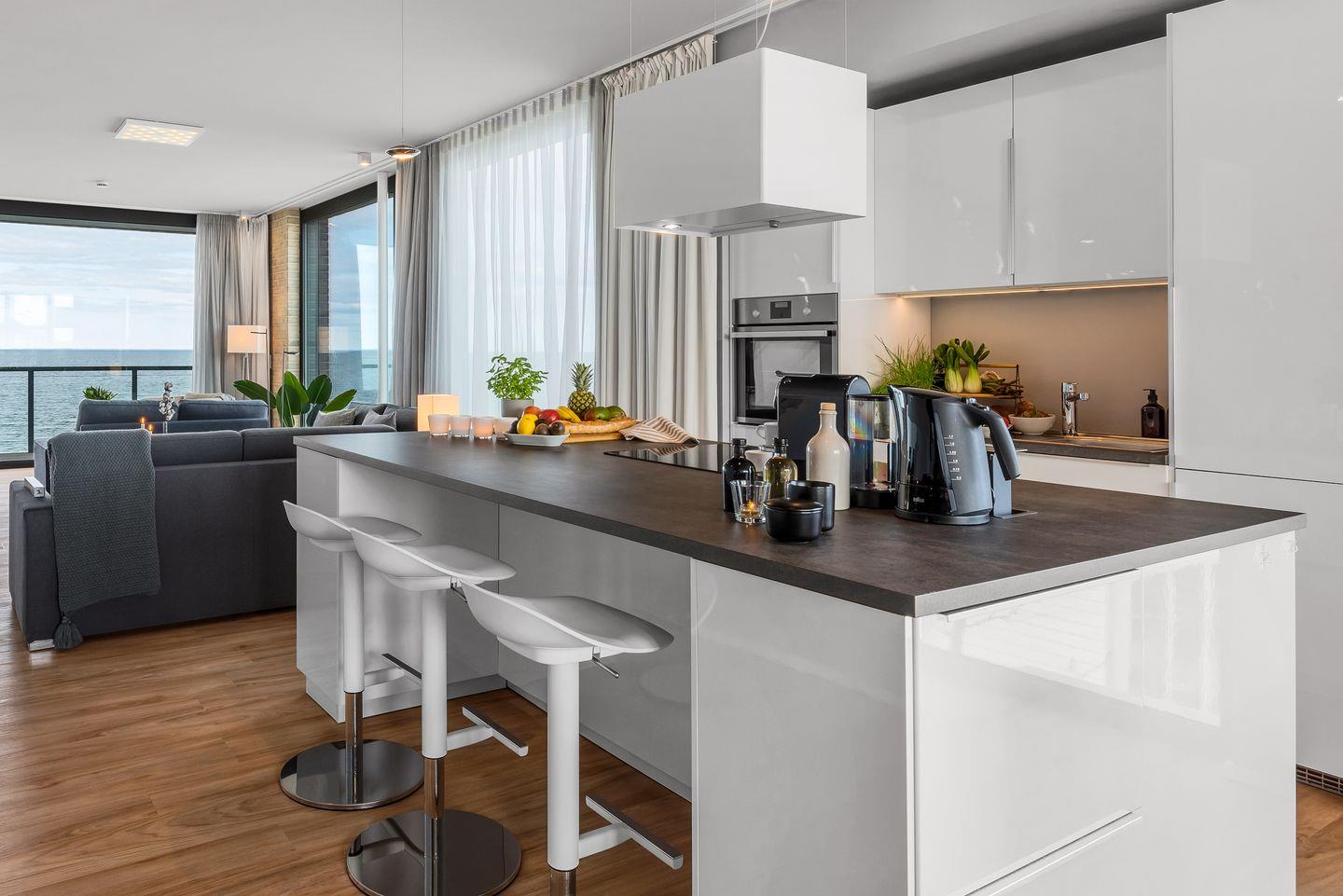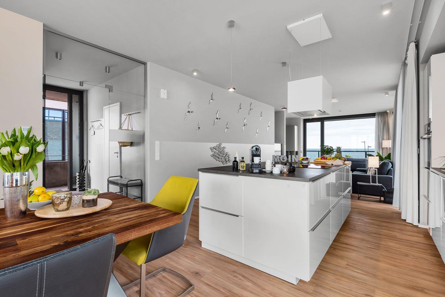 WOHNBEREICH: Die Wohnung besticht durch ein modernes Design mit einem Vollglaselement, das den Flur vom geräumigen Hauptwohnraum trennt. Genießen Sie den Ausblick auf die Ostsee direkt von der hochwertig ausgestatteten Küche mit Kochinsel oder entspannen Sie im Wohnbereich vor dem Panoramafenster mit Blick auf die weite Ostsee. Ein komfortables Schlafsofa und ein Gaskamin schaffen auch in kühleren Monaten eine gemütliche Atmosphäre.