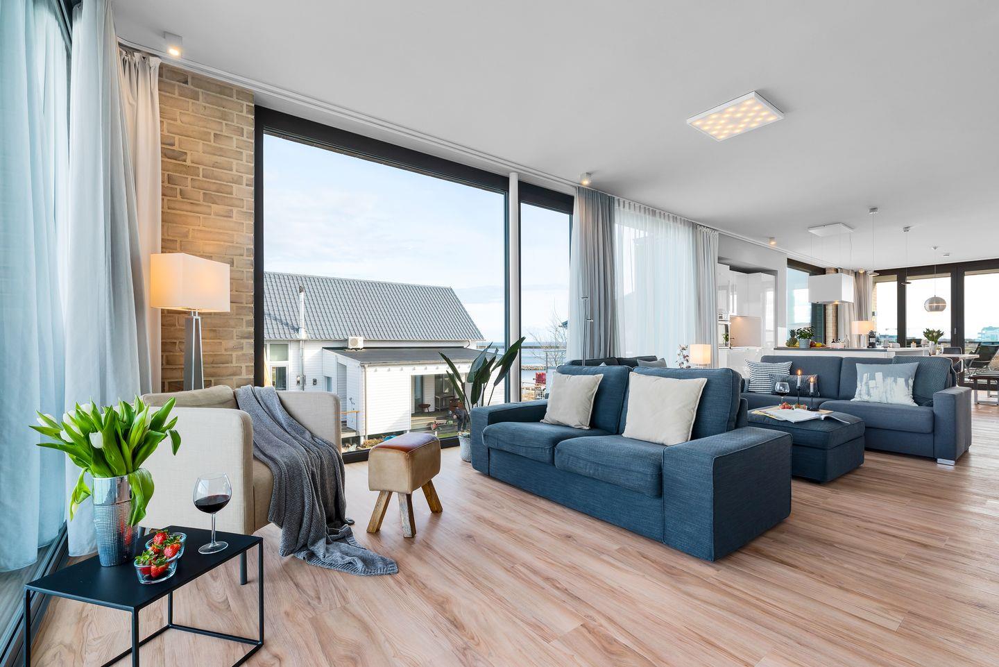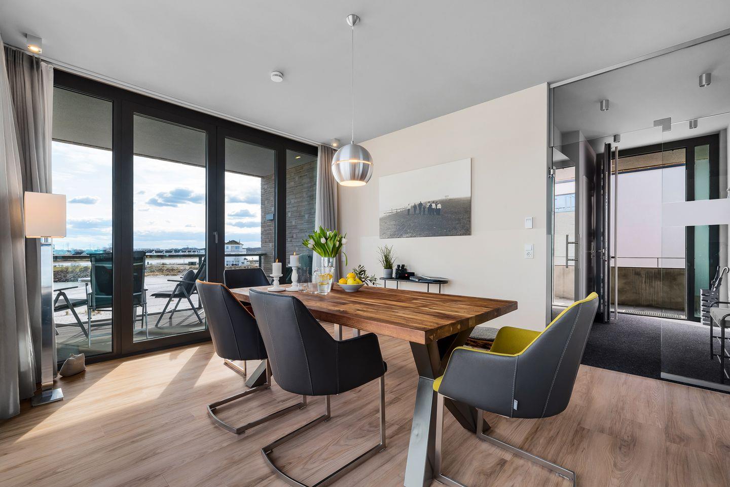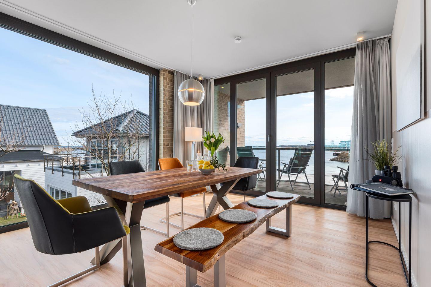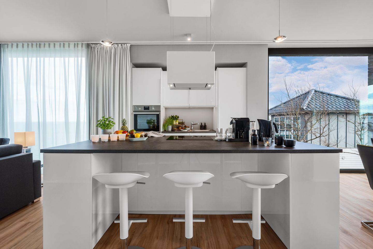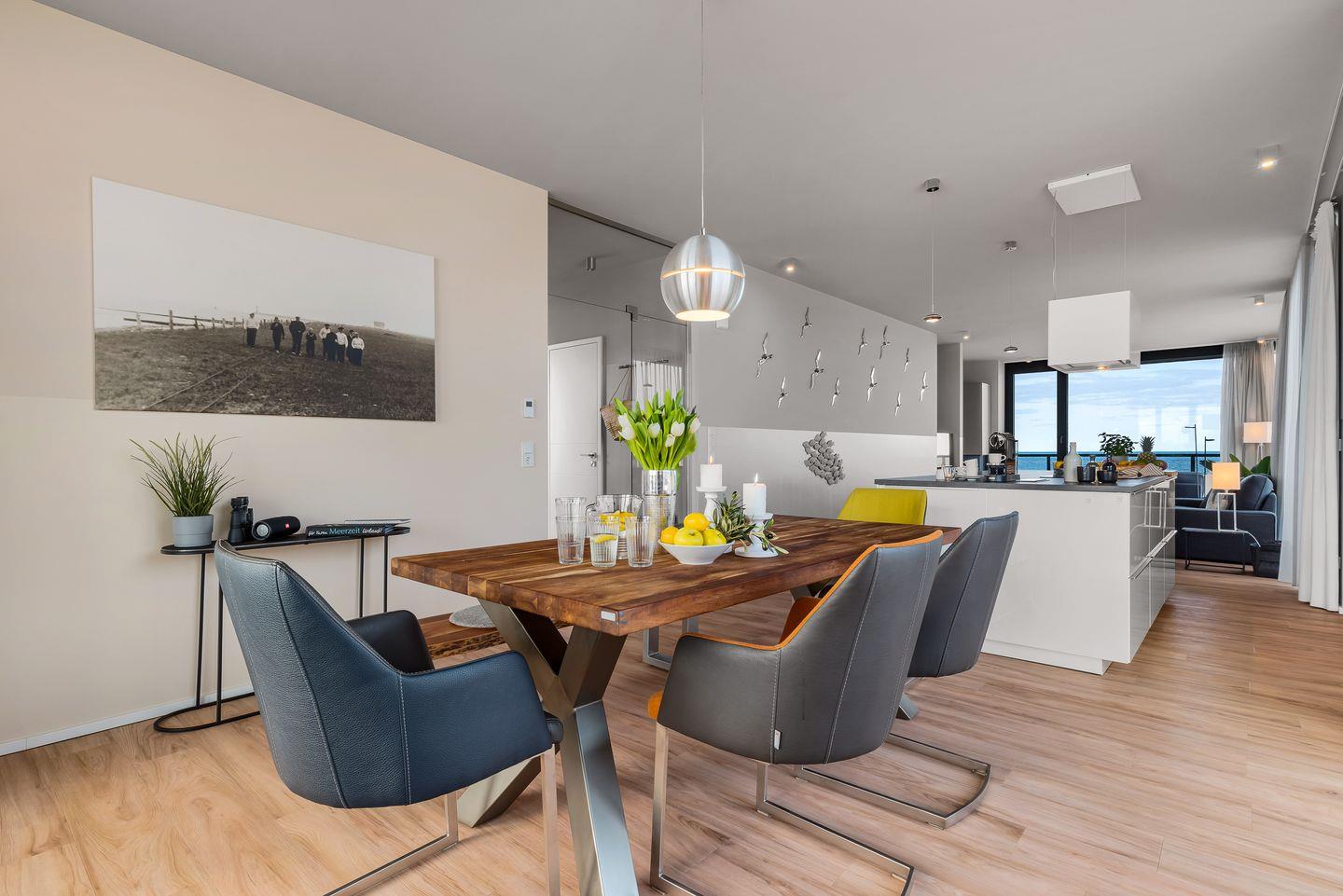 WOHNBEREICH: Die Wohnung besticht durch ein modernes Design mit einem Vollglaselement, das den Flur vom geräumigen Hauptwohnraum trennt. Genießen Sie den Ausblick auf die Ostsee direkt von der hochwertig ausgestatteten Küche mit Kochinsel oder entspannen Sie im Wohnbereich vor dem Panoramafenster mit Blick auf die weite Ostsee. Ein komfortables Schlafsofa und ein Gaskamin schaffen auch in kühleren Monaten eine gemütliche Atmosphäre.