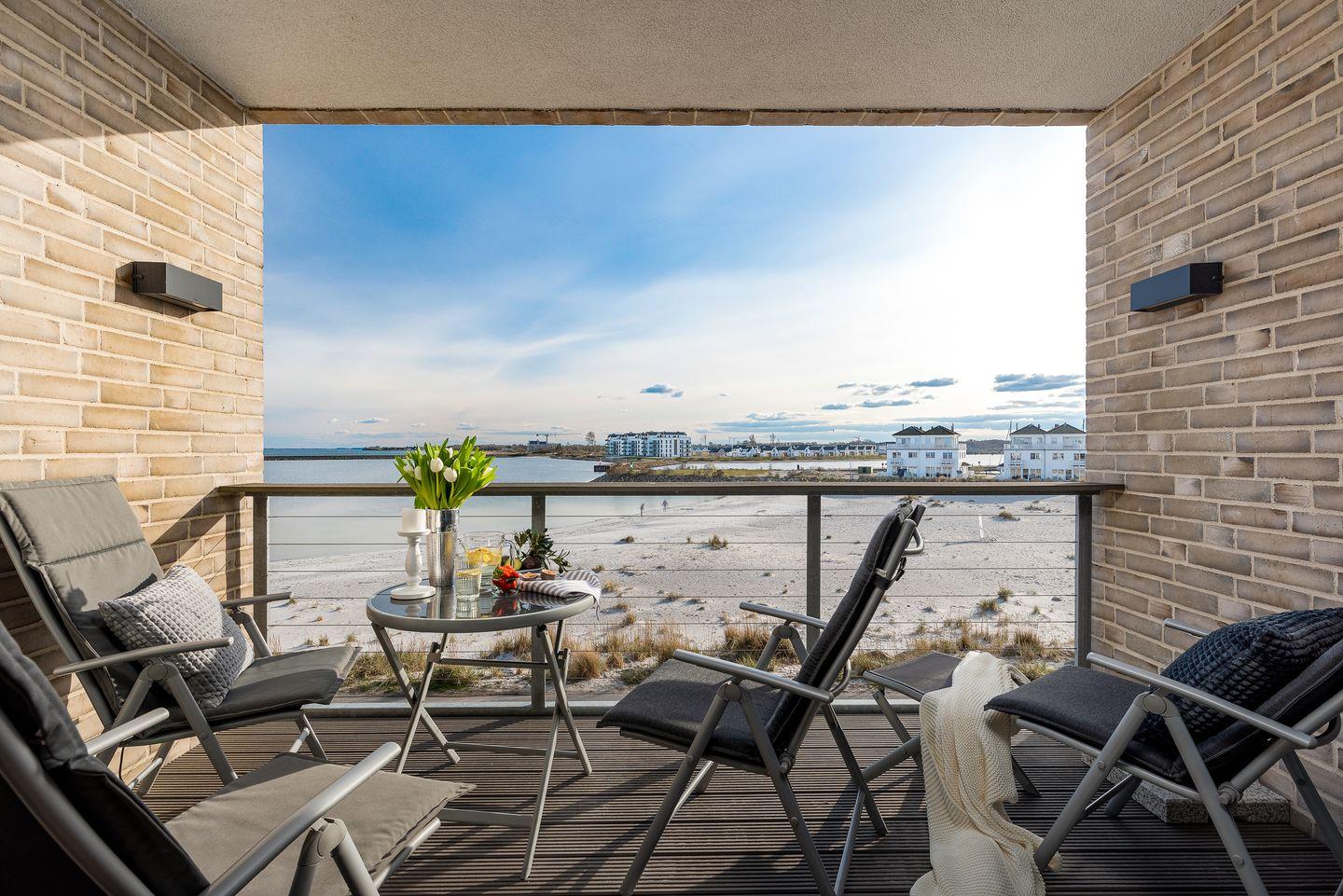 AUSSENBEREICH: Zwei Balkone mit Möblierung laden zu Mahlzeiten über dem Meer ein. Die großzügige 80 m² Dachterrasse mit drehbarem Strandkorb verspricht unvergessliche Stunden unter freiem Himmel. Ein abschließbarer Fahrradschuppen rundet das Angebot ab.