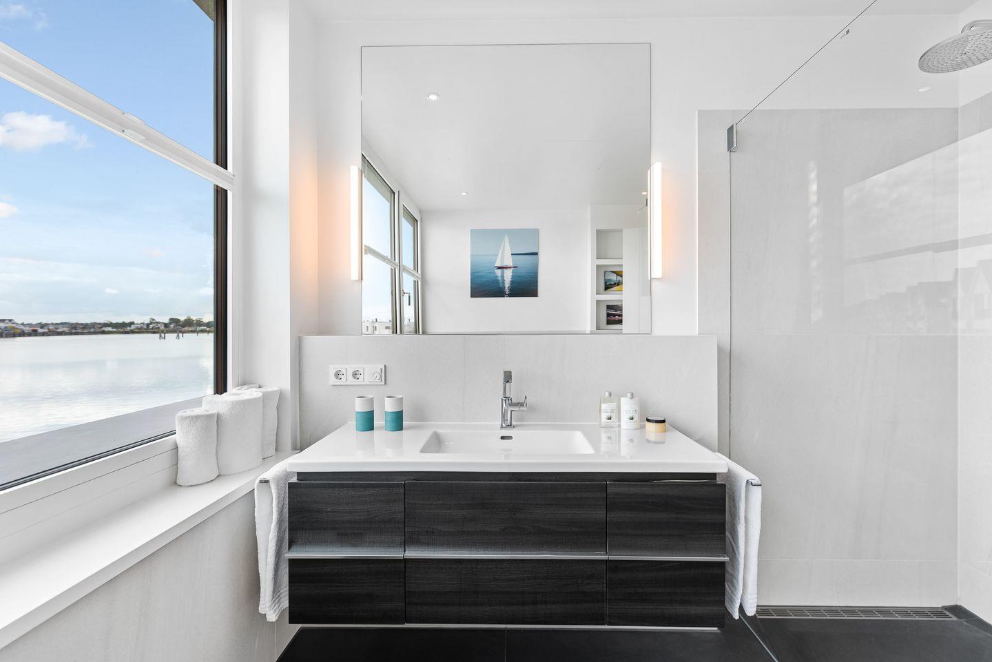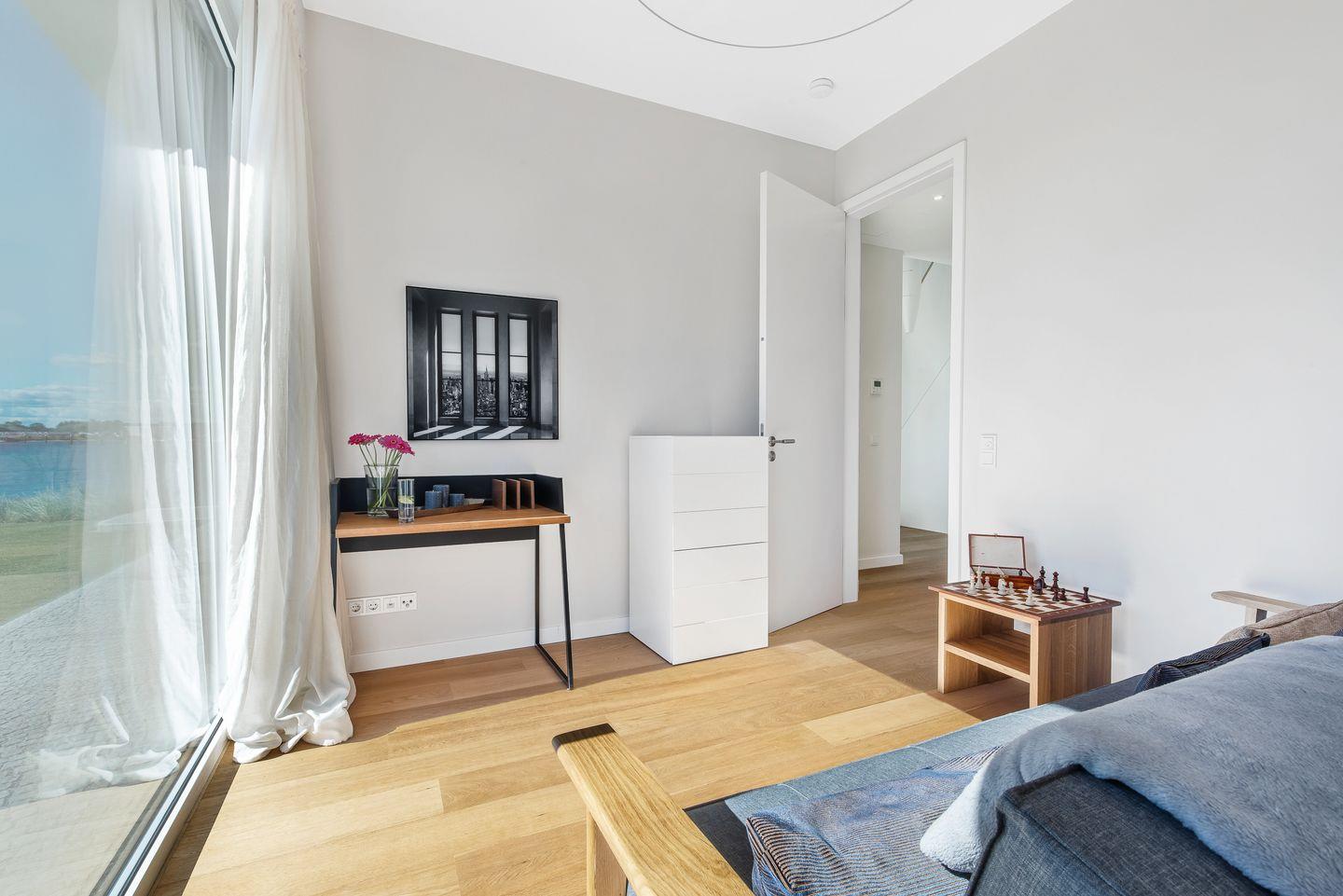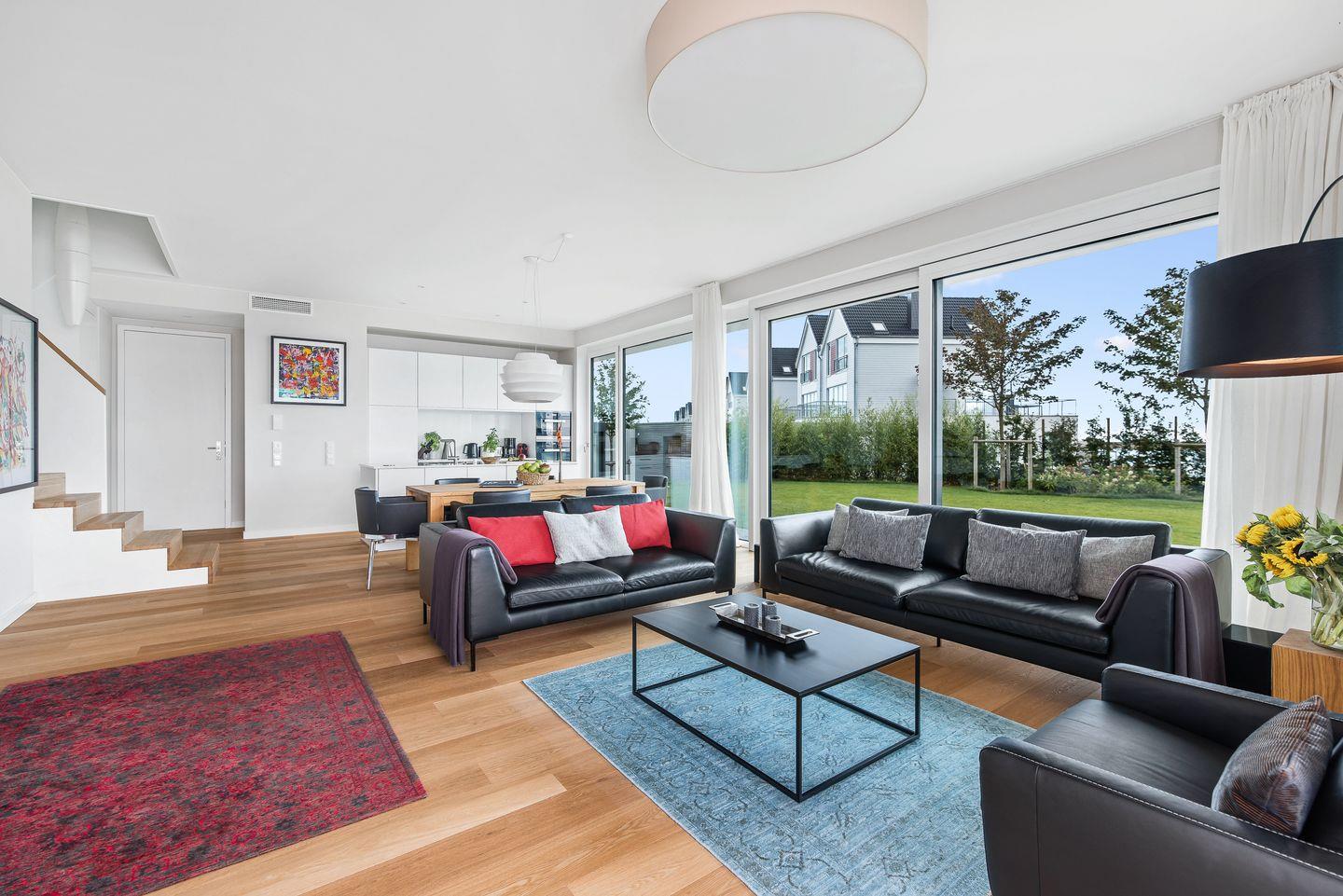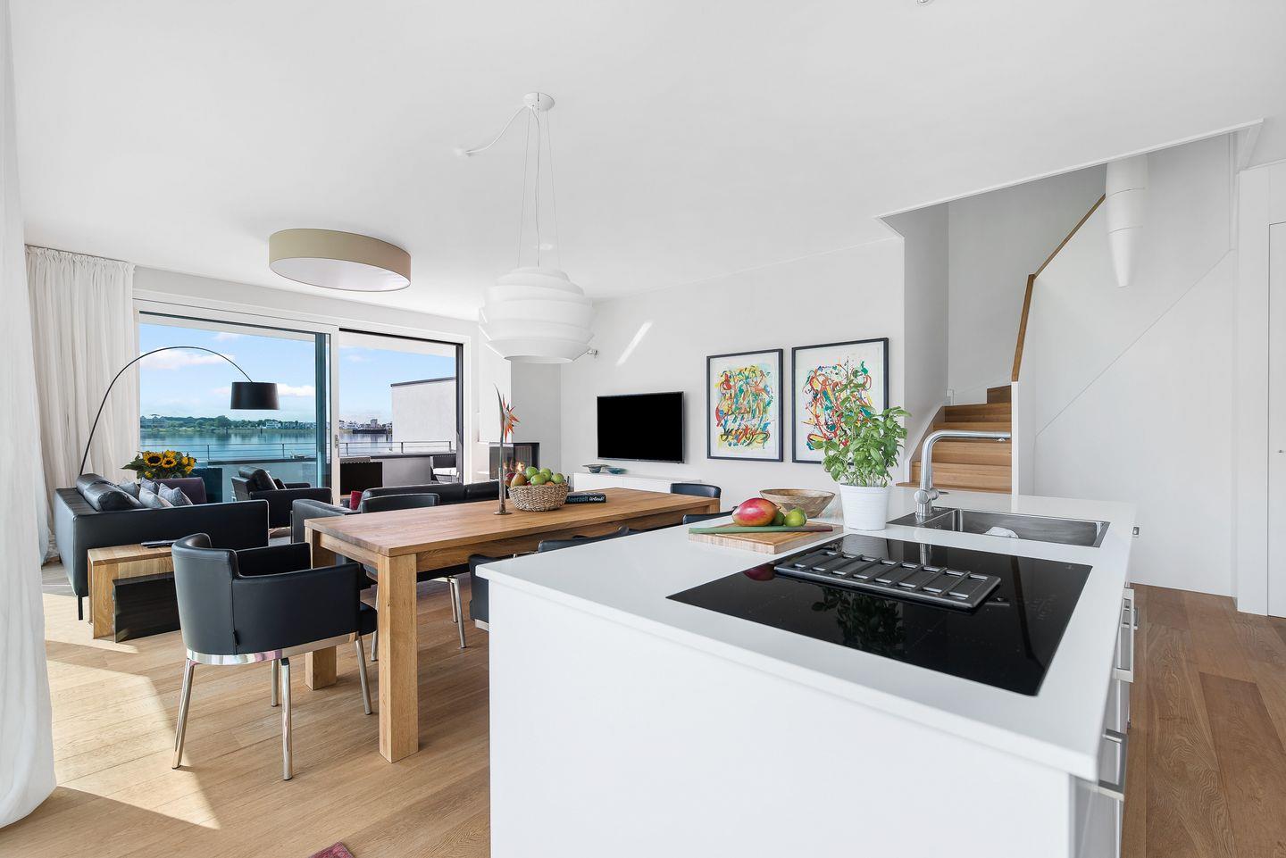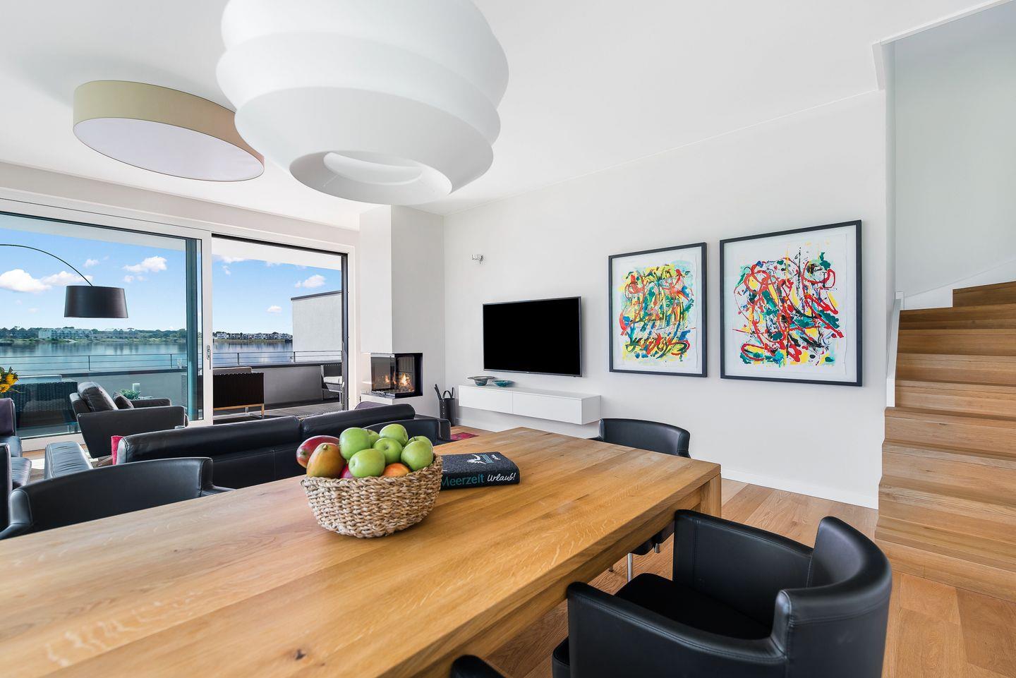 Der große abgeschirmte Garten sowie die sonnige Terrasse mit Blick auf das Hafenbecken bieten perfekte Orte zum Toben oder Entspannen. Im Erdgeschoss erwarten Sie ein geräumiger Wohn-/ Essbereich mit Kaminofen sowie ein Gäste-WC und ein Schlafzimmer mit Schlafsofa und eigener Dusche. In der hochwertig ausgestatteten Küche mit Kochinsel haben Sie nicht nur Wohnzimmer und Garten immer im Blick, sondern auch eine fantastische Aussicht aufs Wasser.