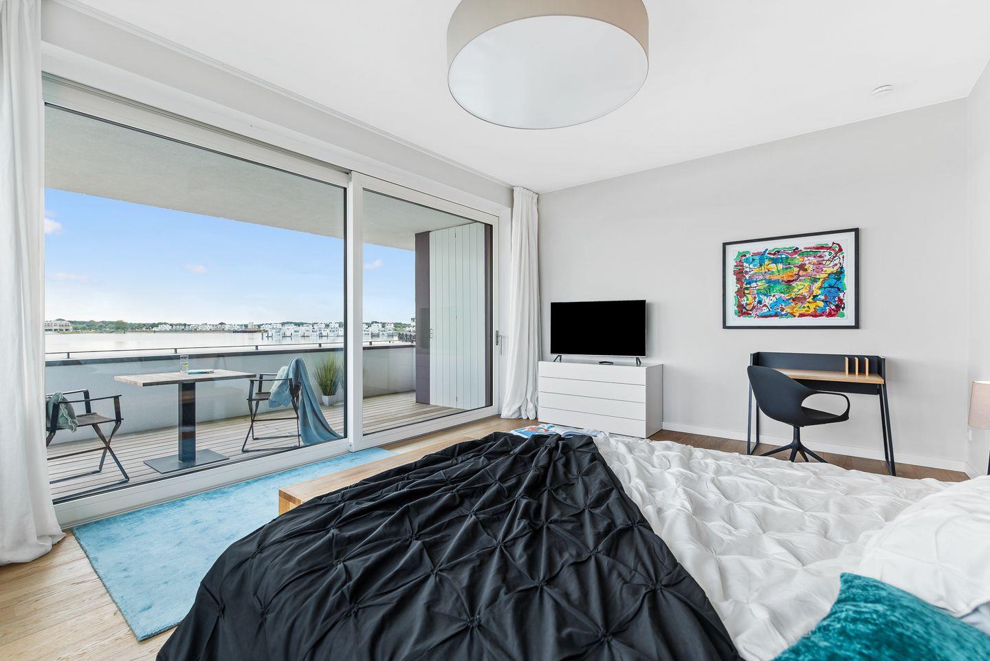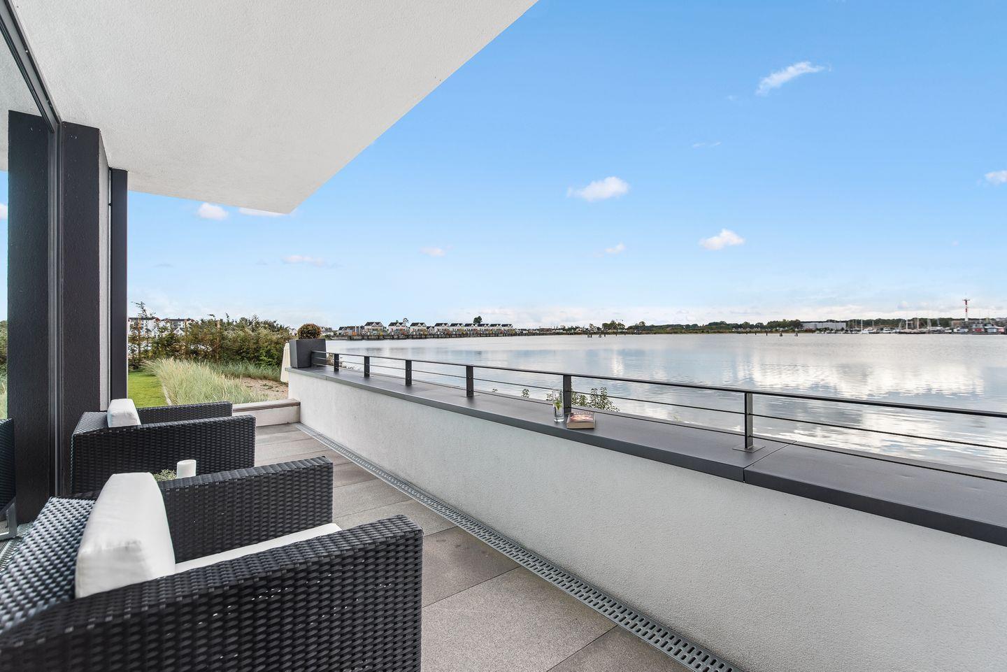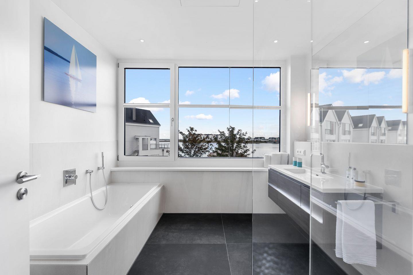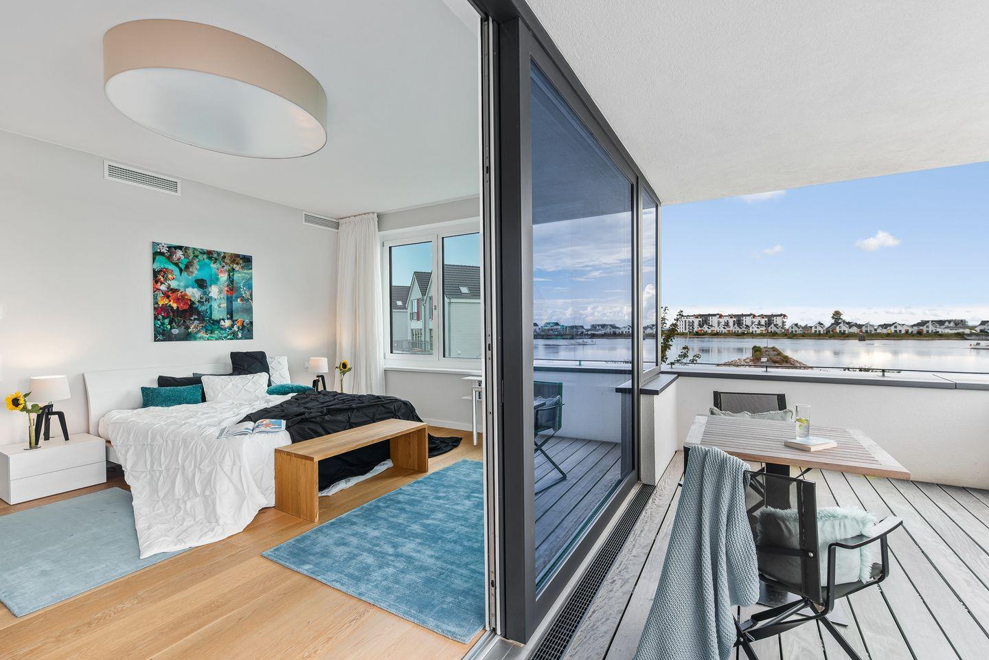 Der große abgeschirmte Garten sowie die sonnige Terrasse mit Blick auf das Hafenbecken bieten perfekte Orte zum Toben oder Entspannen. Im Erdgeschoss erwarten Sie ein geräumiger Wohn-/ Essbereich mit Kaminofen sowie ein Gäste-WC und ein Schlafzimmer mit Schlafsofa und eigener Dusche. In der hochwertig ausgestatteten Küche mit Kochinsel haben Sie nicht nur Wohnzimmer und Garten immer im Blick, sondern auch eine fantastische Aussicht aufs Wasser.