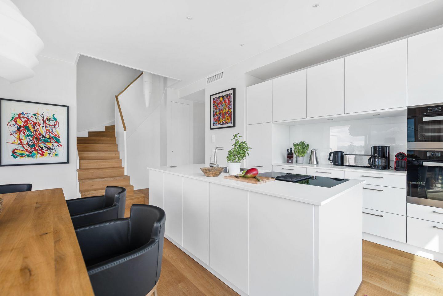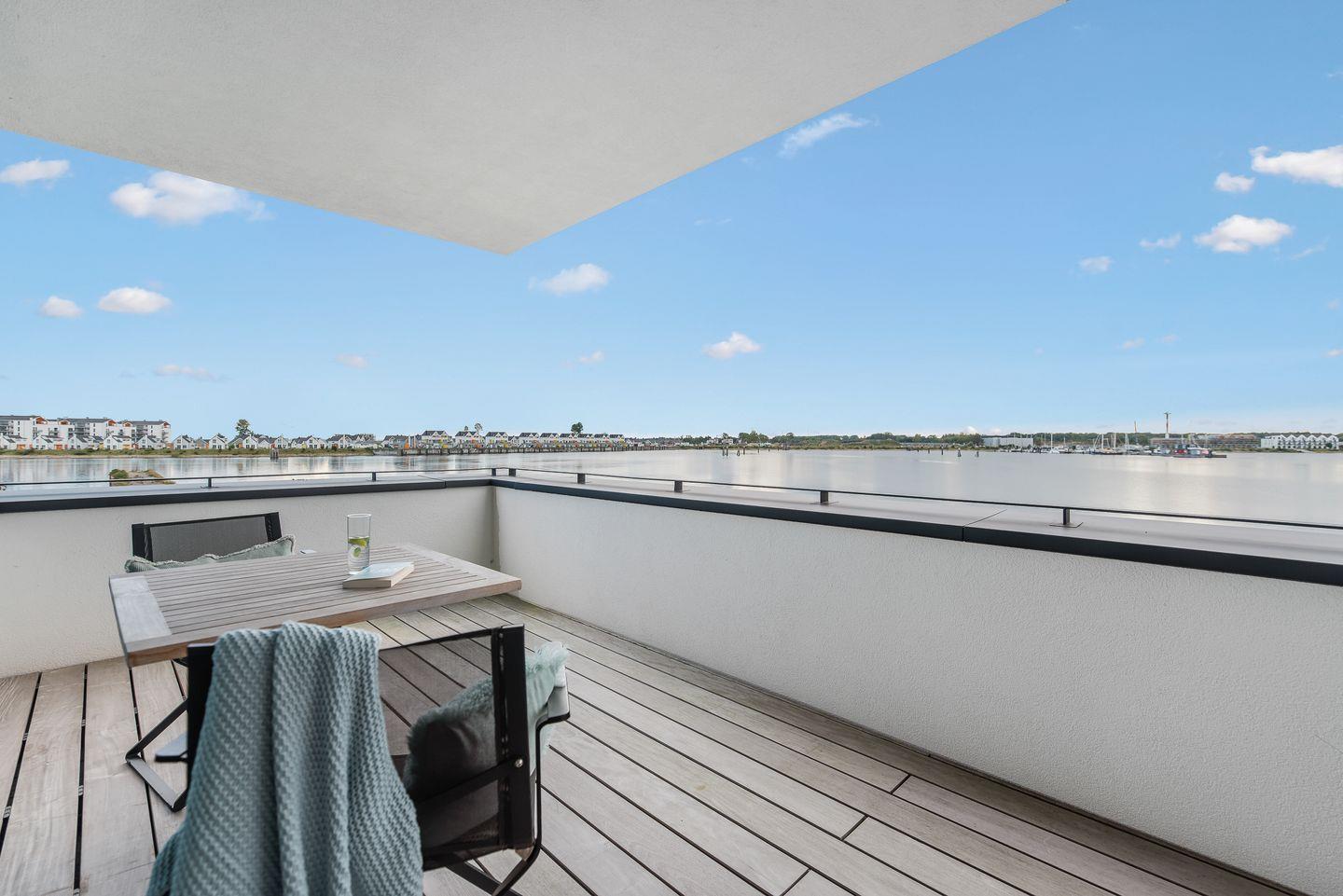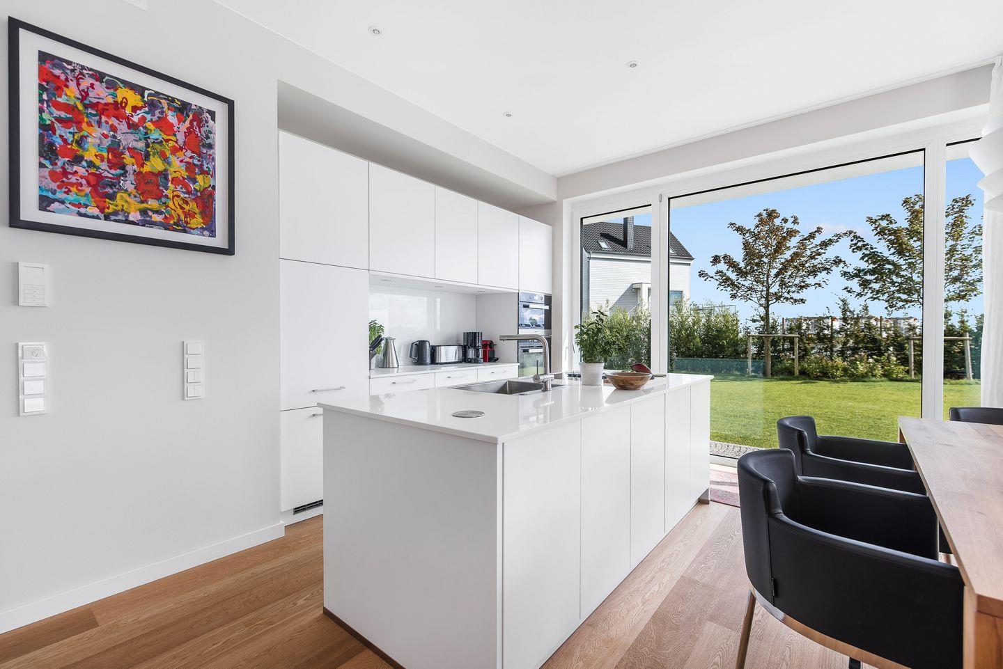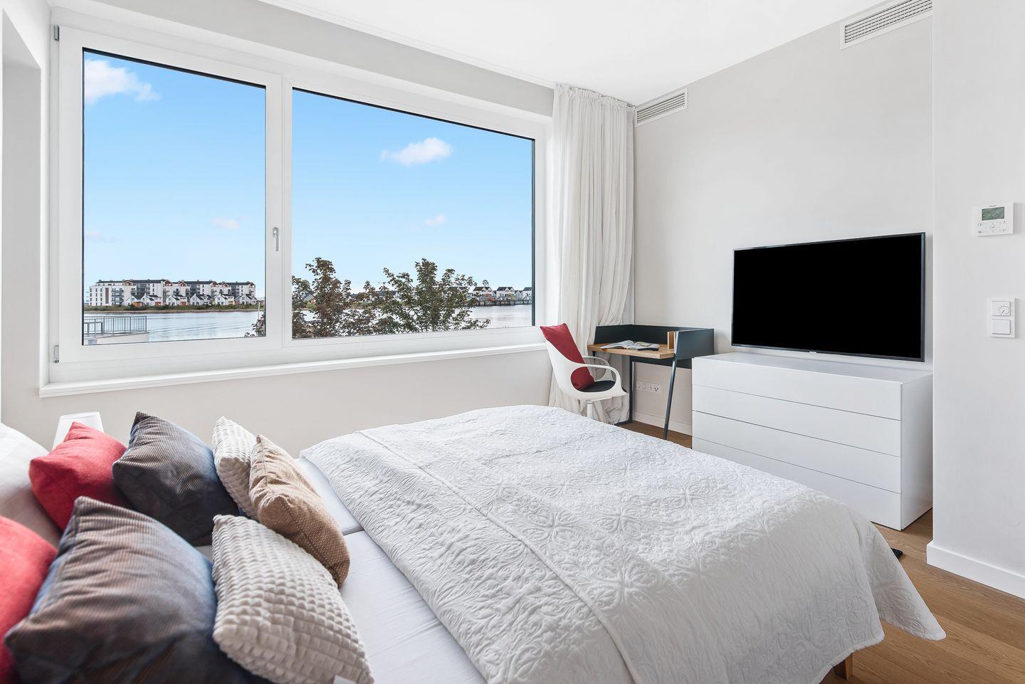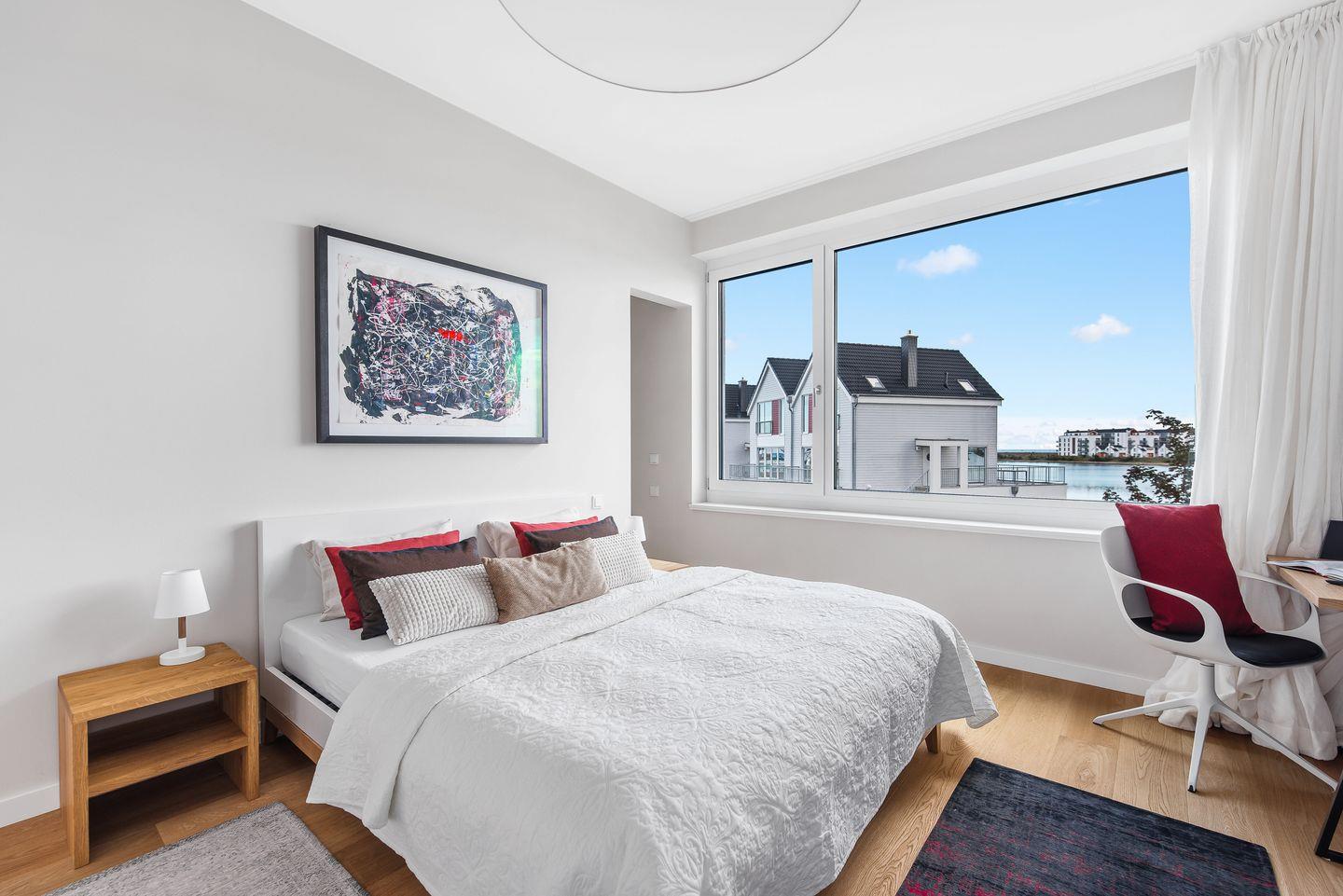 Der große abgeschirmte Garten sowie die sonnige Terrasse mit Blick auf das Hafenbecken bieten perfekte Orte zum Toben oder Entspannen. Im Erdgeschoss erwarten Sie ein geräumiger Wohn-/ Essbereich mit Kaminofen sowie ein Gäste-WC und ein Schlafzimmer mit Schlafsofa und eigener Dusche. In der hochwertig ausgestatteten Küche mit Kochinsel haben Sie nicht nur Wohnzimmer und Garten immer im Blick, sondern auch eine fantastische Aussicht aufs Wasser.