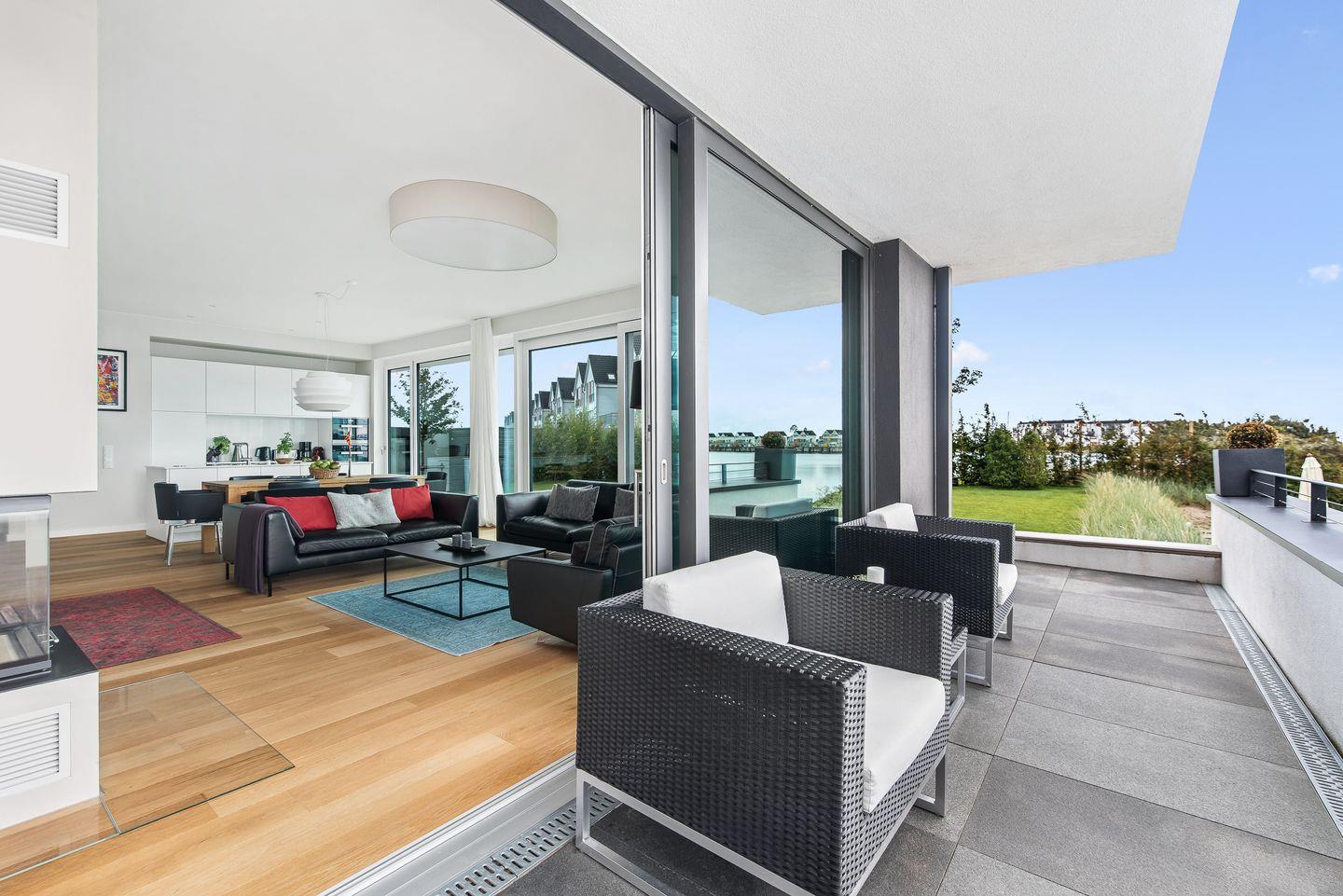 Im Außenbereich gibt es viel Platz zum Wohlfühlen und Spaß haben mit der Familie oder Freunden. Genießen Sie großartige Spielstunden auf der großen, sichtgeschützten Rasenfläche oder entspannen Sie am eigenen, kleinen Strandabschnitt direkt neben der Terrasse.