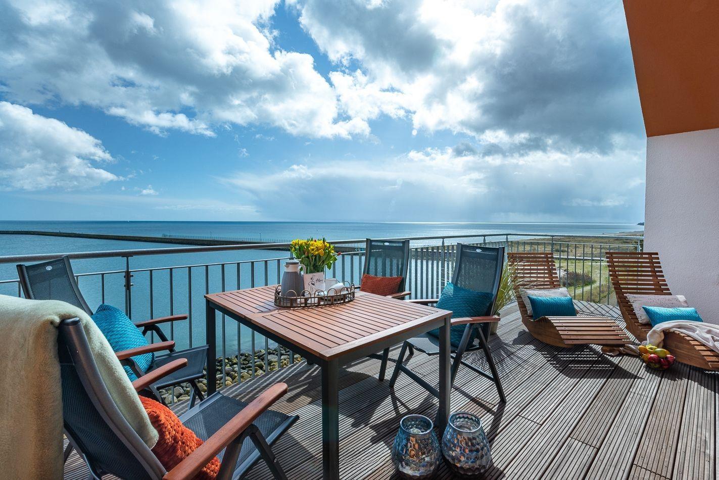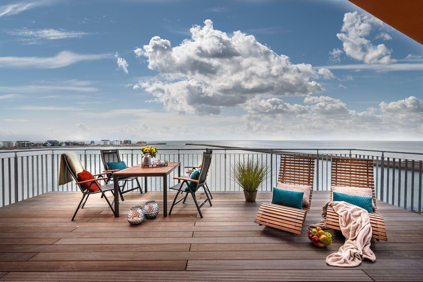 Das Apartment „MeerFlair26“ liegt in der obersten Etage. Sie erreichen es bequem per Fahrstuhl direkt aus der Tiefgarage. Die Wohnung ist lichtdurchflutet. Große Panoramafenster geben einen beeindruckenden Blick auf die Ostsee bis nach Dänemark frei. Lauschen Sie dem Kreischen der Möwen von Ihrer großzügigen Dachterrasse.