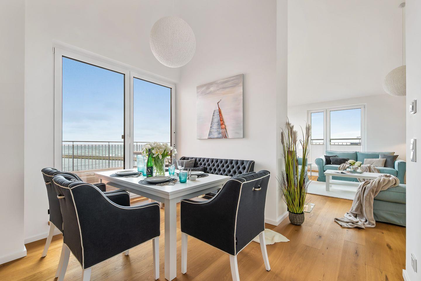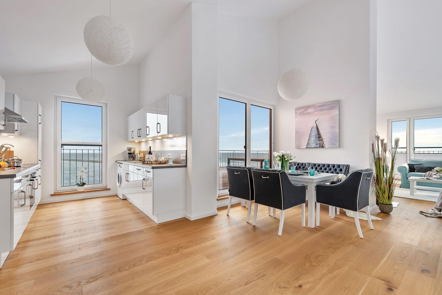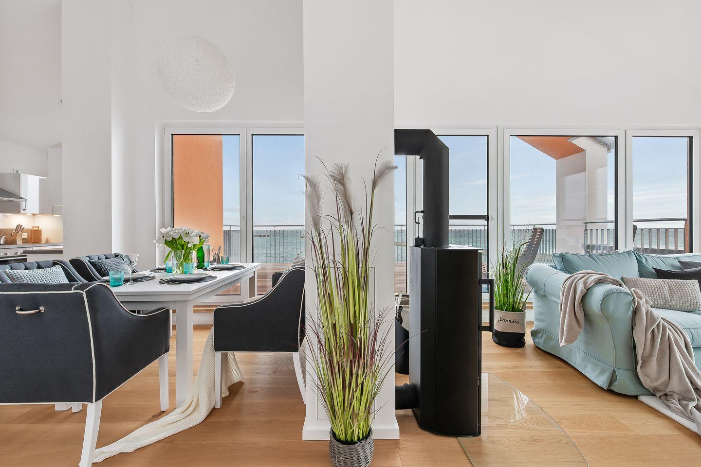 Der offene Wohnbereich mit seiner imposanten Deckenhöhe sowie der hochwertigen Einbauküche ist das Herzstück des Apartments. Entspannen Sie im gemütlichen Essbereich oder auf der stilvollen Sitzlandschaft. Maritime Dekorationselemente unterstreichen das Beachhouse-Feeling. Ein Kaminofen sorgt für wohlige Wärme an kühleren Abenden. Die Ostsee haben Sie dabei natürlich immer im Blick.