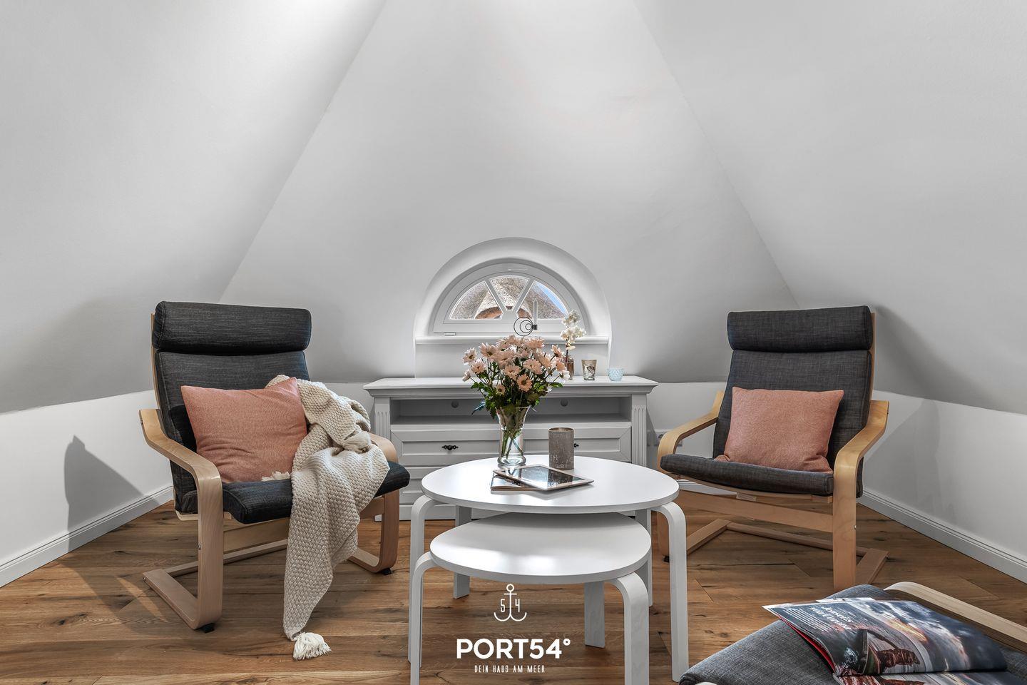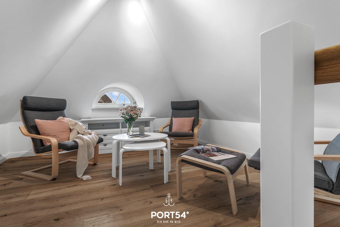 Vom ersten Obergeschoss erreichst Du die Galerie im zweiten Obergeschoss, wo ein gemütlicher Rückzugsort geschaffen wurde. Eine fünfte Person findet Platz auf dem Schlafsofa im Wohnbereich.