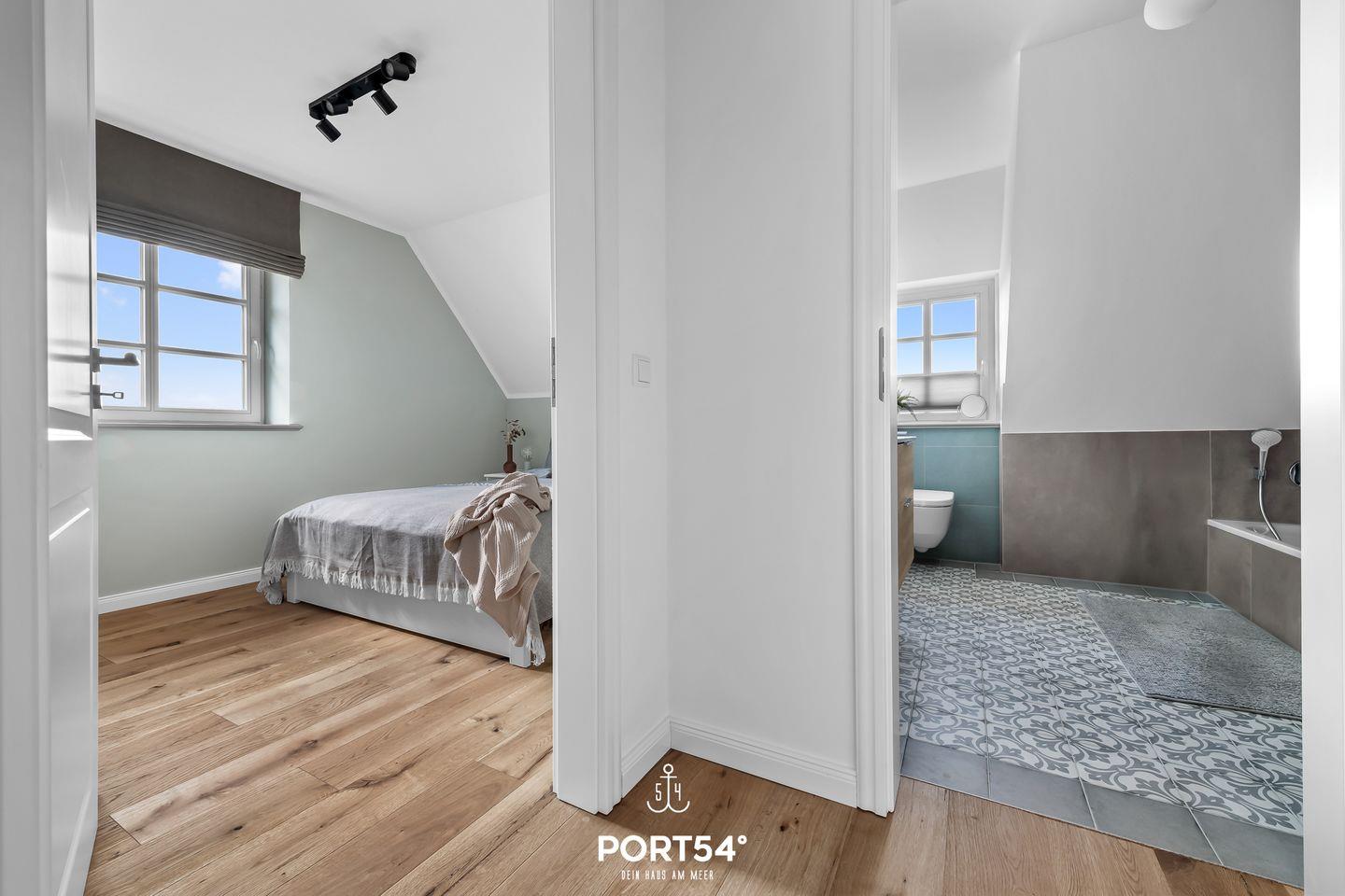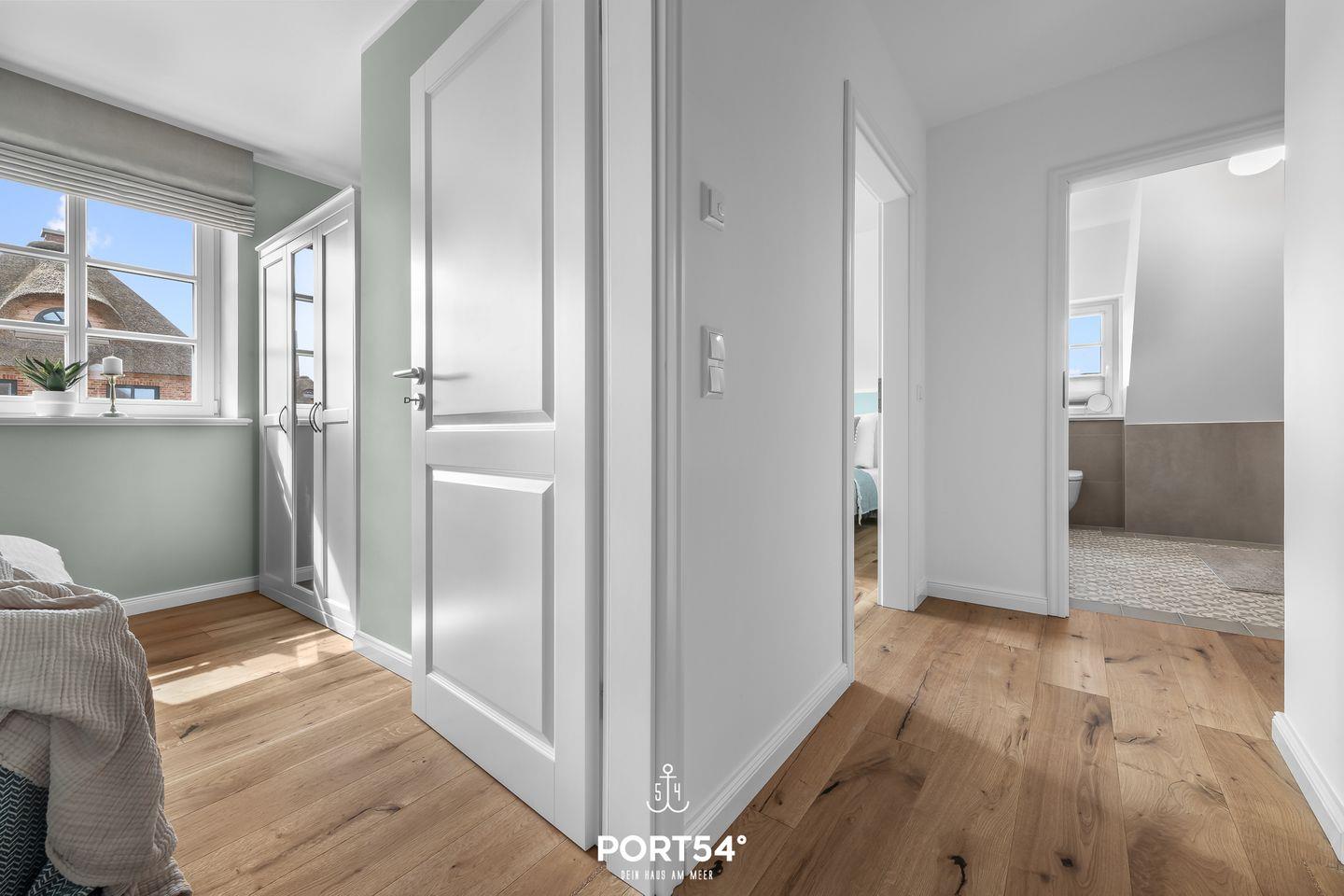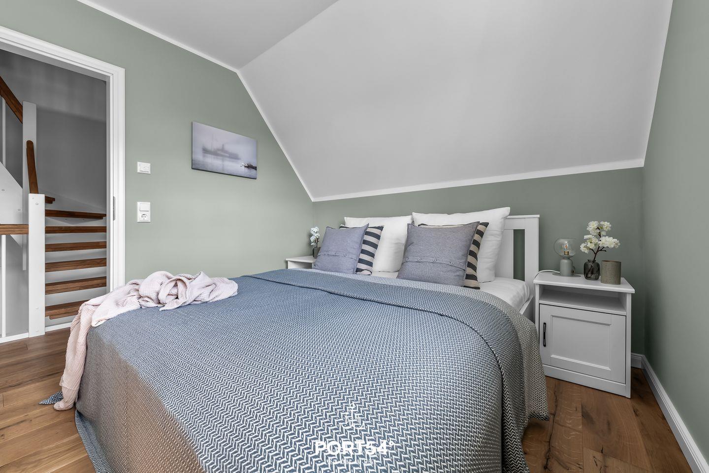Im ersten Obergeschoss erwarten Dich zwei Schlafzimmer, die jeweils mit einem Doppelbett (je 160x200cm) und einem Kleiderschrank ausgestattet sind. Hier erwartet Dich zudem das zweite Tageslichtbad mit ebenerdiger Dusche.