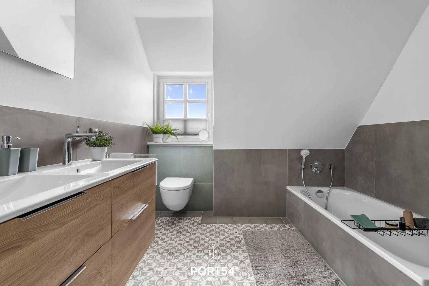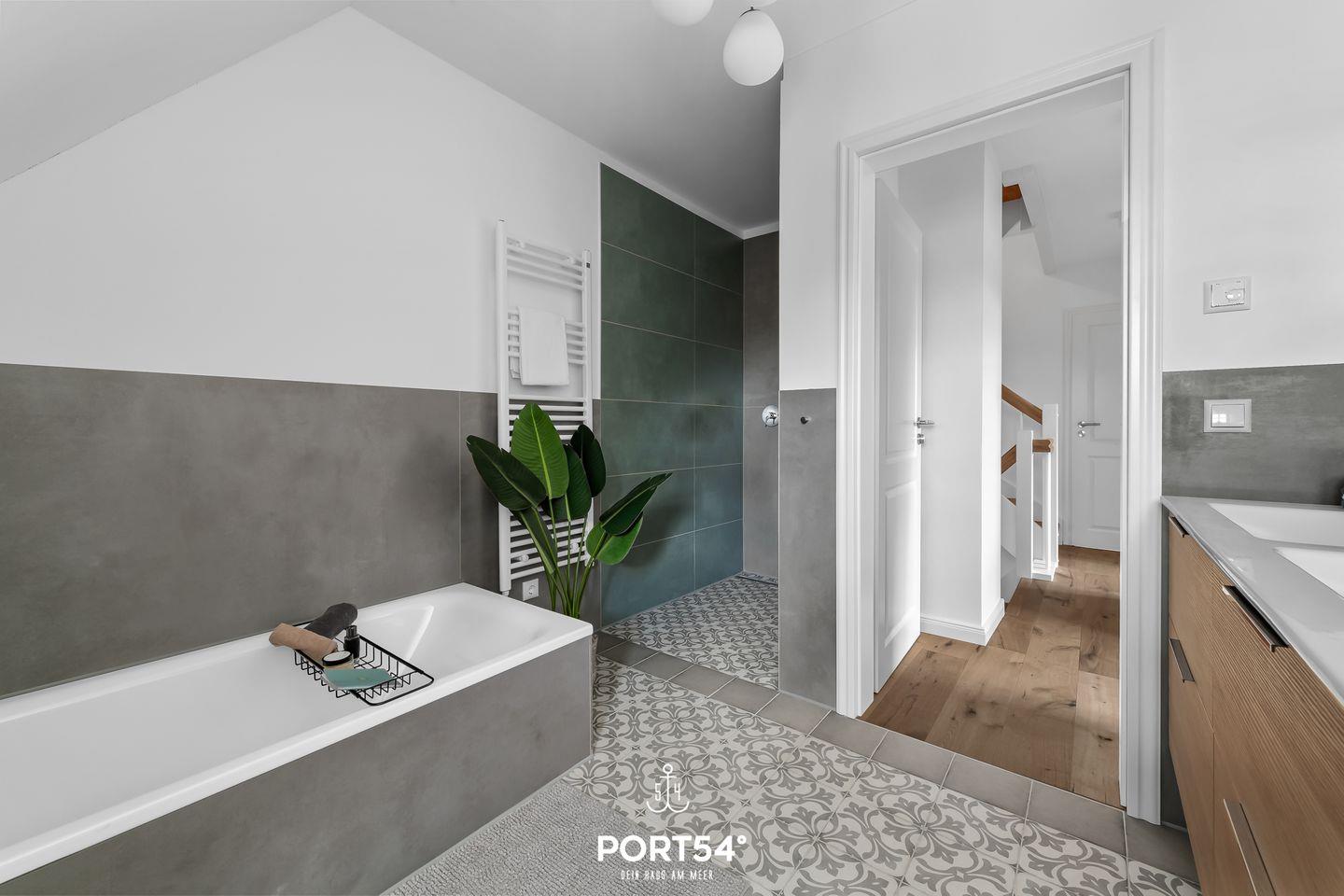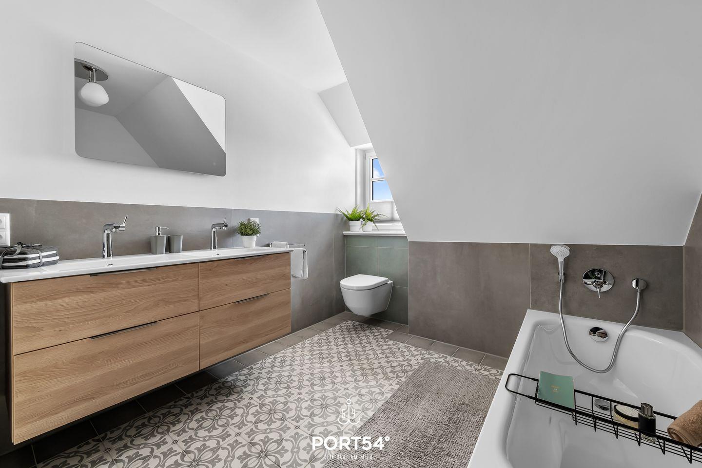 Im ersten Obergeschoss erwarten Dich zwei Schlafzimmer, die jeweils mit einem Doppelbett (je 160x200cm) und einem Kleiderschrank ausgestattet sind. Hier erwartet Dich zudem das zweite Tageslichtbad mit ebenerdiger Dusche.