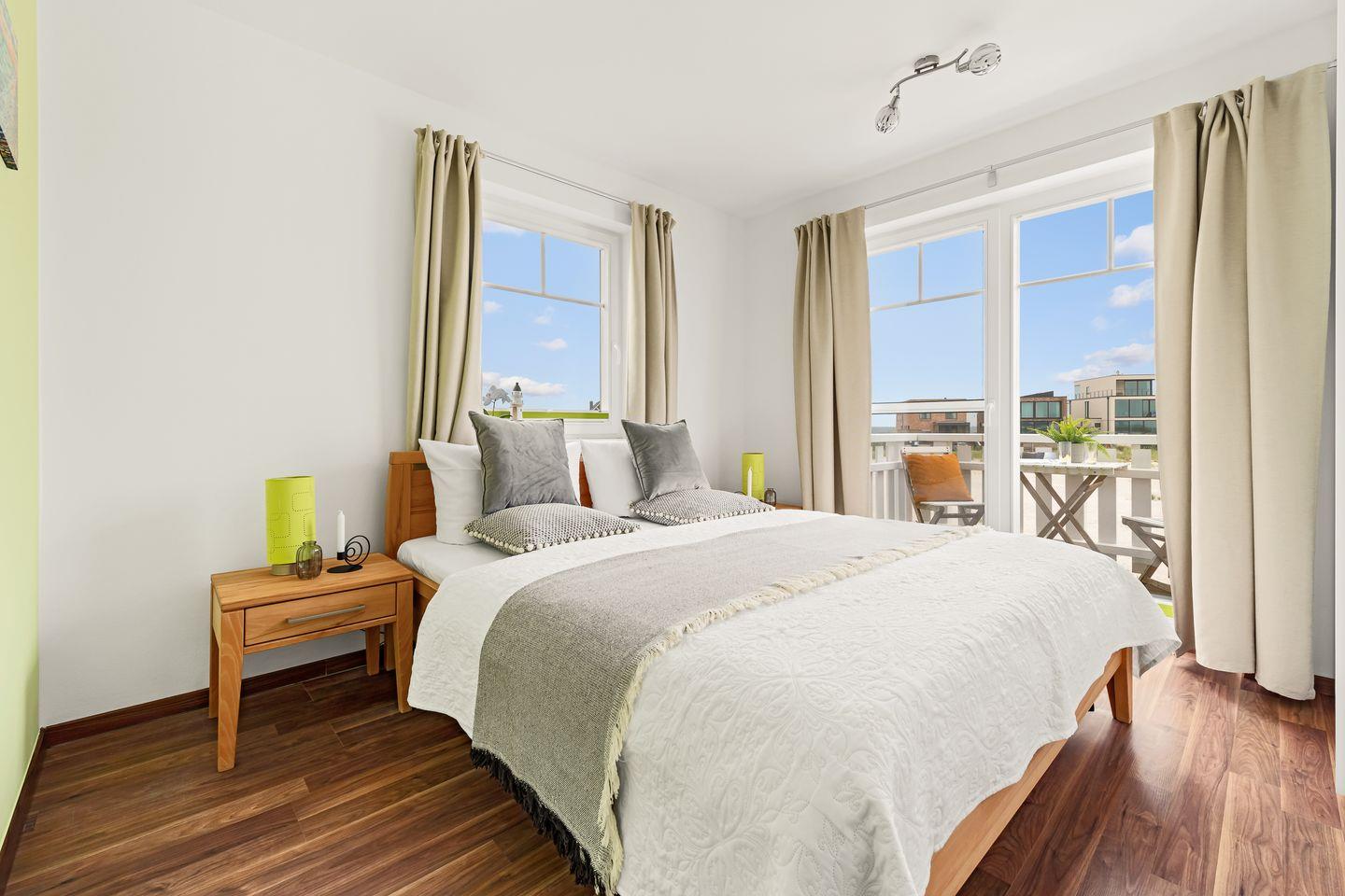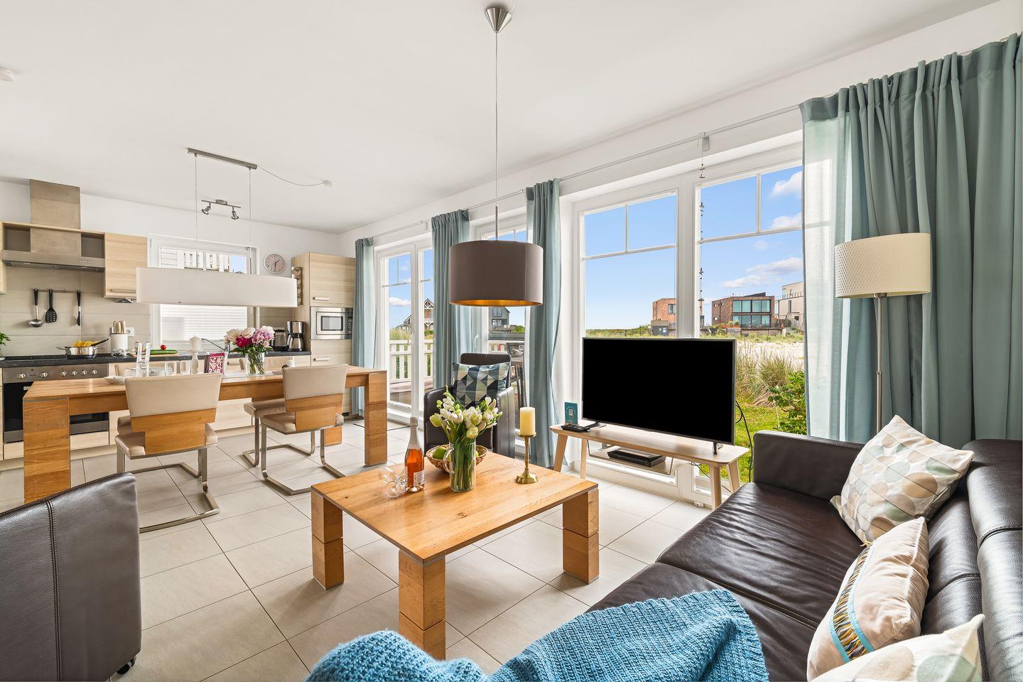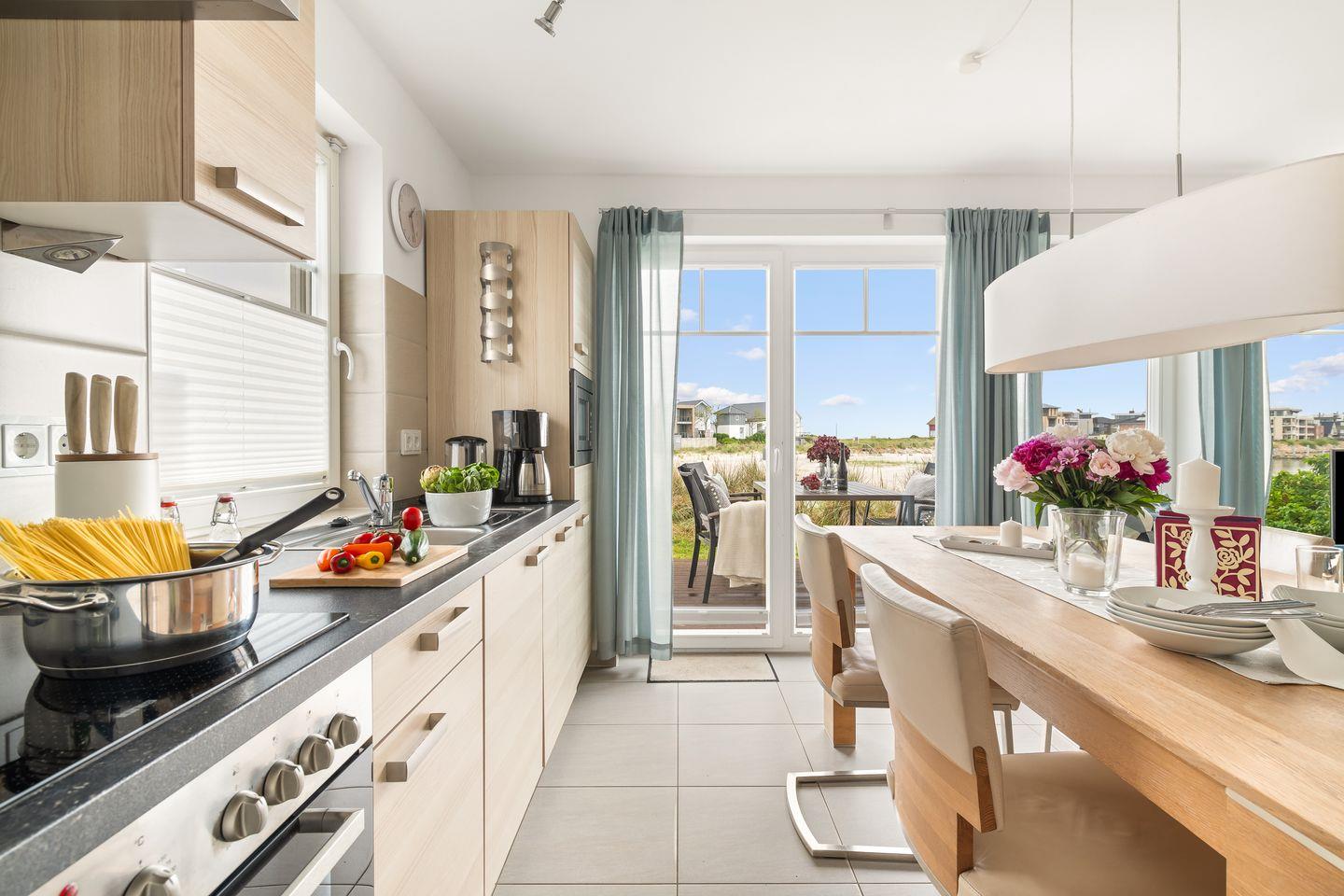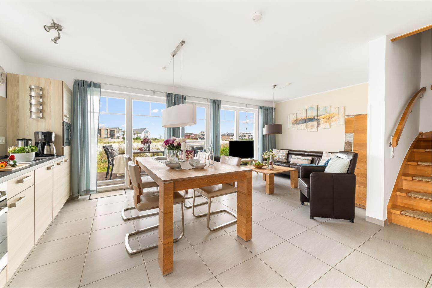 Das lichtdurchflutete Erdgeschoss des "Witthus 1" umfasst einen großzügigen Wohn- und Essbereich, der zum Mittelpunkt Ihres gemeinsamen Urlaubs wird. Die voll ausgestattete Wohnküche lässt keine Wünsche offen. Bodentiefe Fenster sorgen für viel Tageslicht und bieten direkten Zugang zur Sonnenterrasse am Yachthafen, wo Sie mit Blick aufs Wasser entspannen können. Ein Gäste-WC im Erdgeschoss bietet zusätzlichen Komfort.
