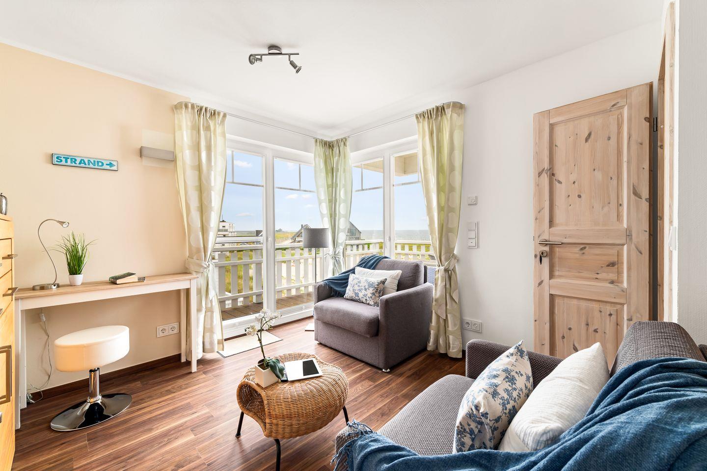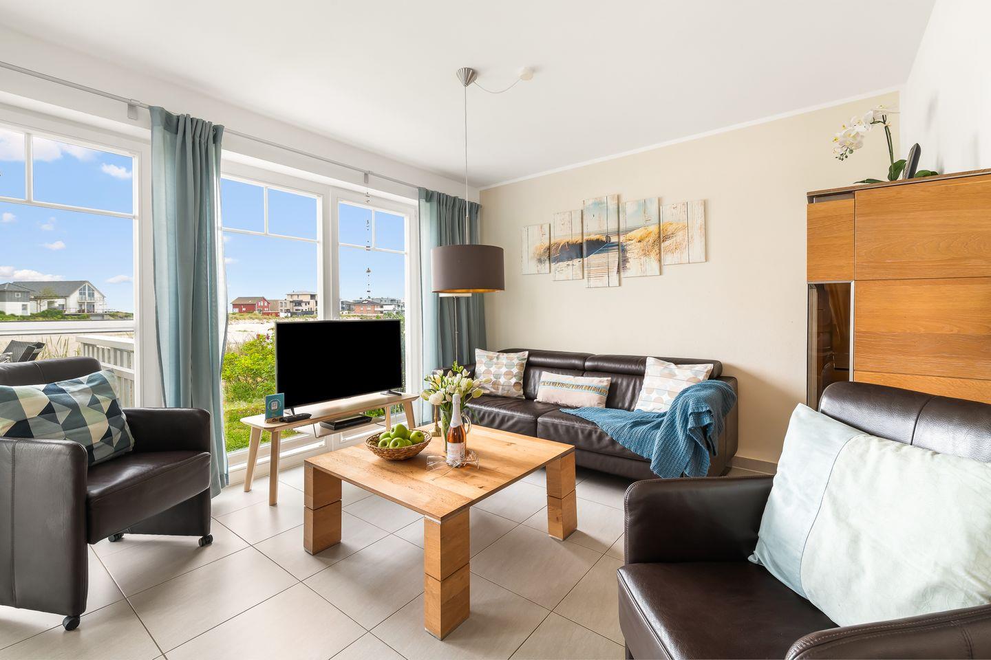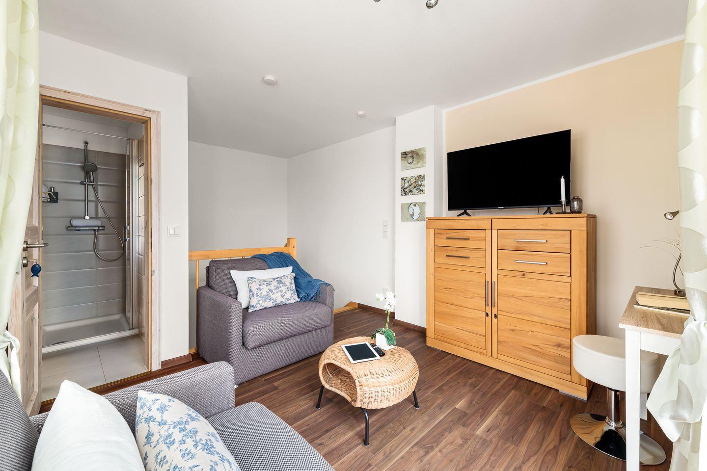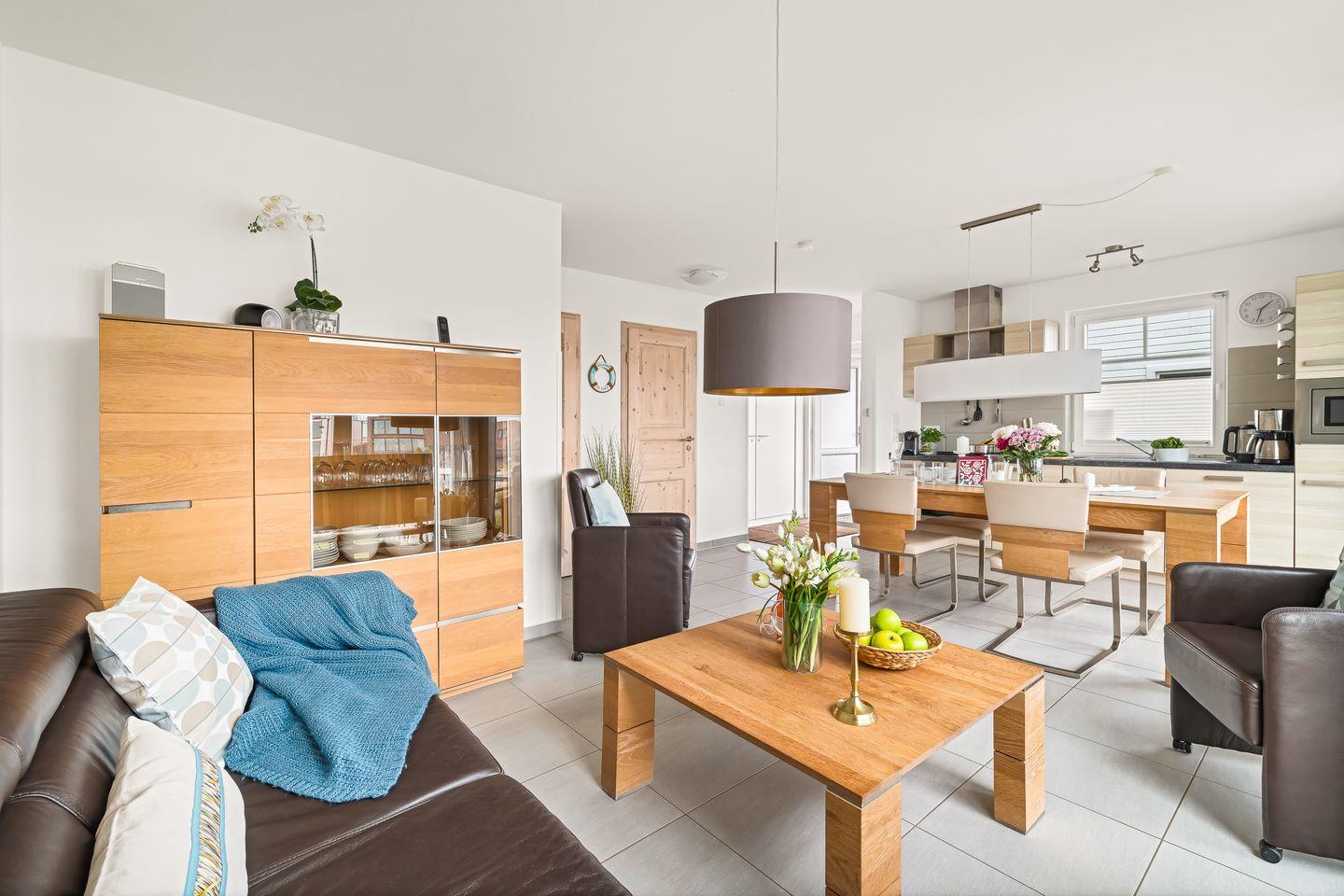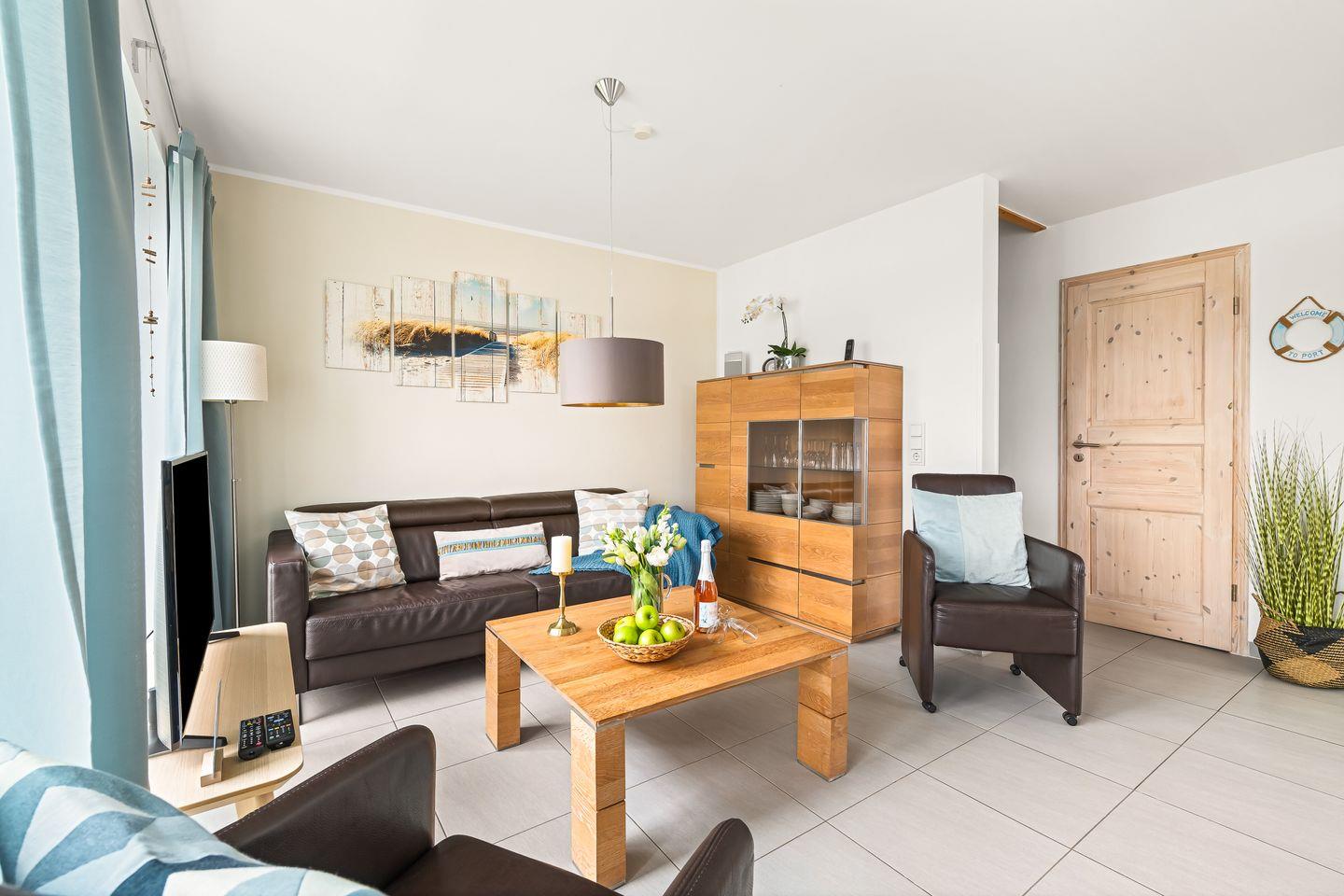 Das lichtdurchflutete Erdgeschoss des "Witthus 1" umfasst einen großzügigen Wohn- und Essbereich, der zum Mittelpunkt Ihres gemeinsamen Urlaubs wird. Die voll ausgestattete Wohnküche lässt keine Wünsche offen. Bodentiefe Fenster sorgen für viel Tageslicht und bieten direkten Zugang zur Sonnenterrasse am Yachthafen, wo Sie mit Blick aufs Wasser entspannen können. Ein Gäste-WC im Erdgeschoss bietet zusätzlichen Komfort.