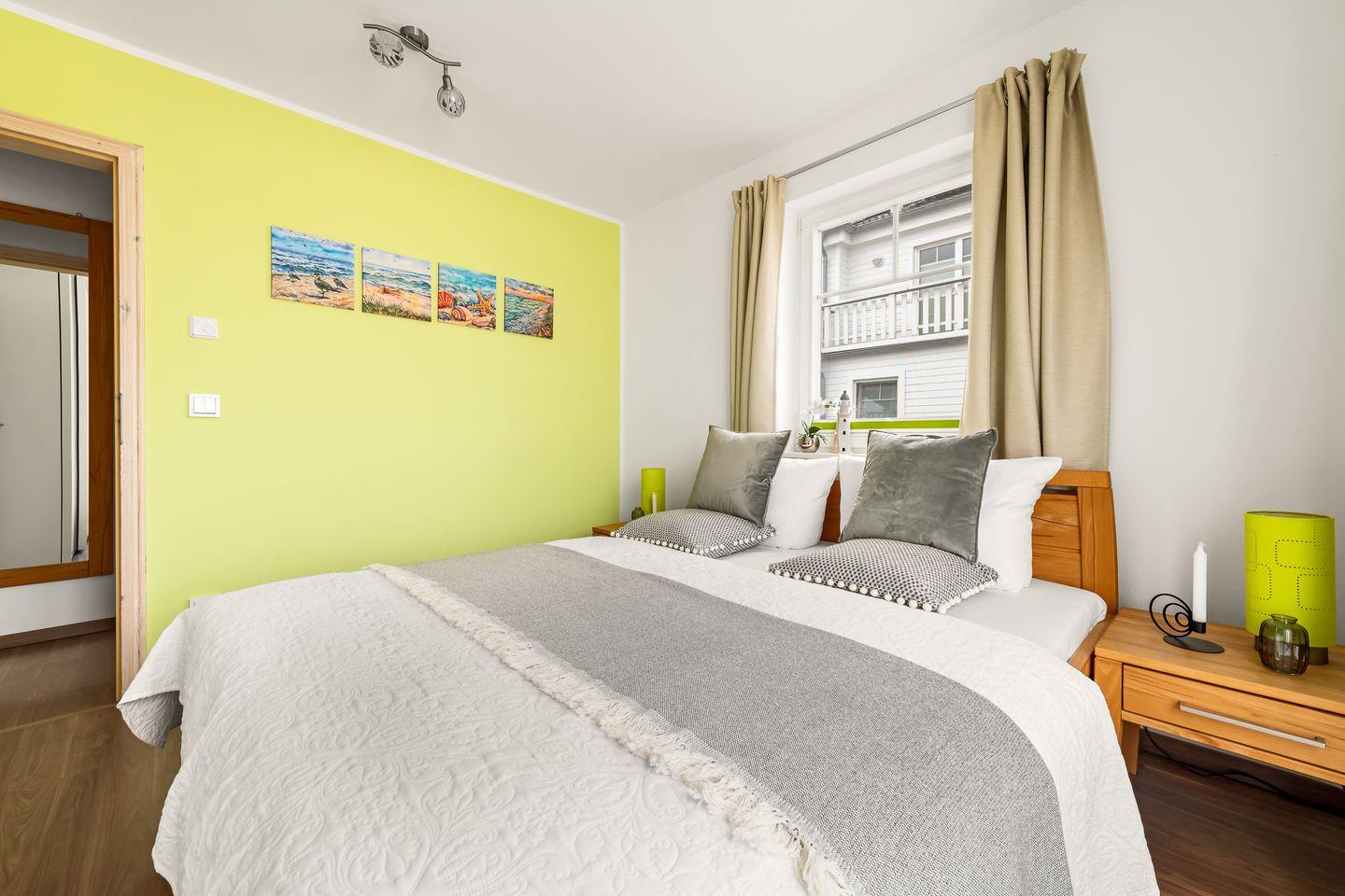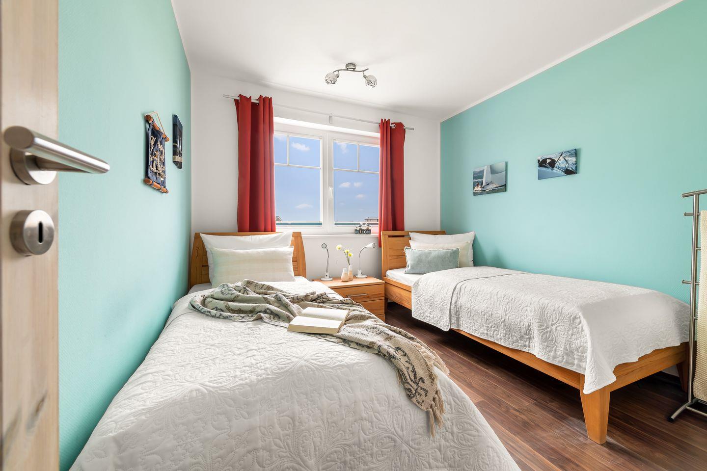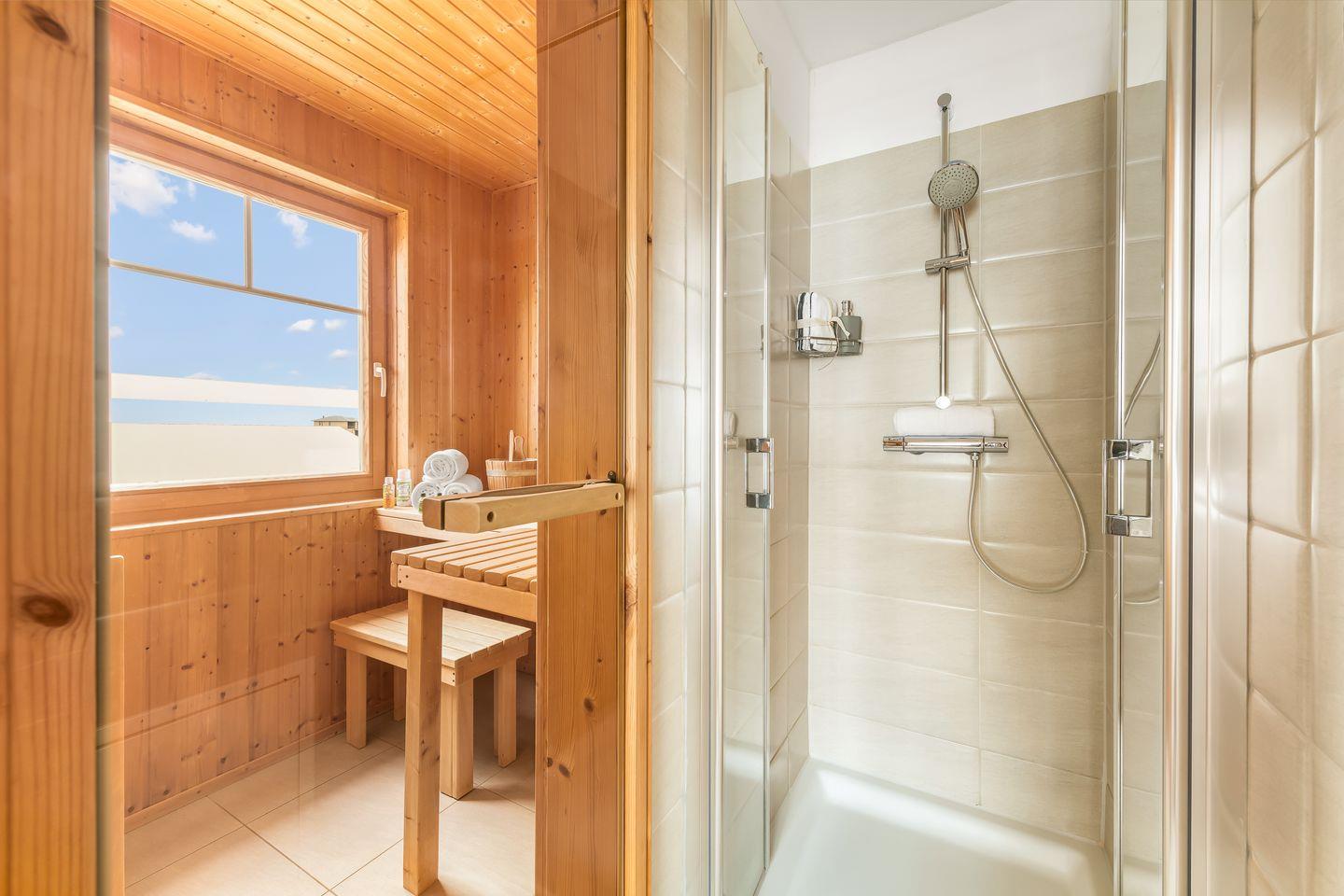 Im ersten Obergeschoss erwarten Sie zwei helle Schlafzimmer, eines mit zwei Einzelbetten und ein weiteres mit einem komfortablen Doppelbett. Das Badezimmer ist mit einer Dusche ausgestattet und die Sauna im Dachgeschoss macht auch weniger sonnige Tage zu einem entspannenden Erlebnis.