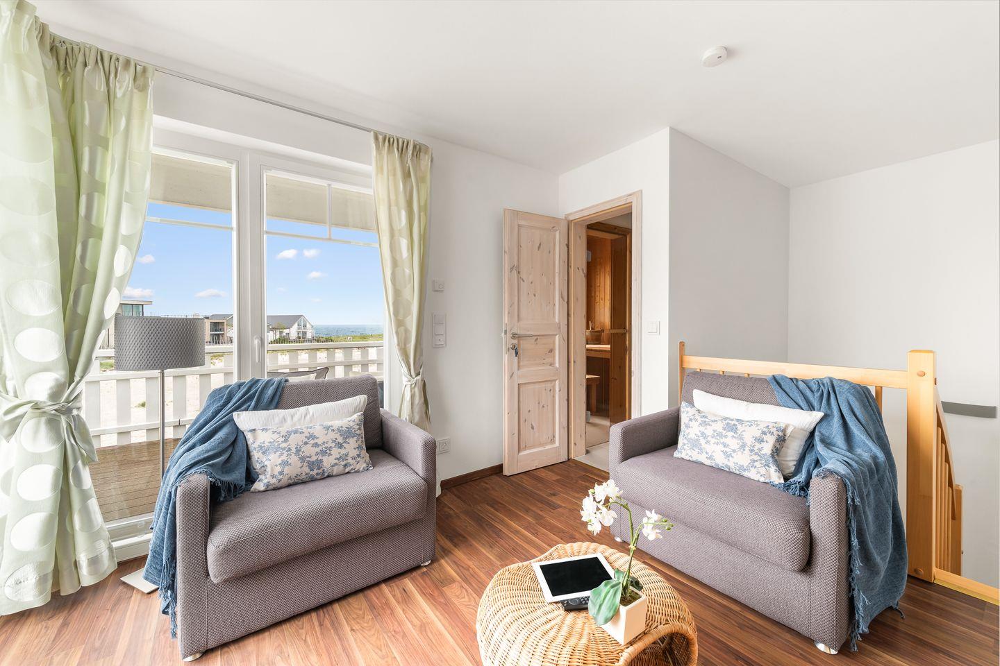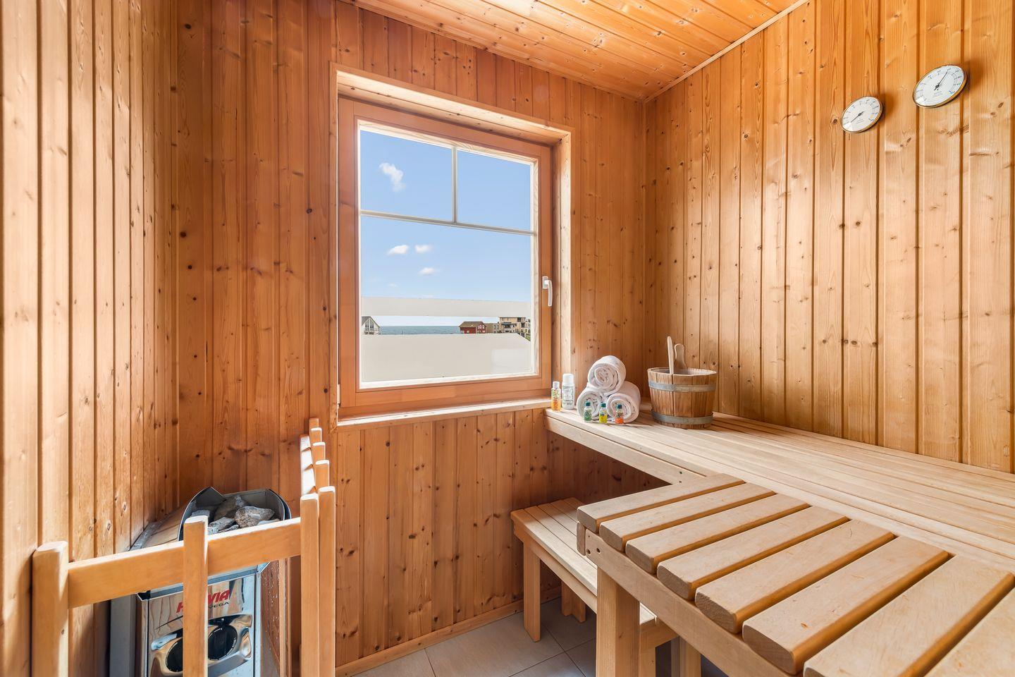 Die dritte Ebene des Hauses bietet einen gemütlichen Raum mit einem Schlafsessel und einem Schreibtisch, ideal für ruhige Stunden mit Blick aufs Wasser. Die finnische Sauna mit angrenzender Dusche und Wasserblick verwandelt Ihr Ferienhaus in eine private Wellness-Oase.