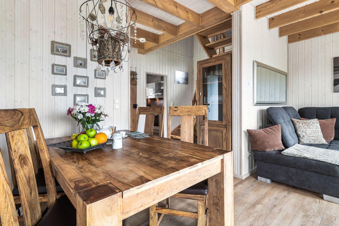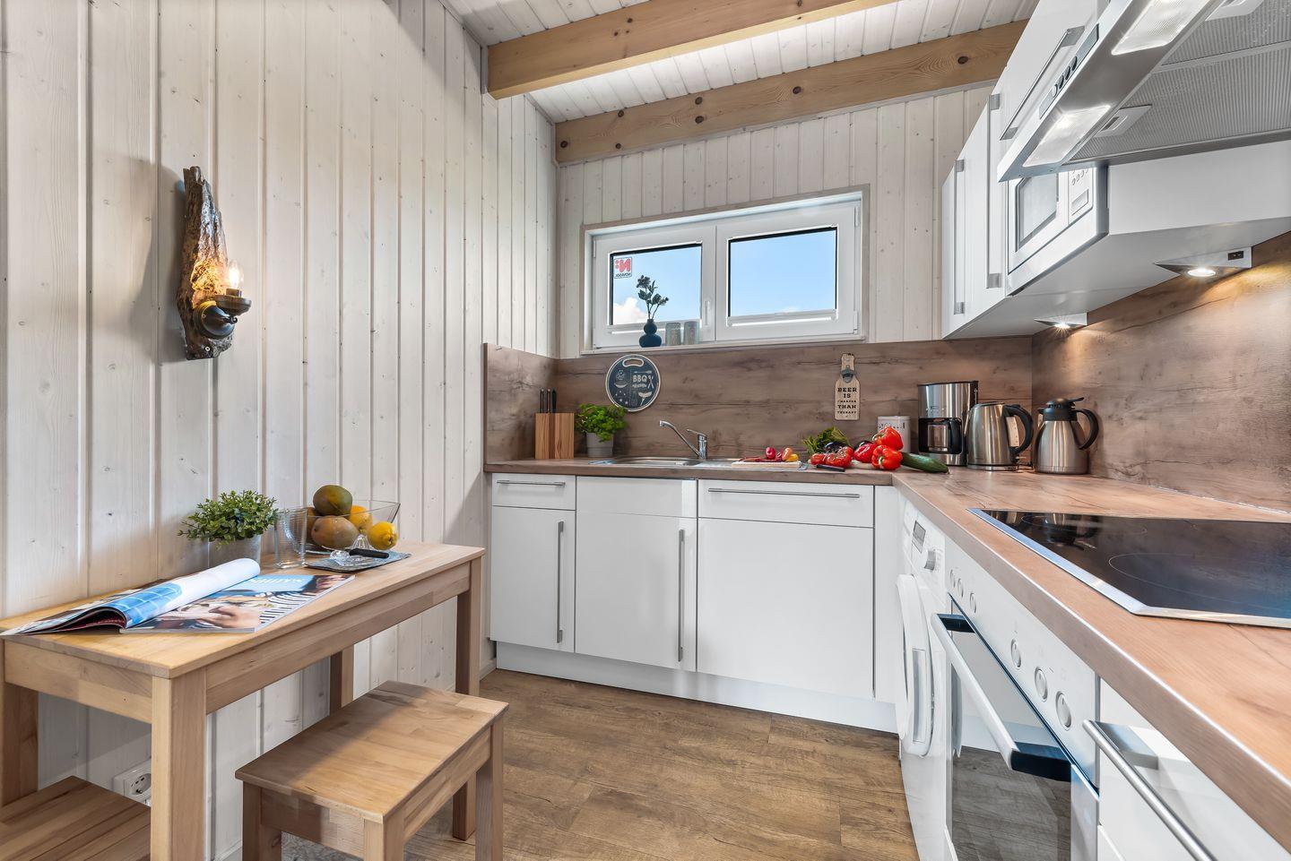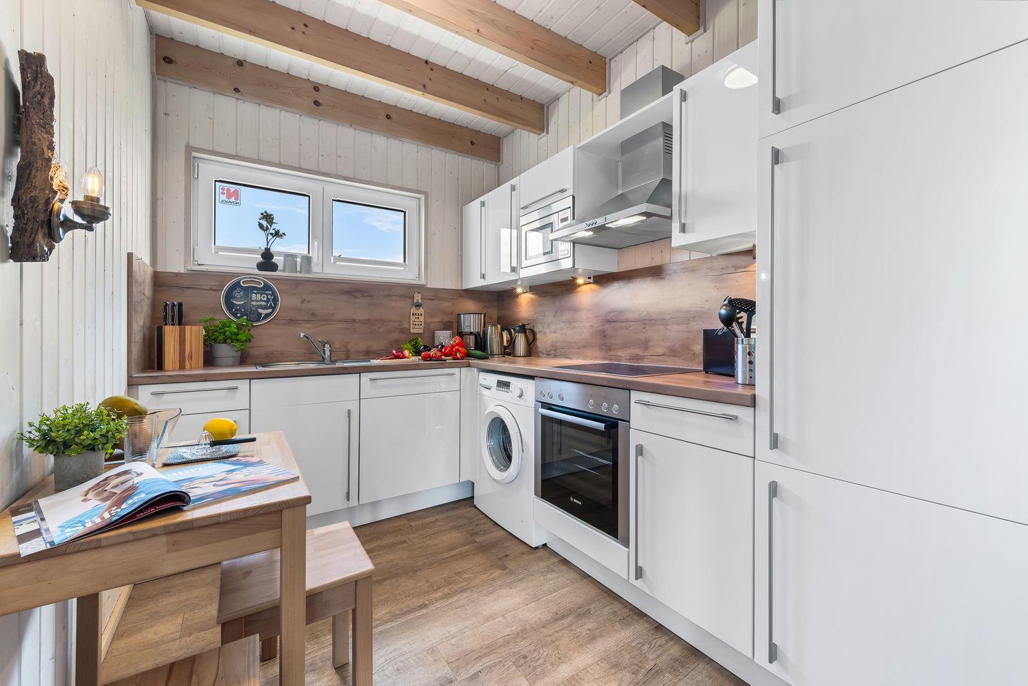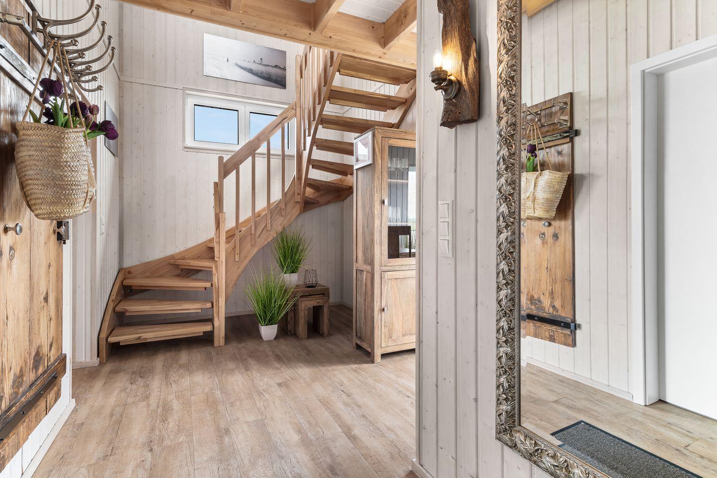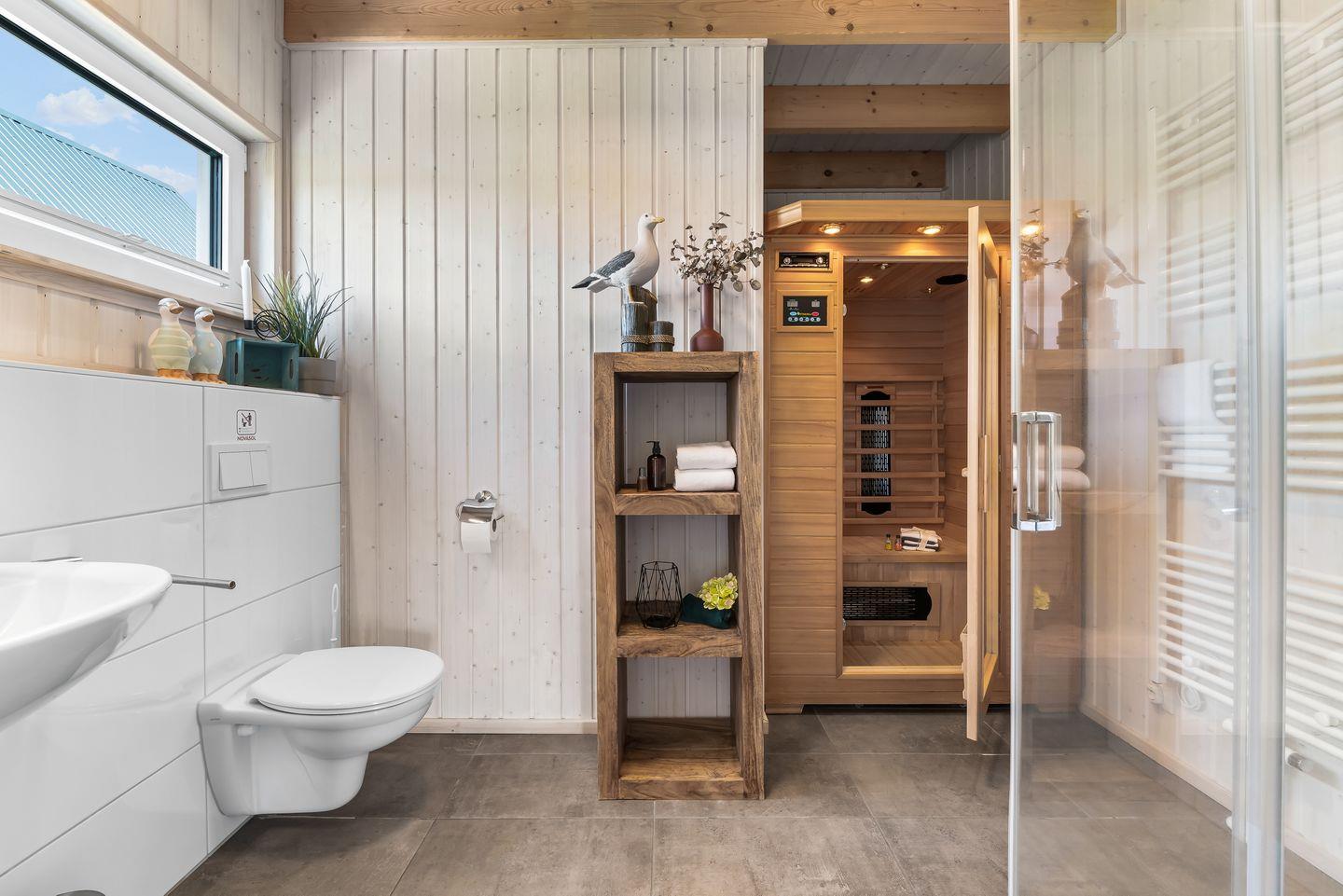 Empfangen werden Sie von einem großzügigen Entree im Erdgeschoss der "Strandlodge". Dort befindet sich auch der einladende Wohn-Essbereich mit einem Kamin, perfekt für gemütliche Abende. Die moderne Küche ist voll ausgestattet, inklusive Spül- und Waschmaschine für maximalen Komfort im Urlaub. Das Erdgeschoss beherbergt auch ein Badezimmer mit Dusche und einer privaten Infrarotsauna – ideal, um nach einem langen Spaziergang am nahegelegenen Strand zu entspannen.
