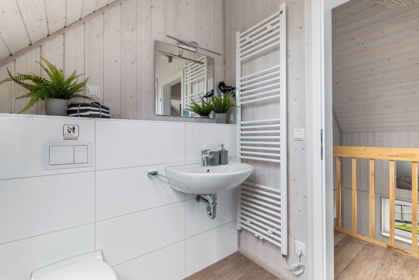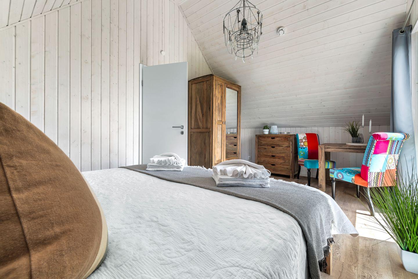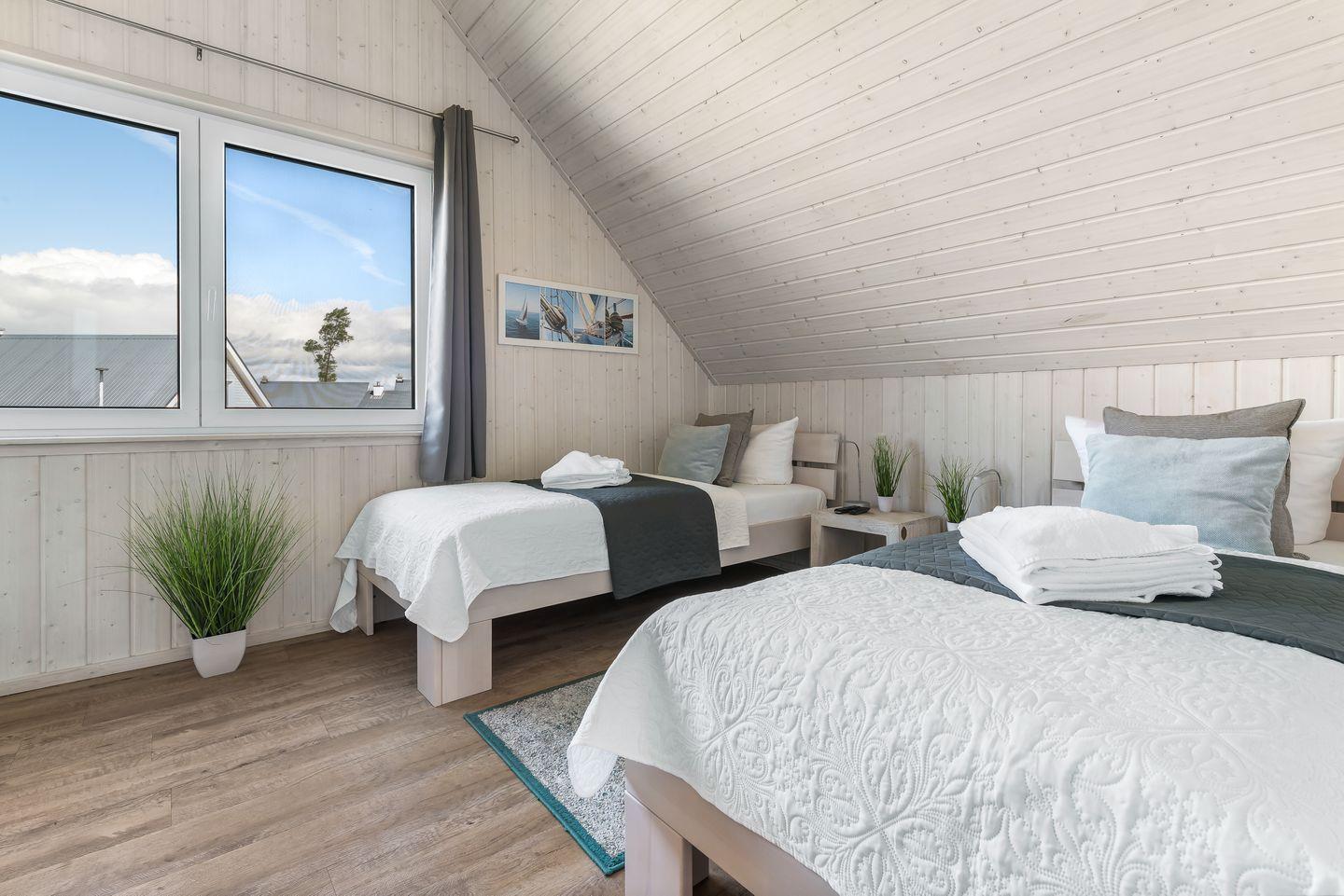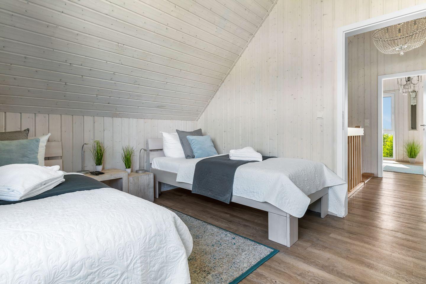 Die großzügigen Schlafzimmer im Obergeschoss mit bodentiefen Fenstern sorgen für ruhige Nächte. In einem davon sehen Sie vom Bett aus die Segelboote vorbeiziehen! Ein Schlafzimmer ist mit einem zweiten TV ausgestattet. Das Tageslichtbadezimmer mit Badewanne bietet zusätzlichen Komfort.