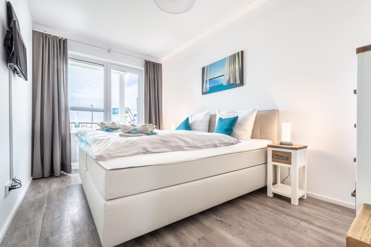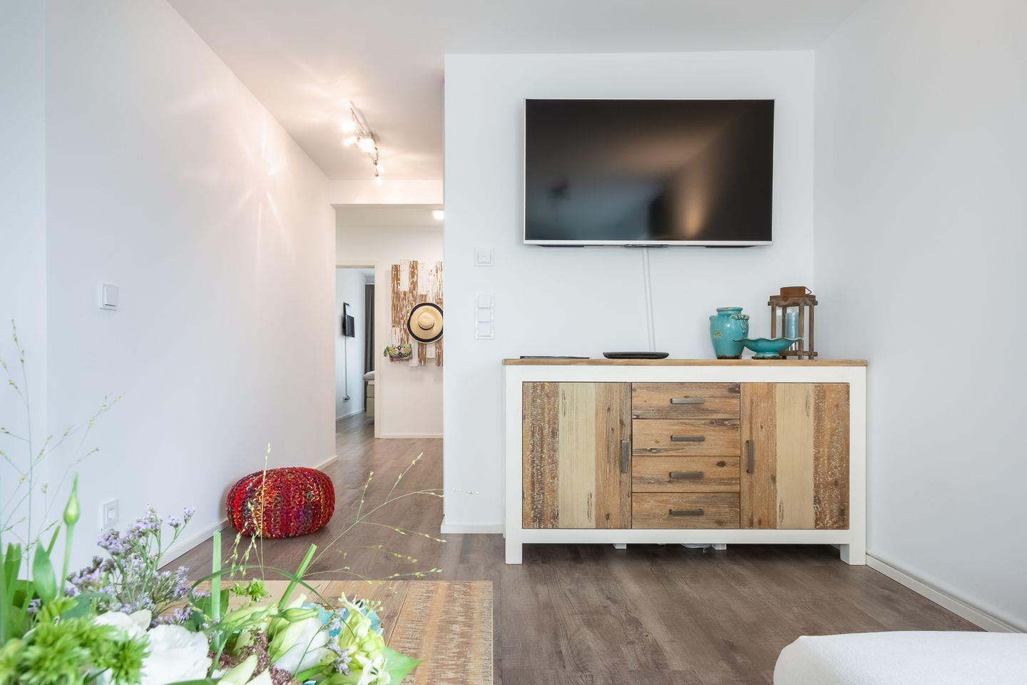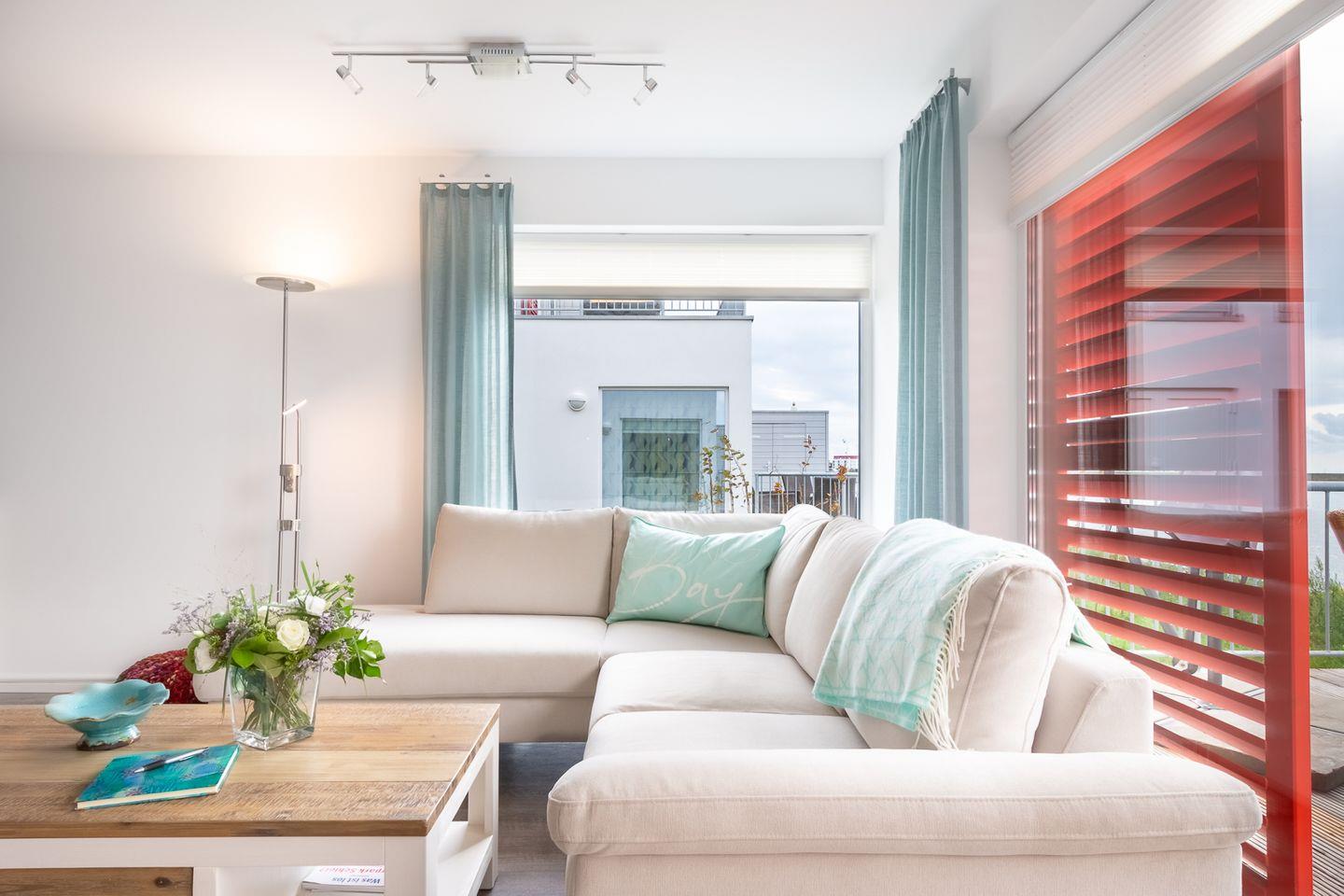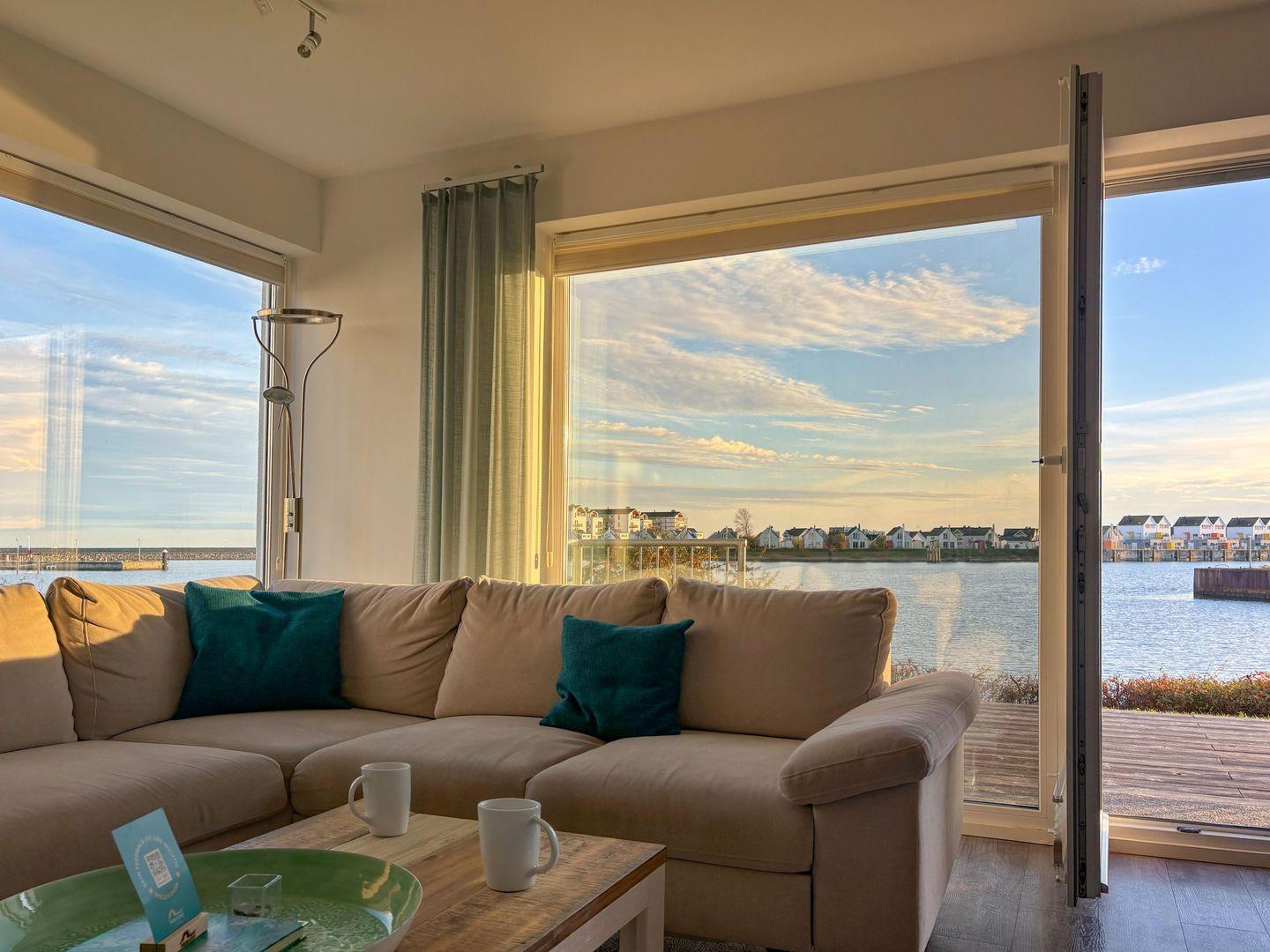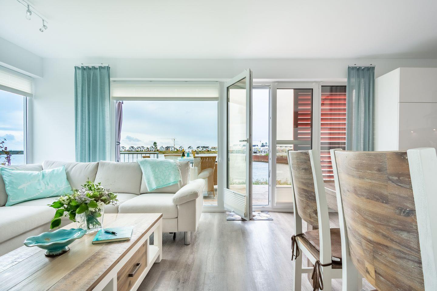 Moderne Ferienwohnung mit Sauna und Wasserblick im Ostseeresort Olpenitz, ideal für Strandurlaub und Hunde.