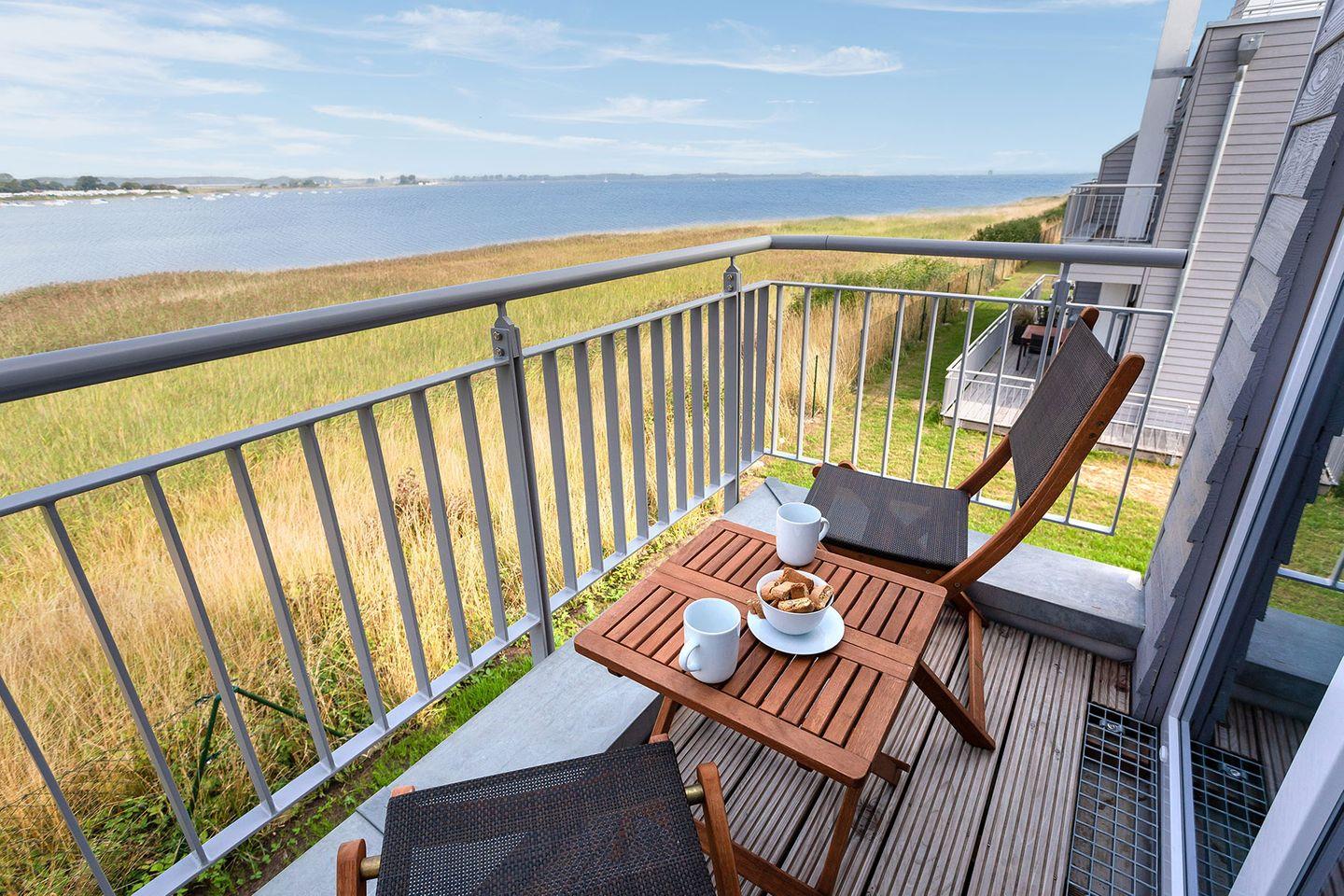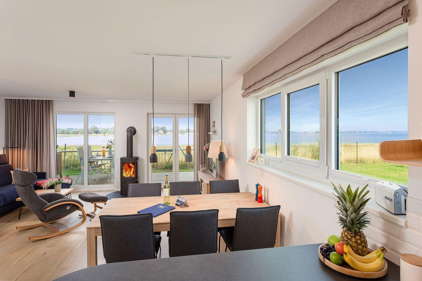 Ferienhaus Meerliebe in Kappeln bietet Ostsee- und Schleiblick, Sauna, Kamin, Dachterrasse und modernen Komfort direkt am Wasser.